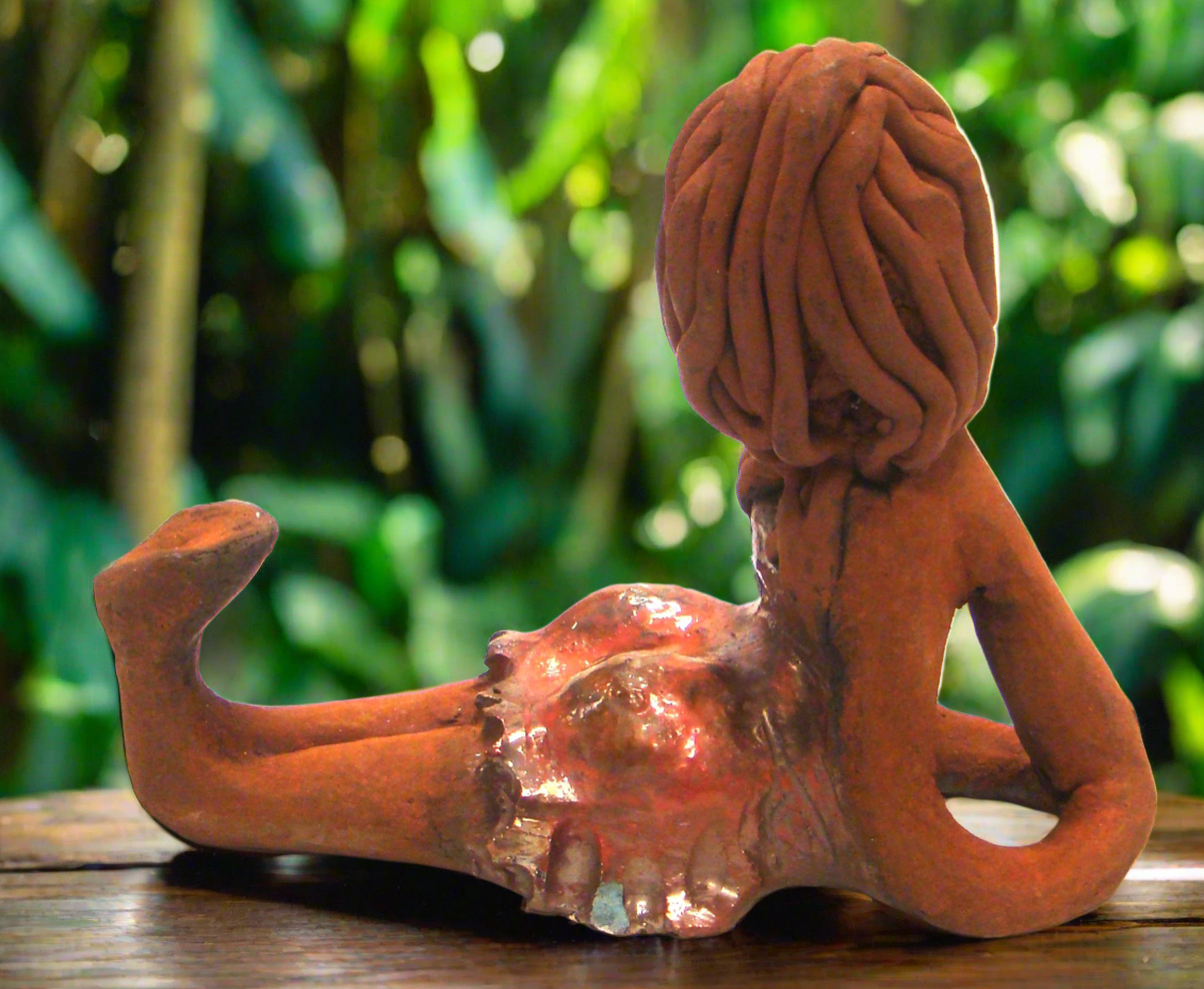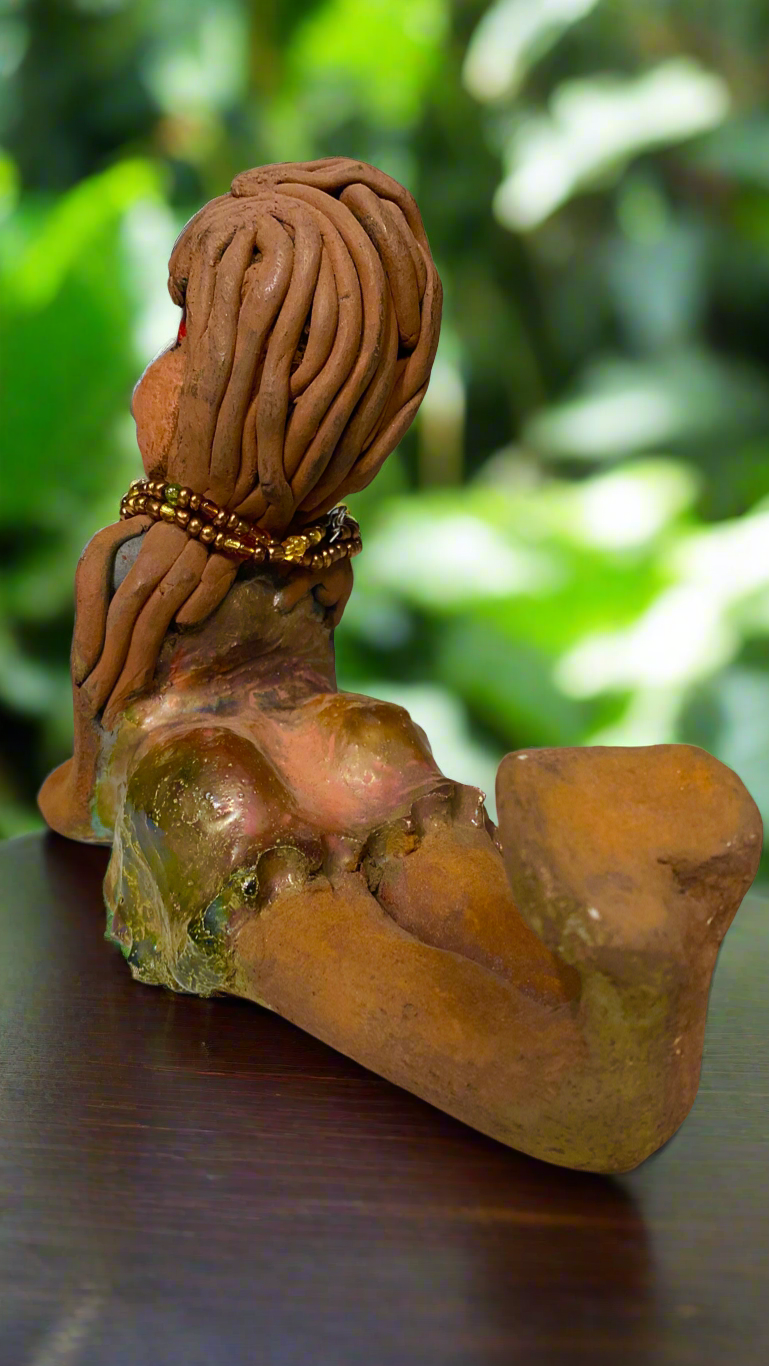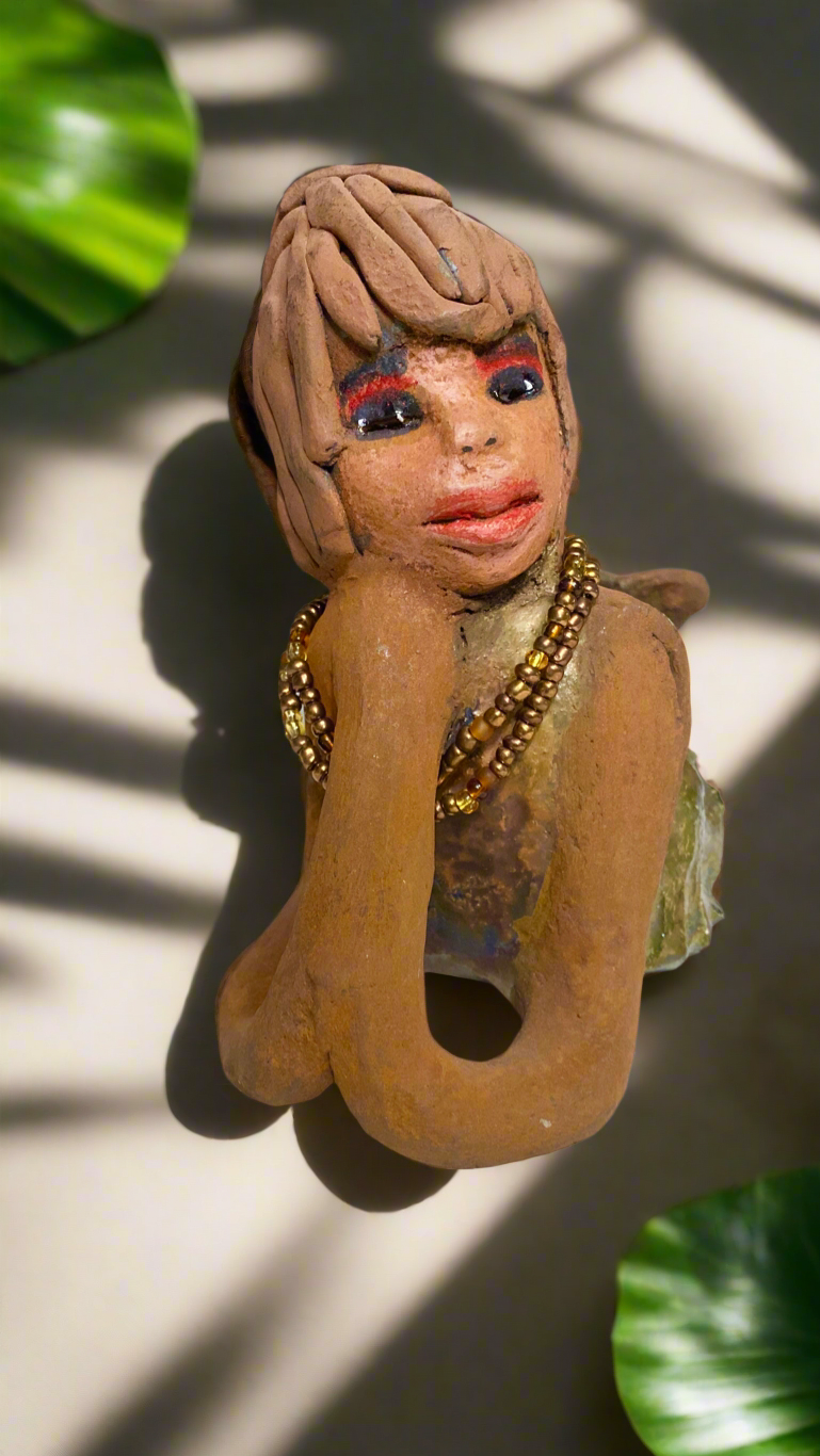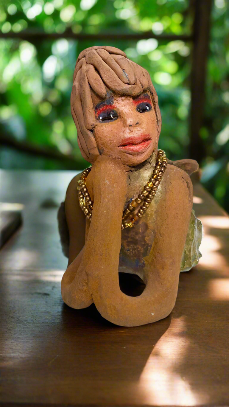 Ada stands 6" x 3.5" x 7.5" and weighs 1.11 lbs. She has a honey brown complexion and ruby red lips. Her long arms are beneath her face in an inviting pose. Ada's dress is glazed copper and her hair is made of clay. She is wide-eyed and ready to bring joy to her new home. If you have any questions, contact me anytime to chat.