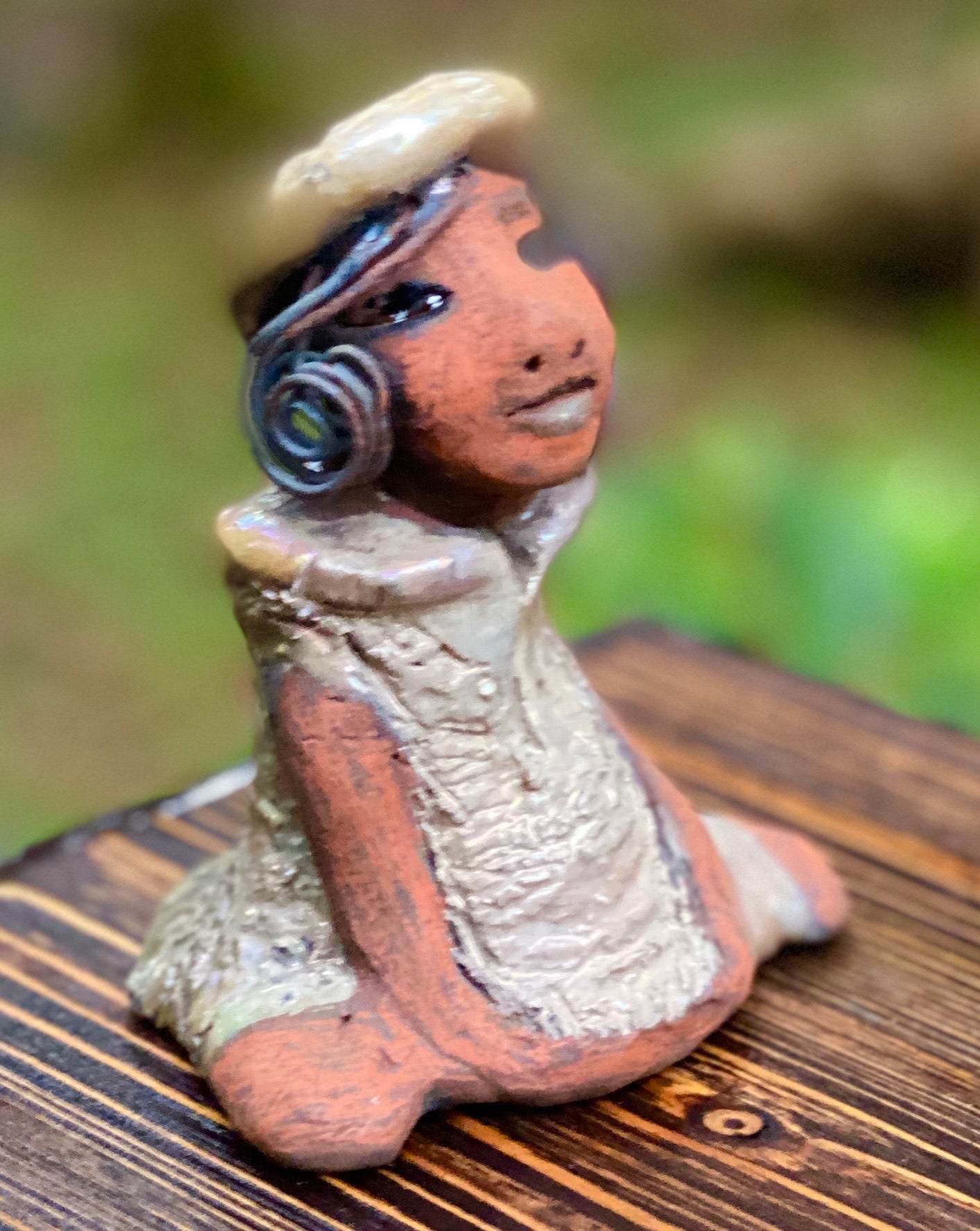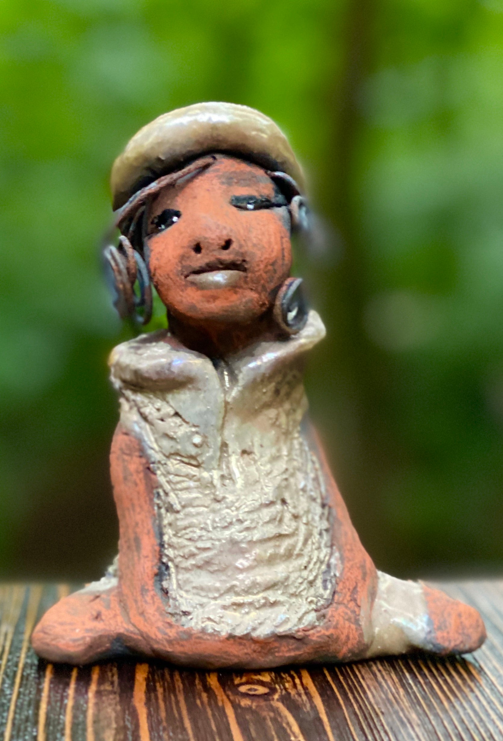 She features a gorgeous glossy gold dress, a headdress to match, and four feet of wire hair. Seated in a yoga pose, her arms rest gently by her side. Questions? Just ask!