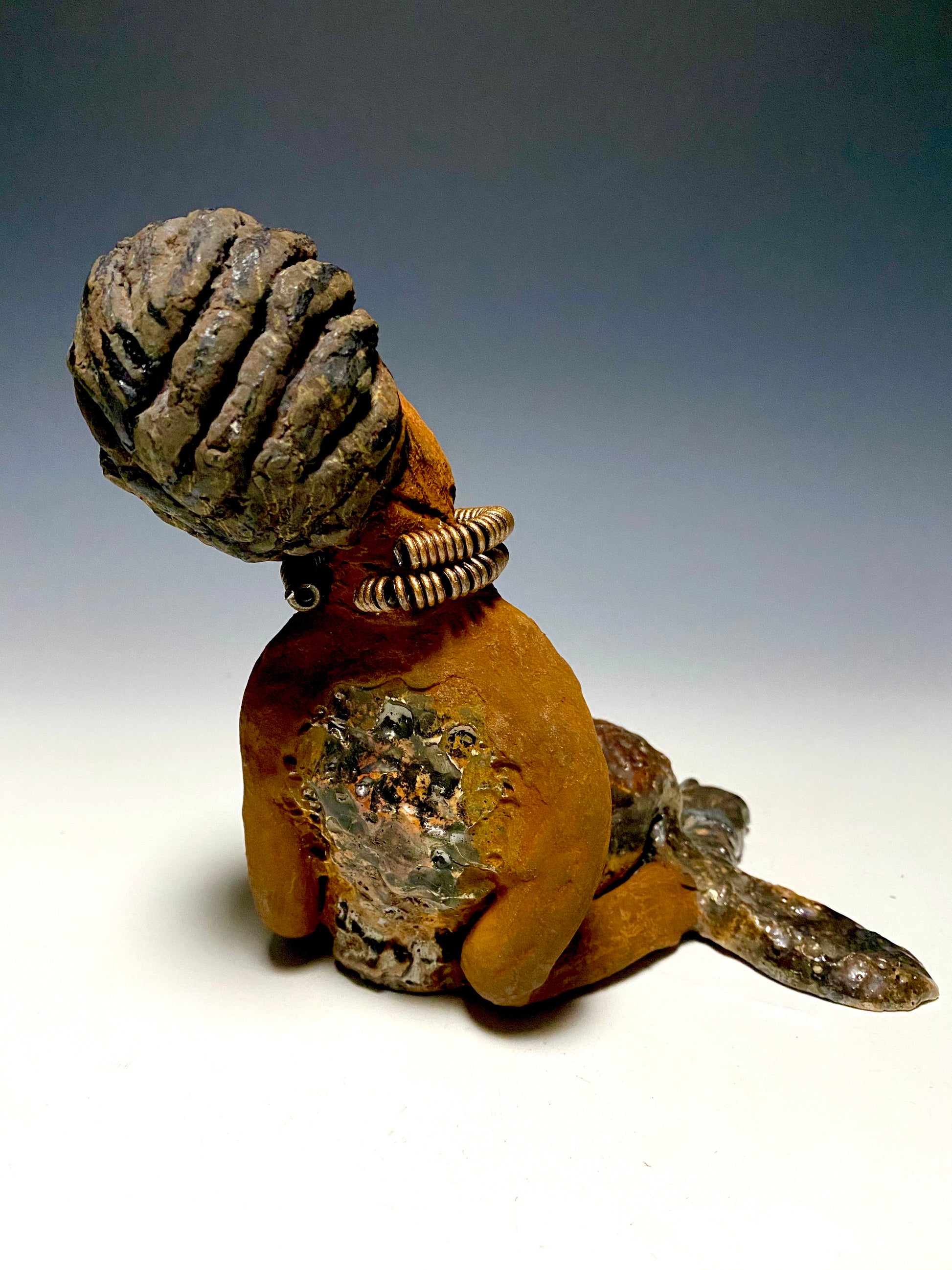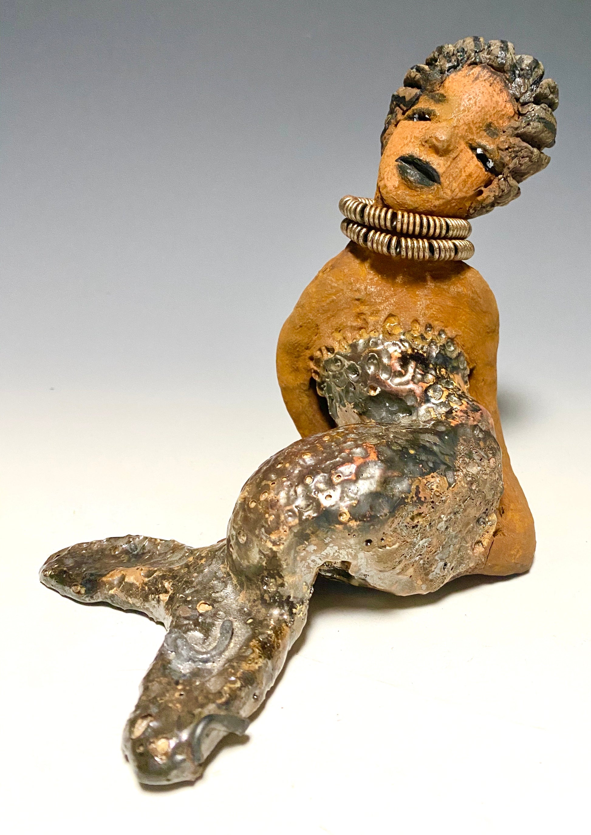 "Honestly, I can not explain where this desire to make mermaids come from. When I created my first raku fired mermaid, I was amazed at how well my homemade metallic copper green glaze worked with the mermaid's body suit. It was a good match with the honey brown complexion I use with most of my sculptures".