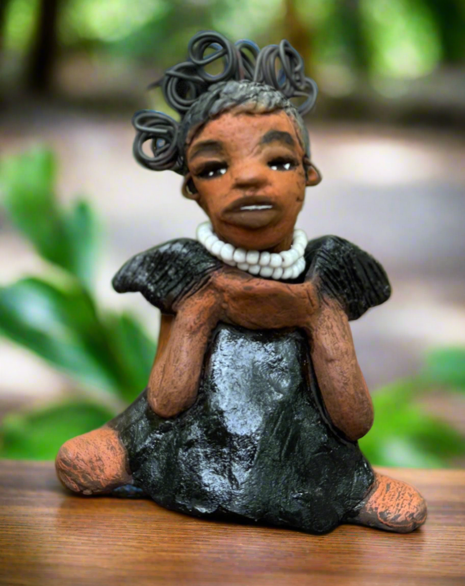 Say hello to Ama, the daring figurine standing at 5" x 4" x 3" and weighing a mere 10 ozs. Adorned in a striking black dress and with her coiled hair as her crown, Ama exudes boldness with a birth mark and bravery as she sits in a yoga pose, radiating curiosity. Embark on an adventure with the Herdew Collection and feel the exhilaration of free shipping and our customer-friendly return policy. Don't let this unique piece slip away!