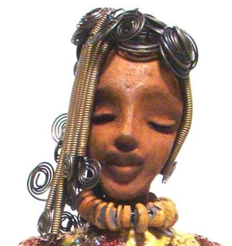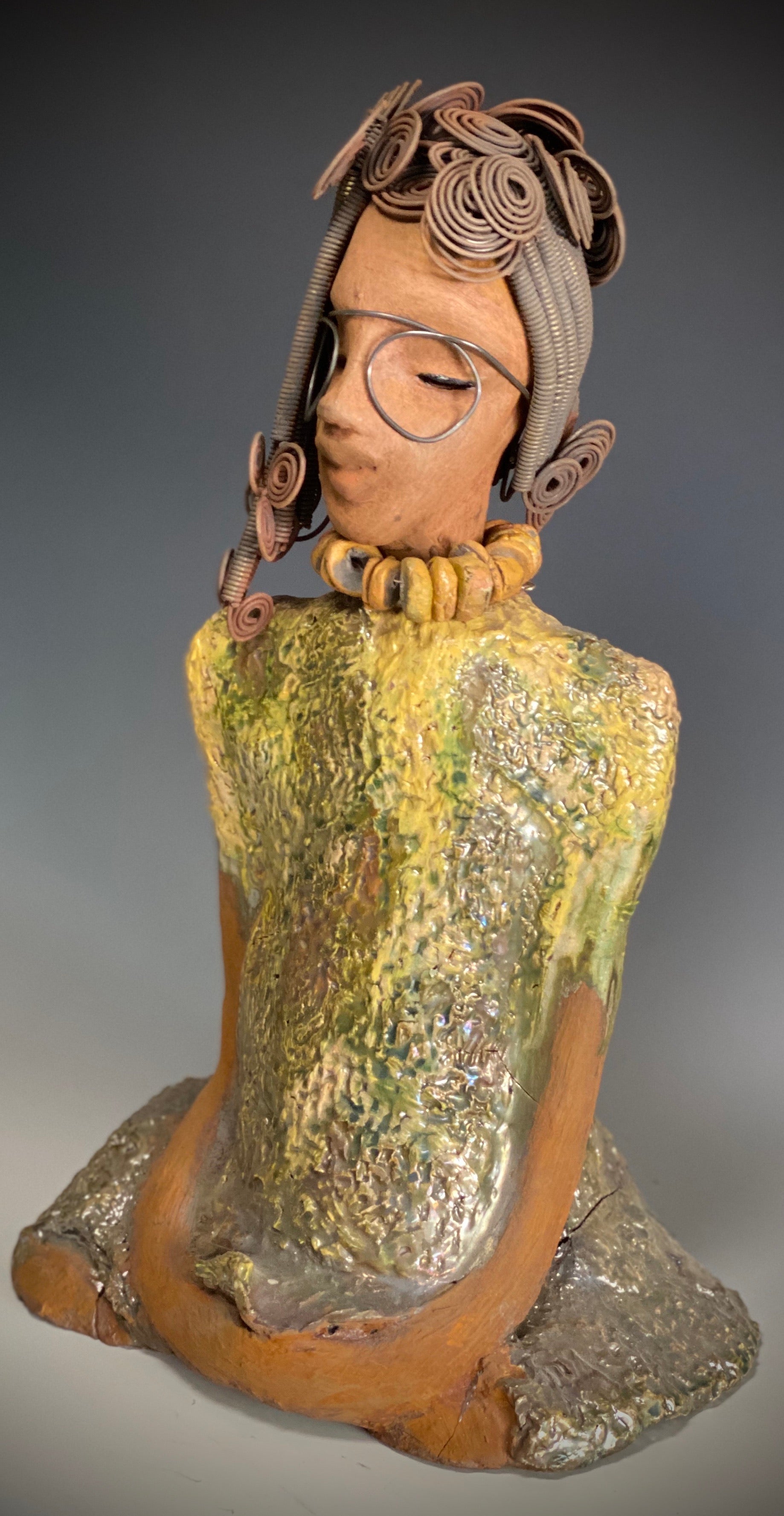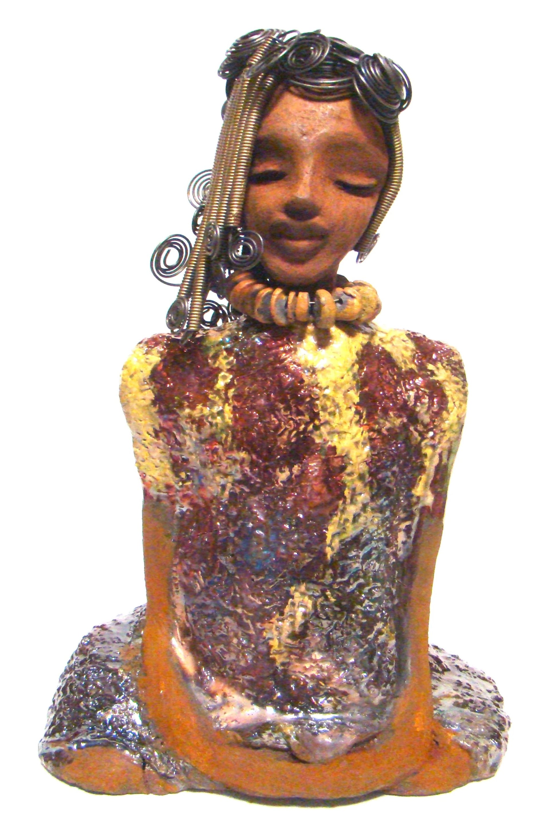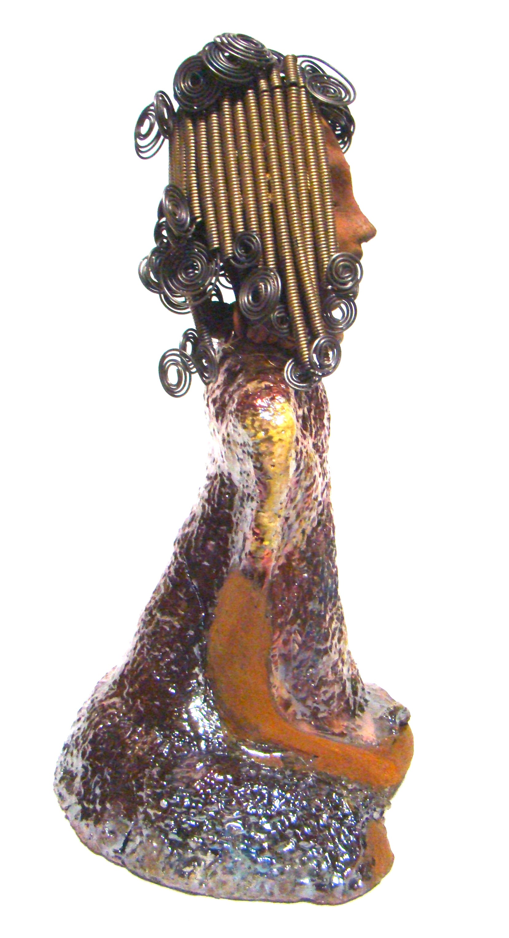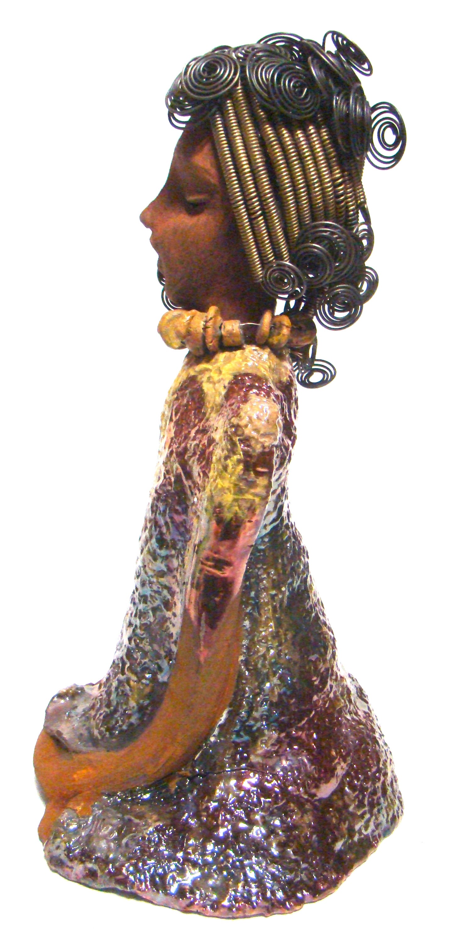She wears a raku fired copper yellowish dress with a large yellow- brown beaded necklace.