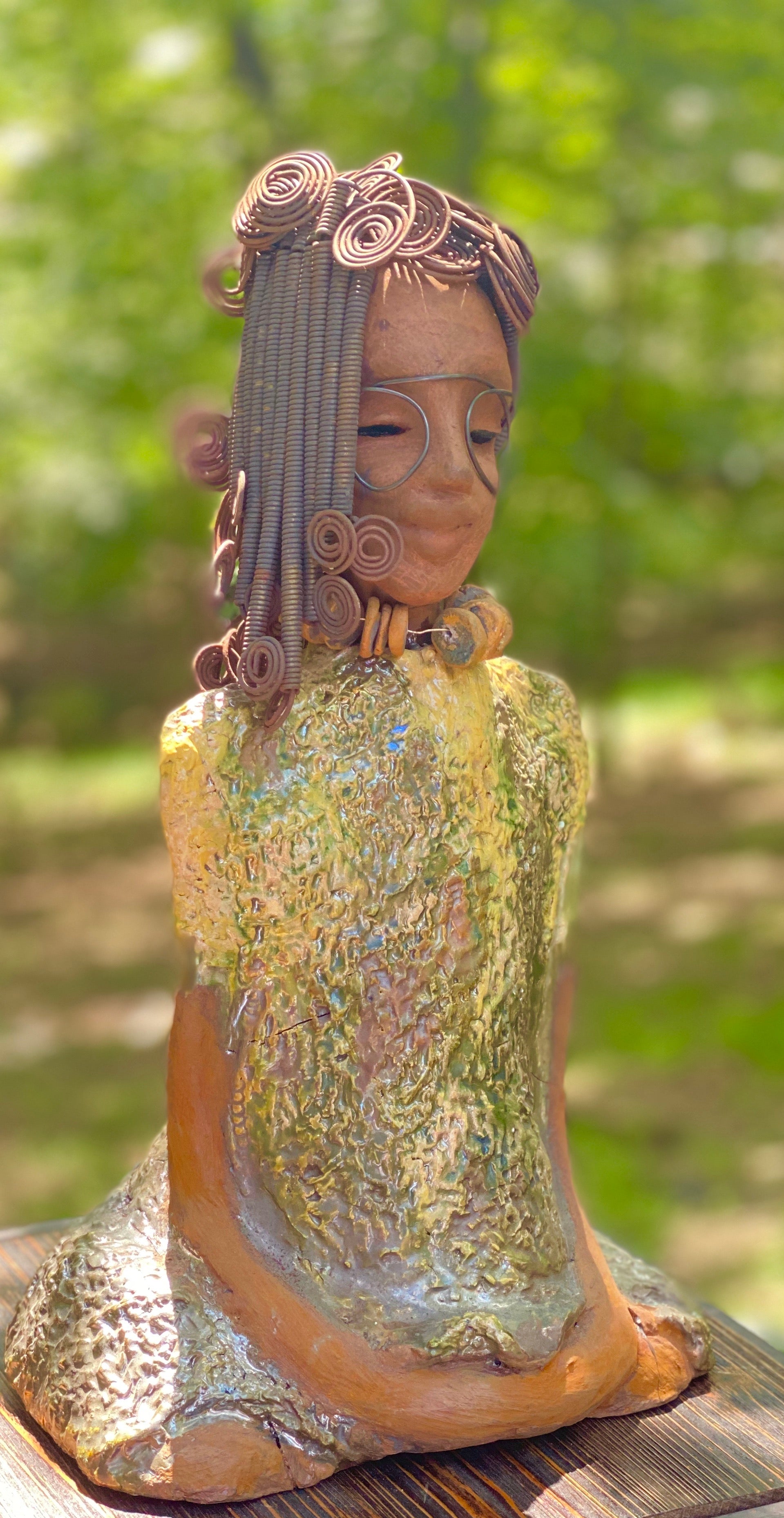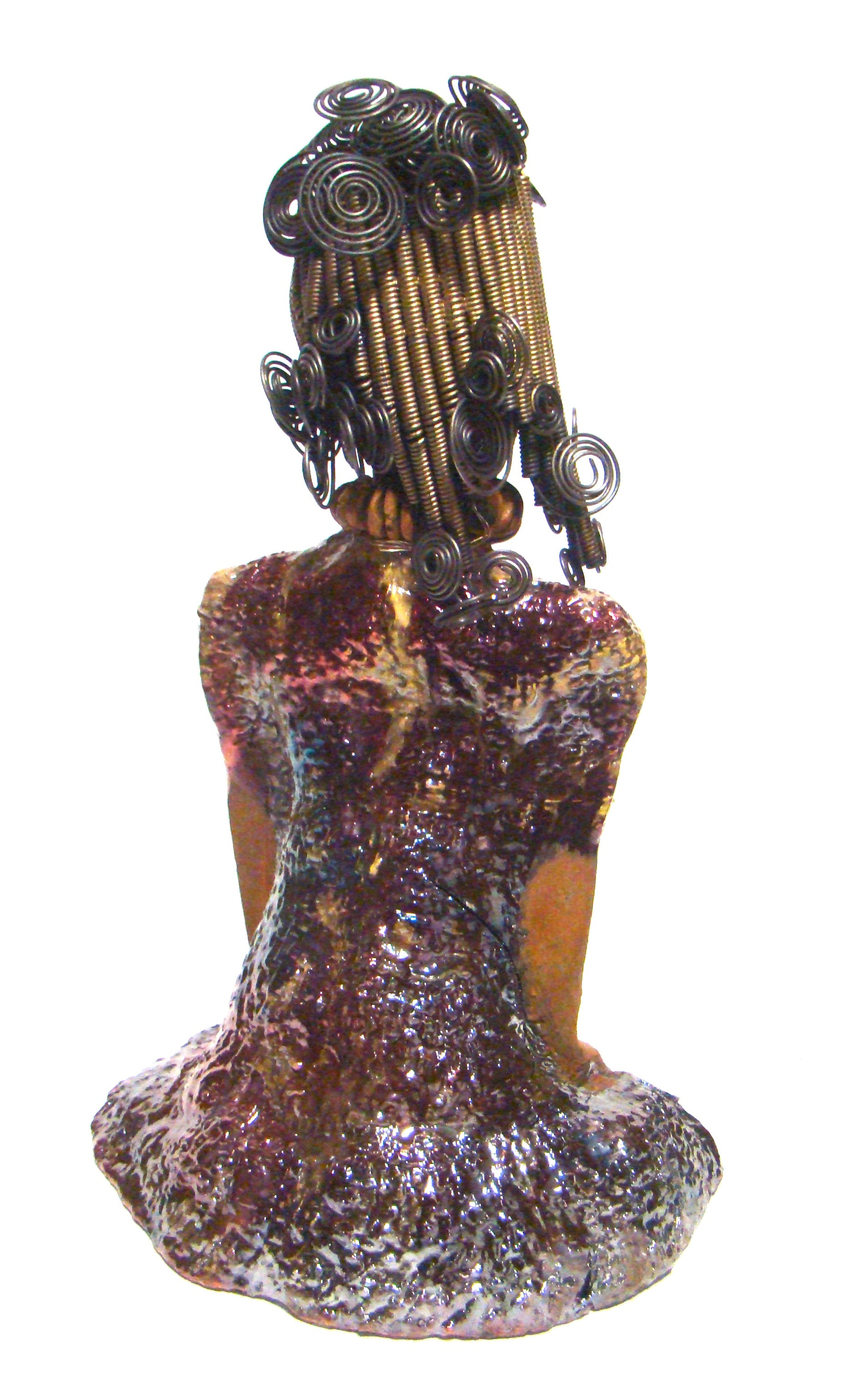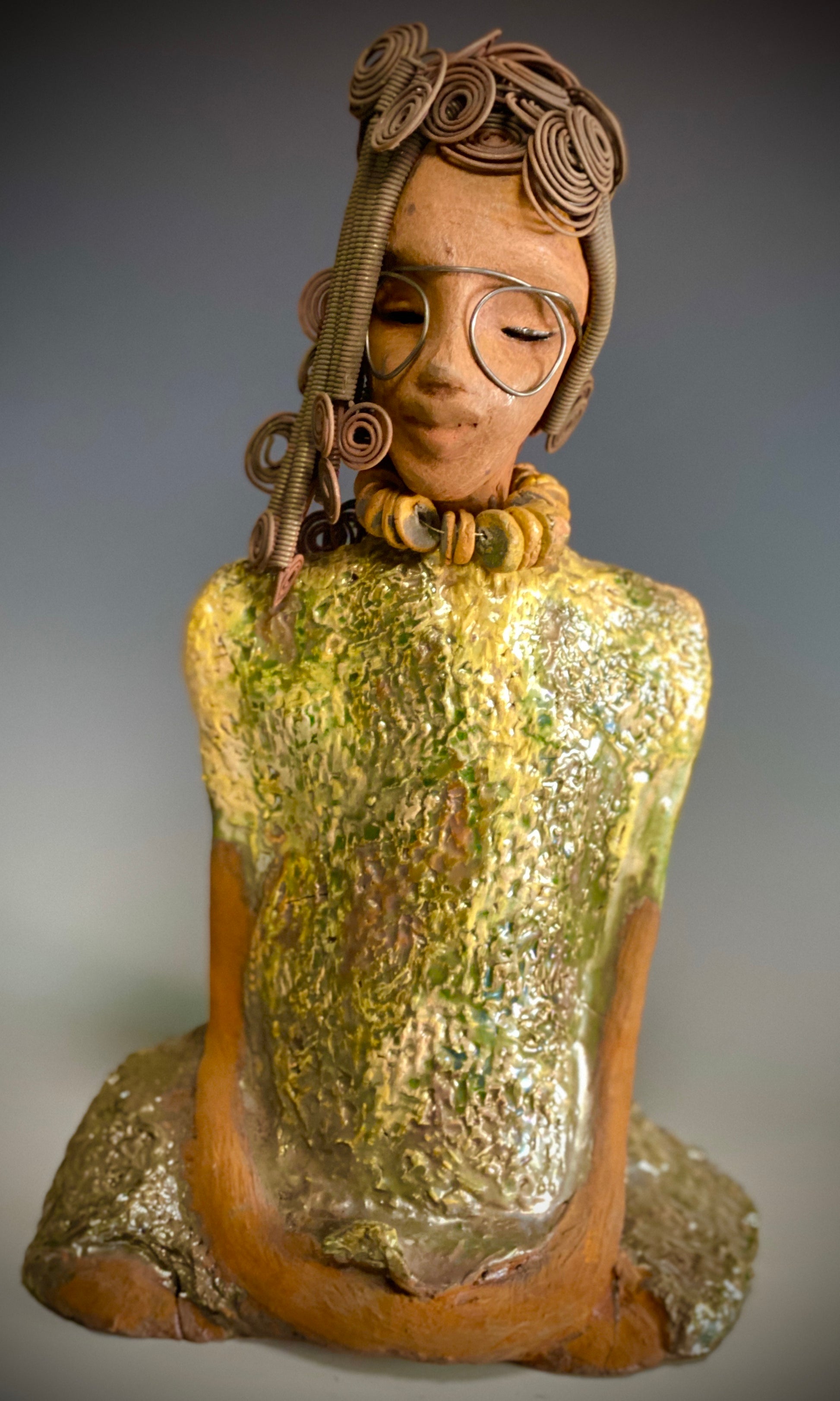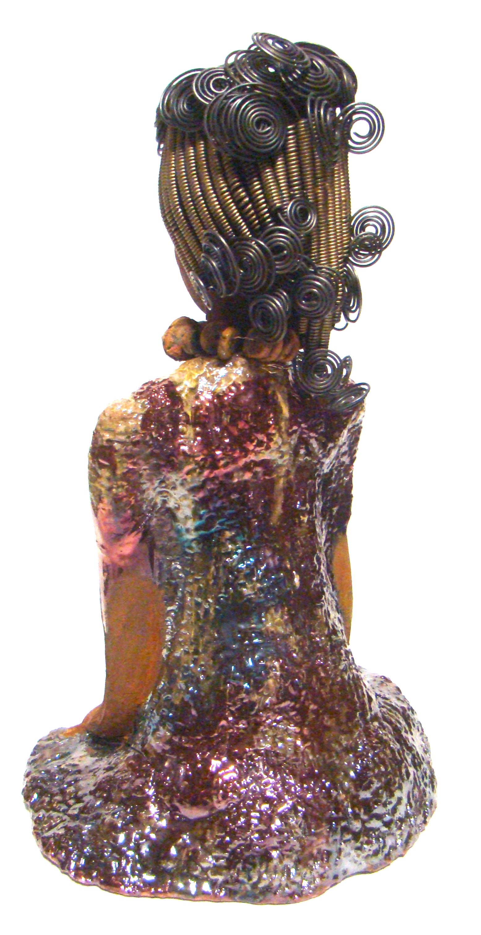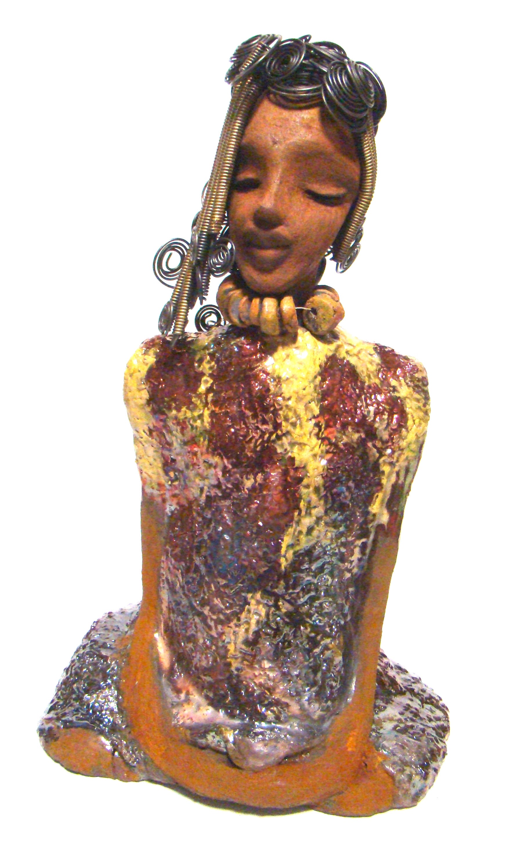 She wears a raku fired copper yellowish dress with a large yellow- brown beaded necklace.