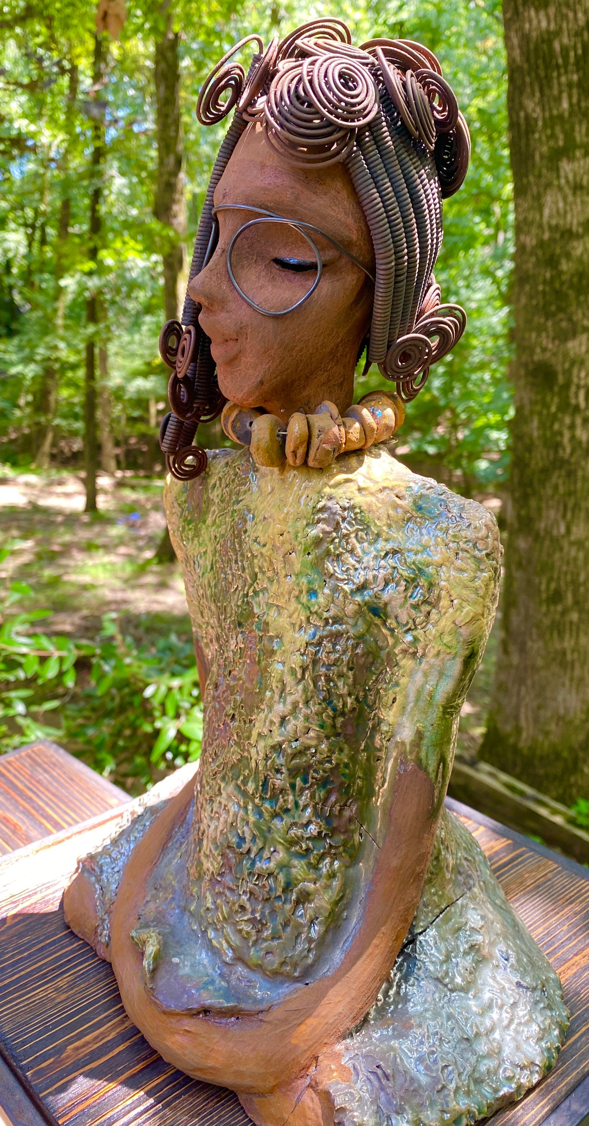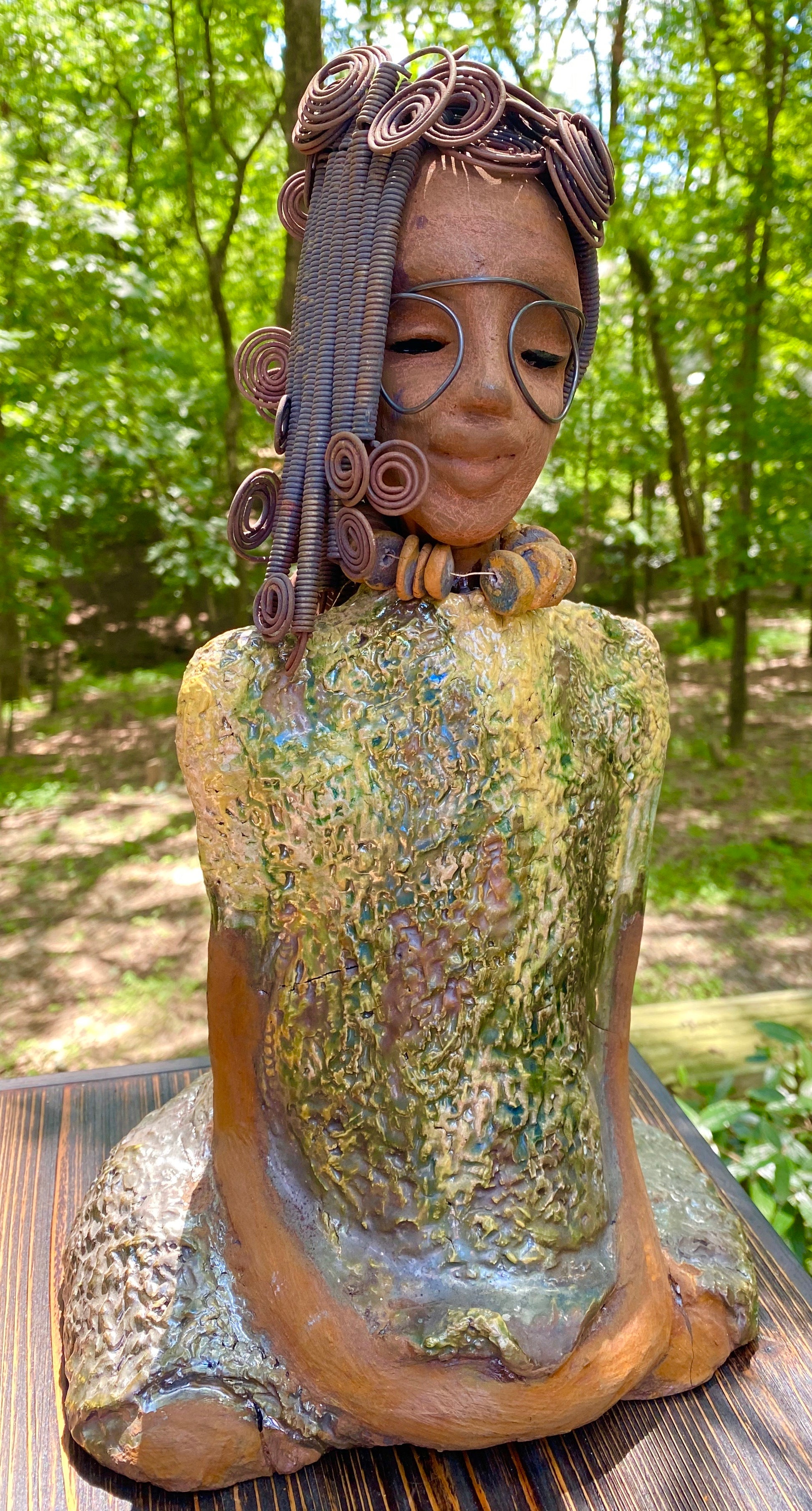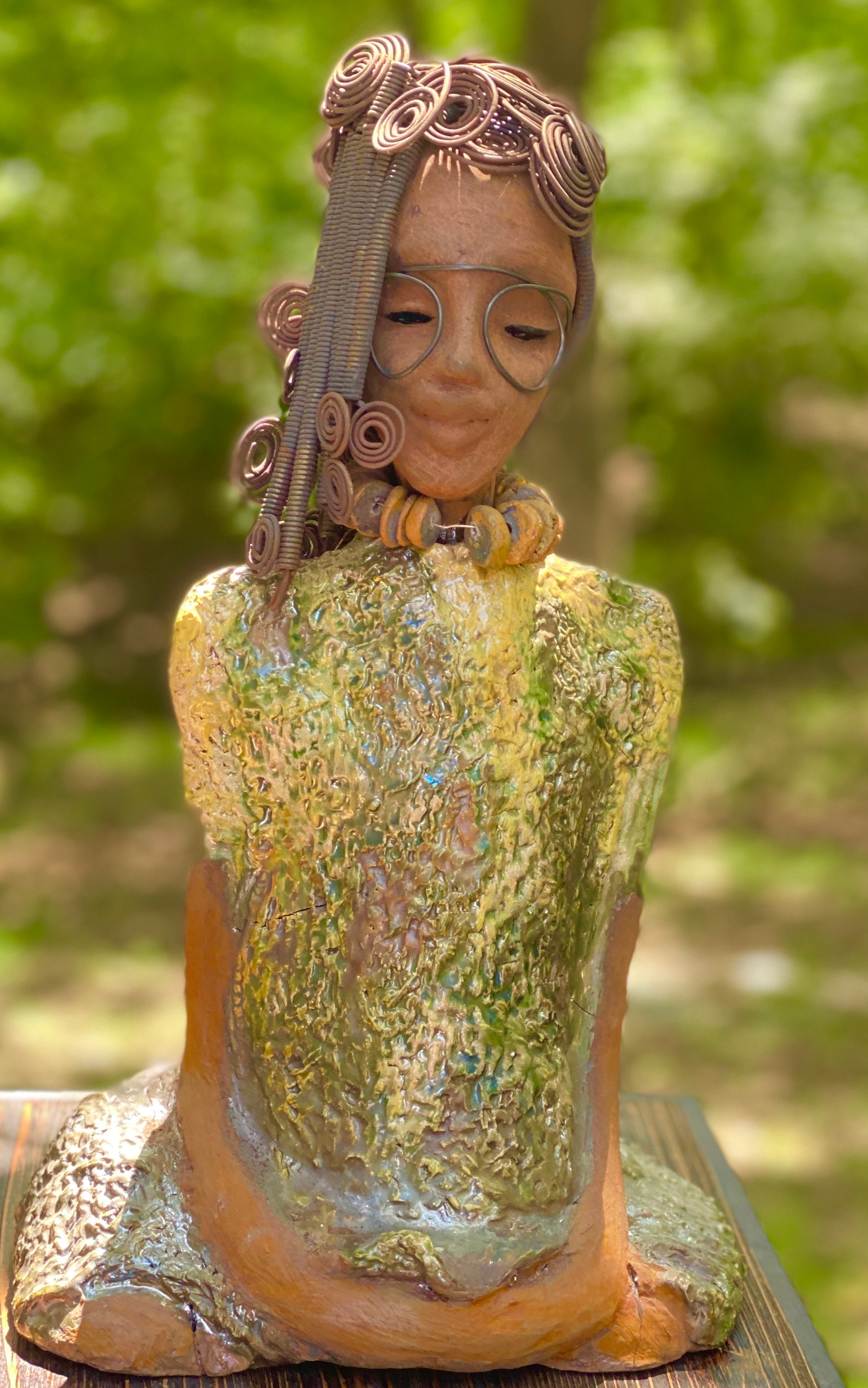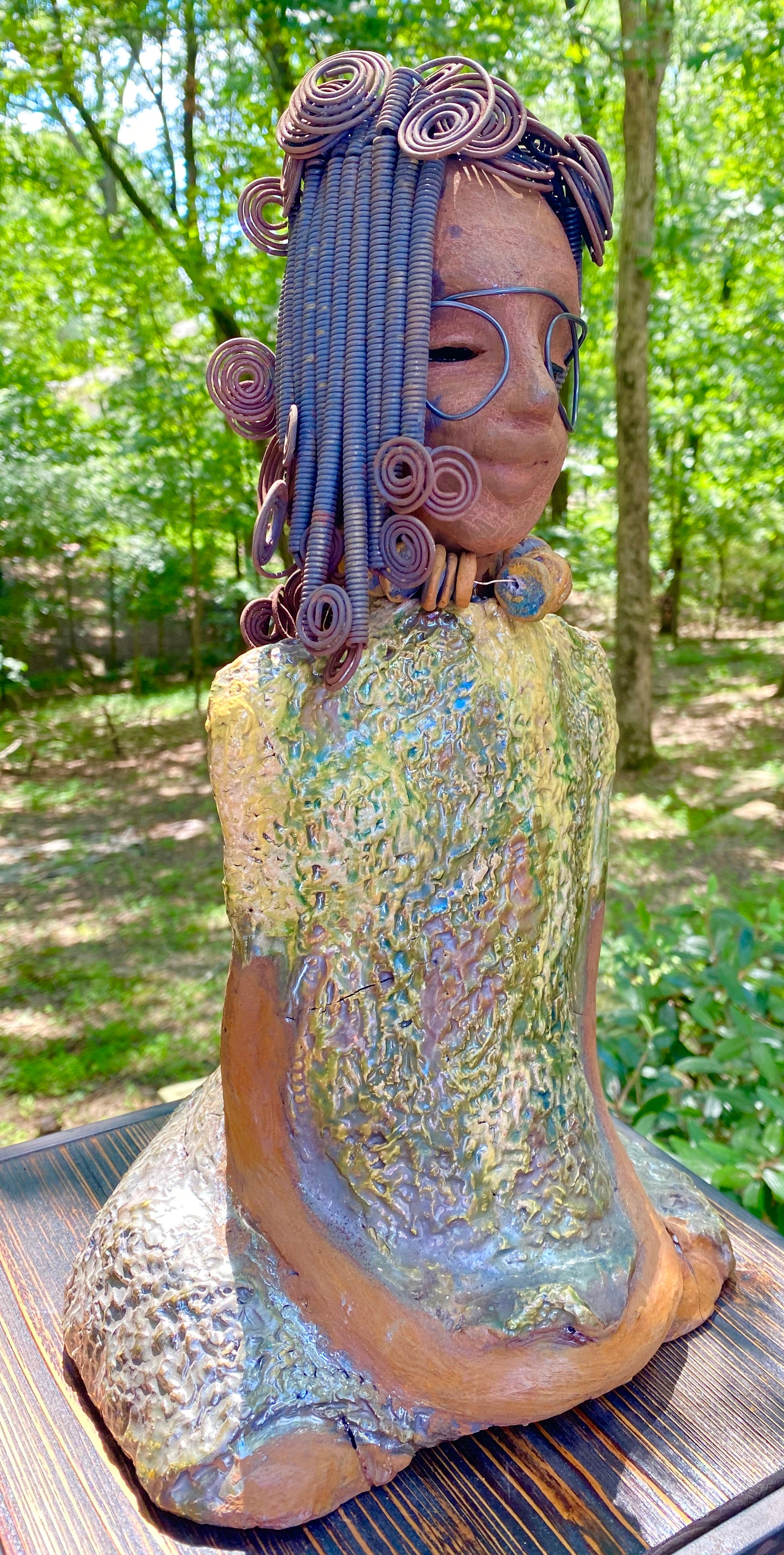 She wears a raku fired copper yellowish dress with a large yellow- brown beaded necklace.