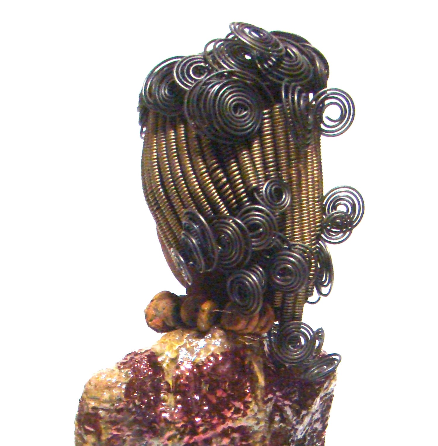 Ansley's hair includes 40 feet or more of 16 gauge wire that wraps, curls, and coils, more so on her left side.