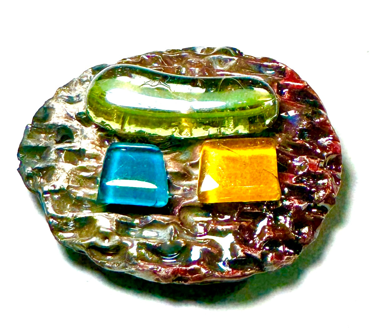 Raku fired, multicolored, 2.5" Art Magnet with iridescent glass accents is an excellent stocking stuffer.