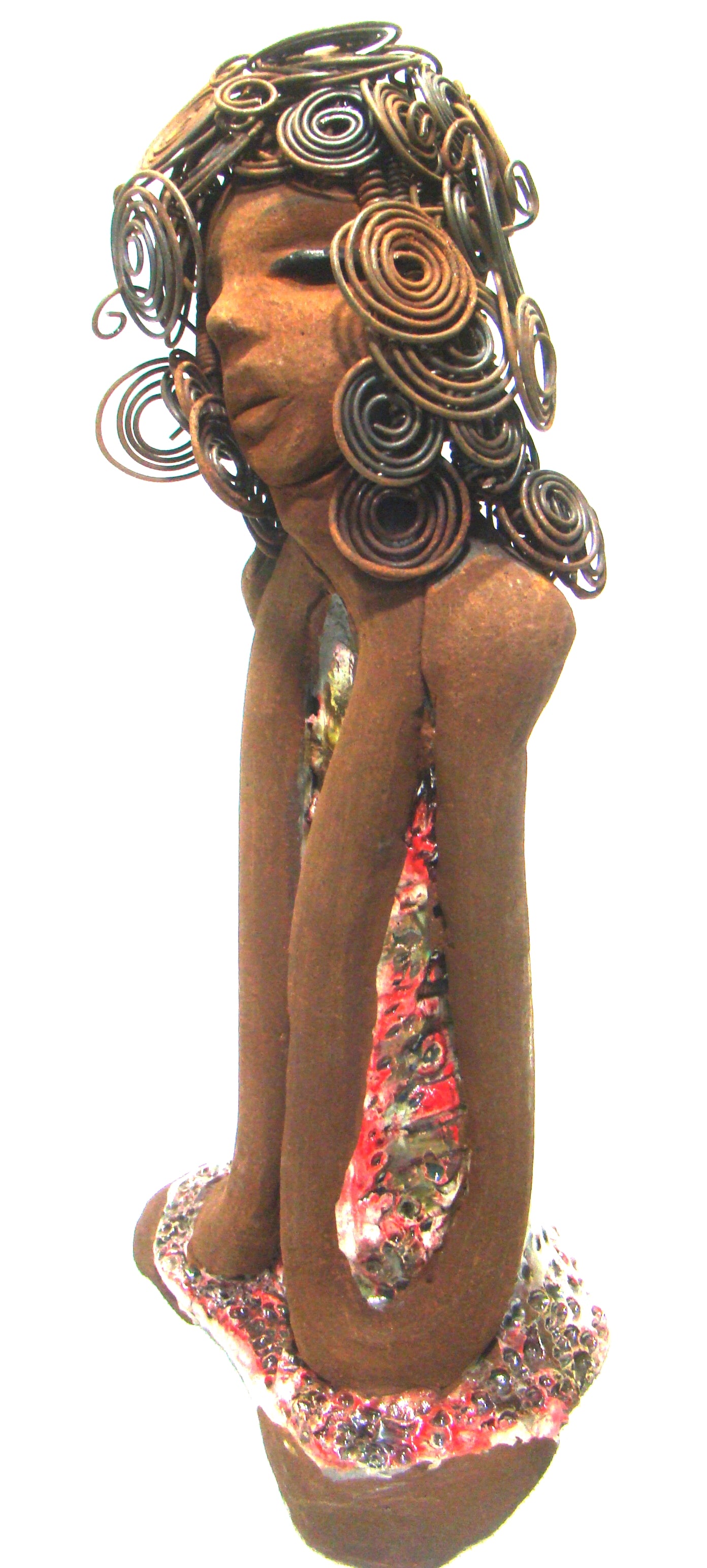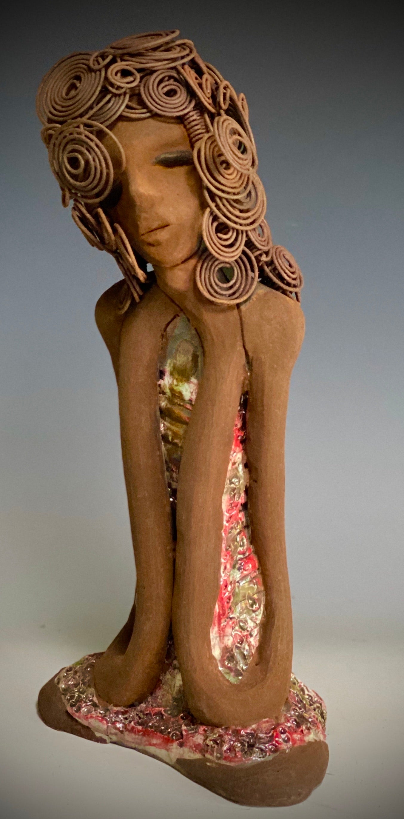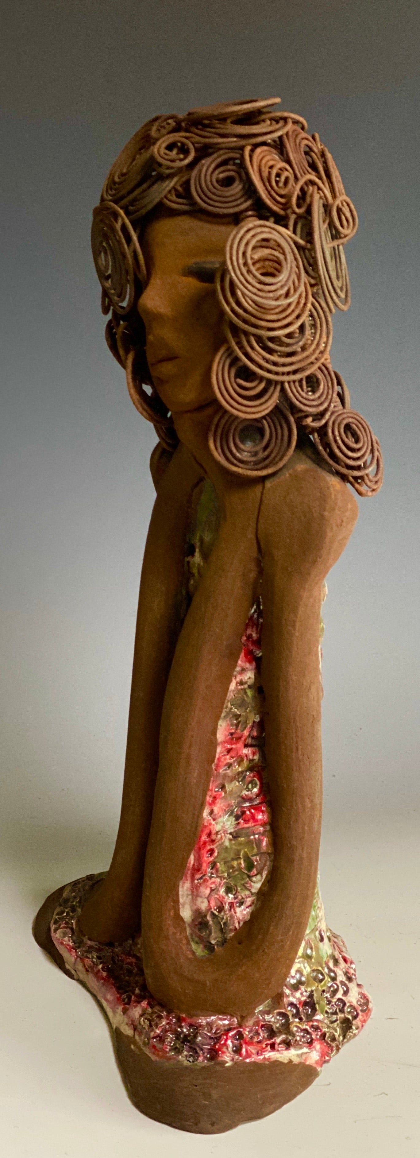 - She wears a multi mixed red and copper raku fired dress.