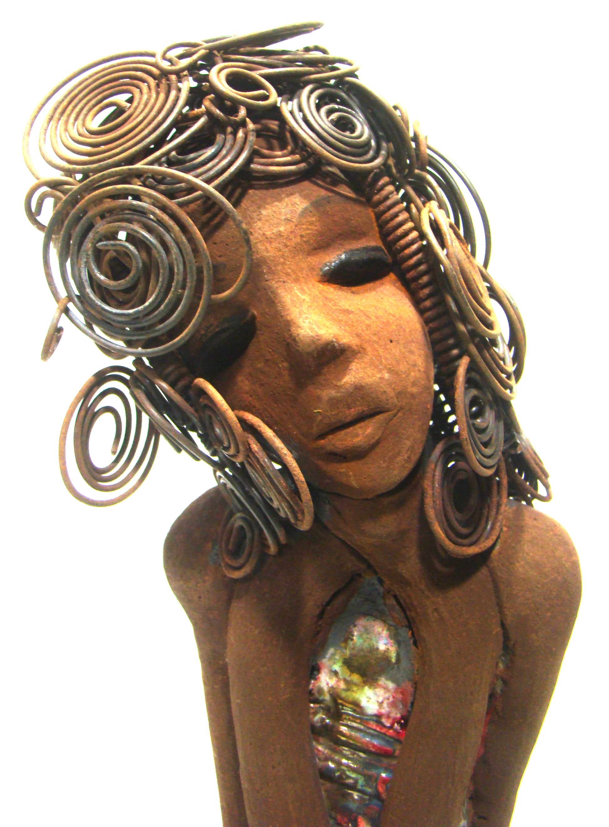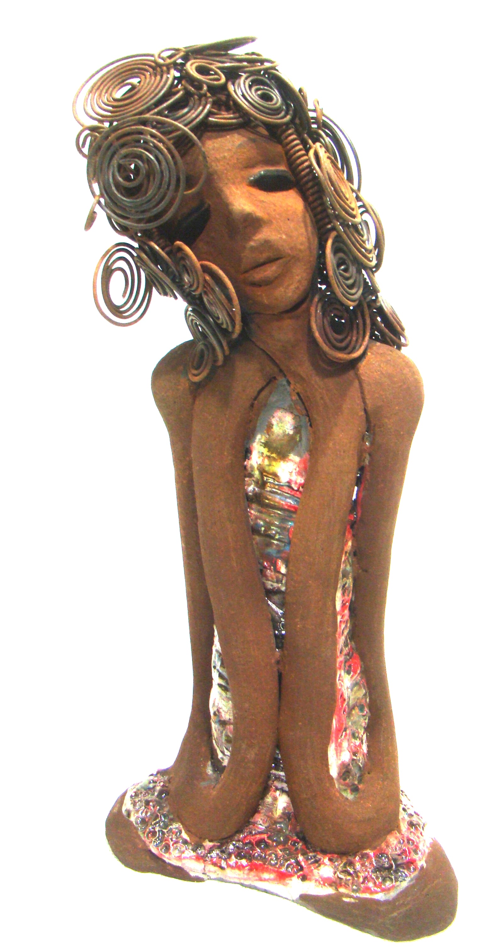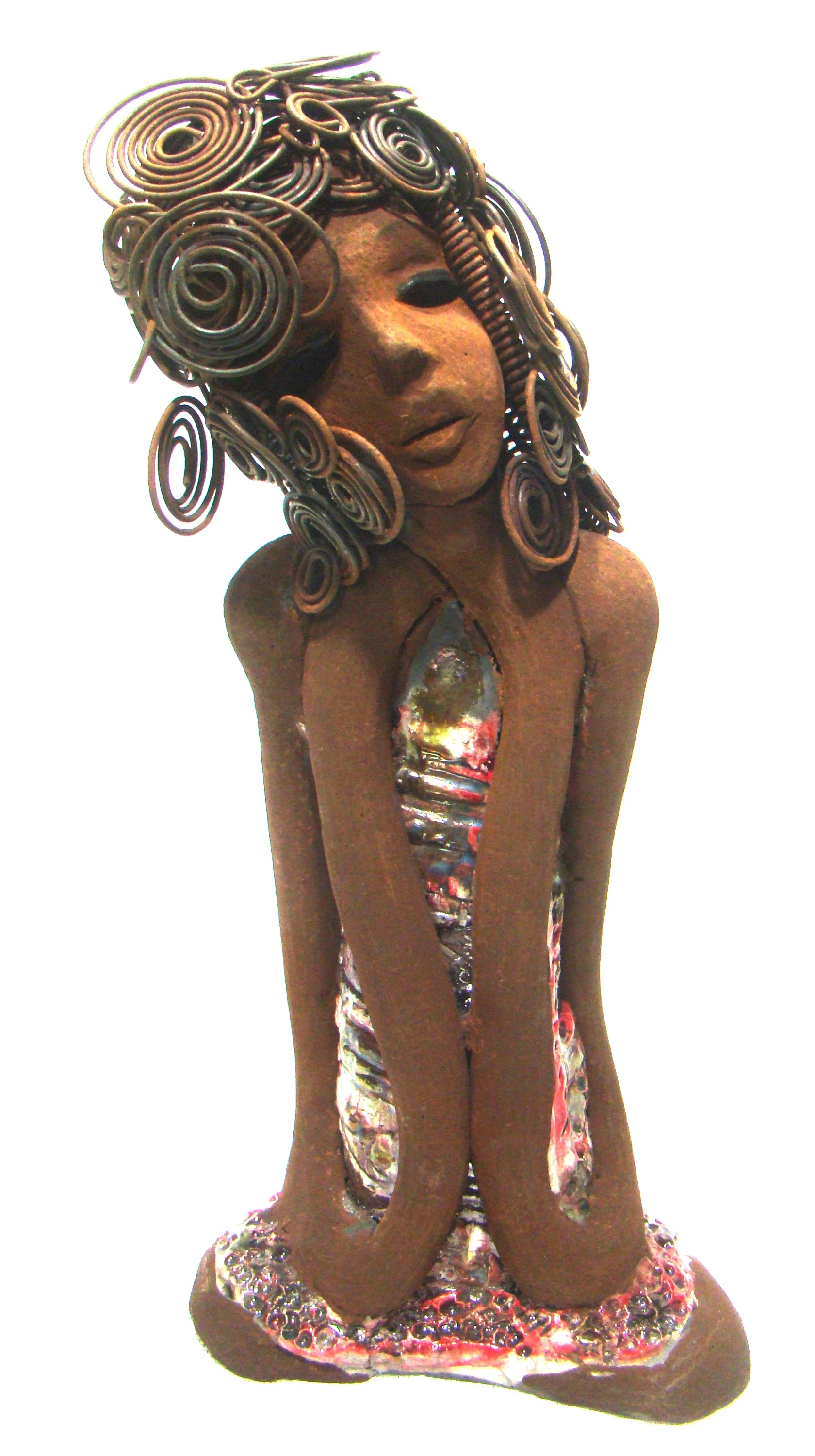 - She wears a multi mixed red and copper raku fired dress.