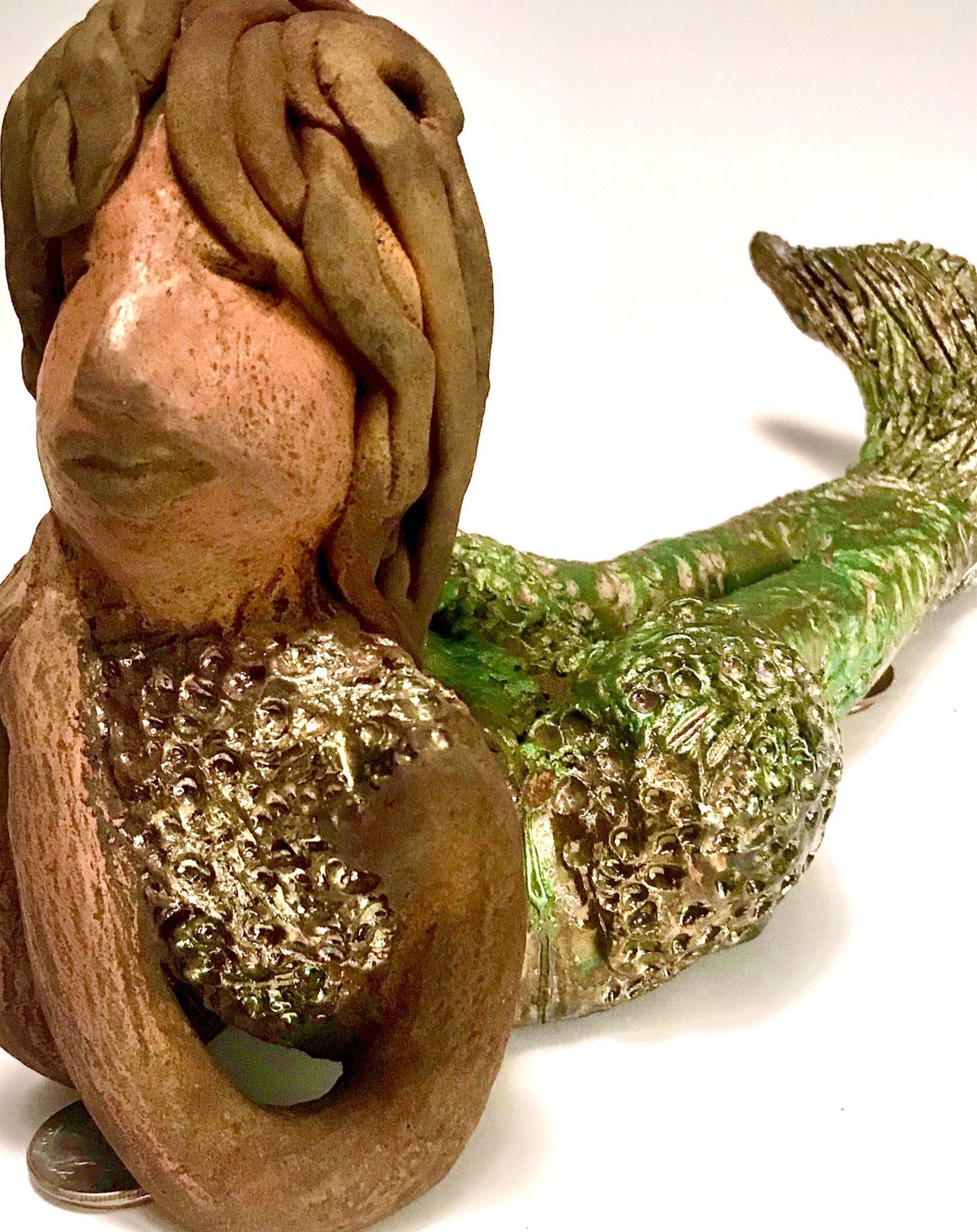 This voluptuous mermaid stands 6.5" X 5" 9.5" and weighs 2.04 lbs.