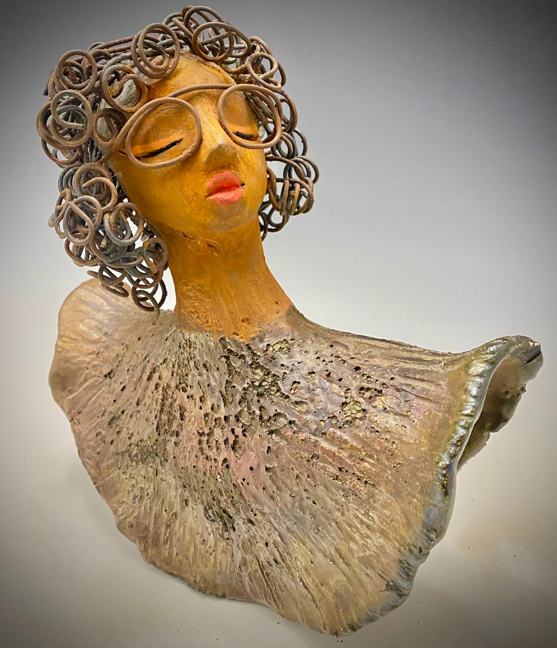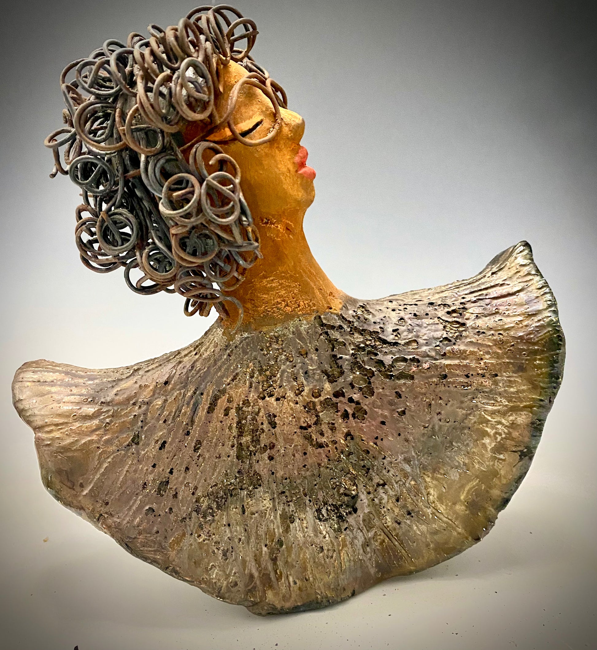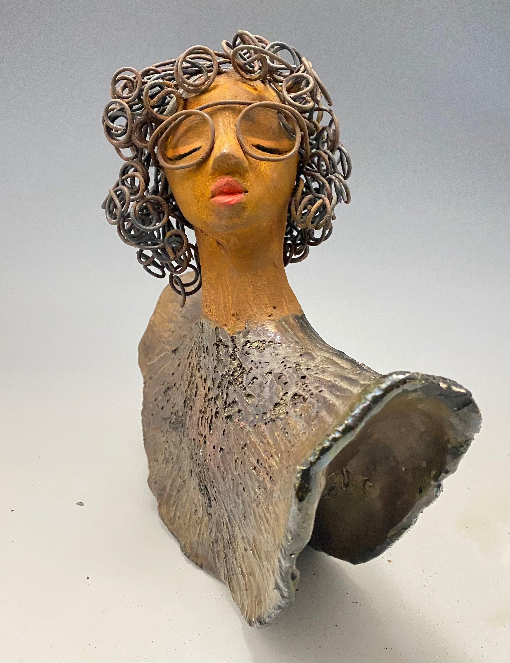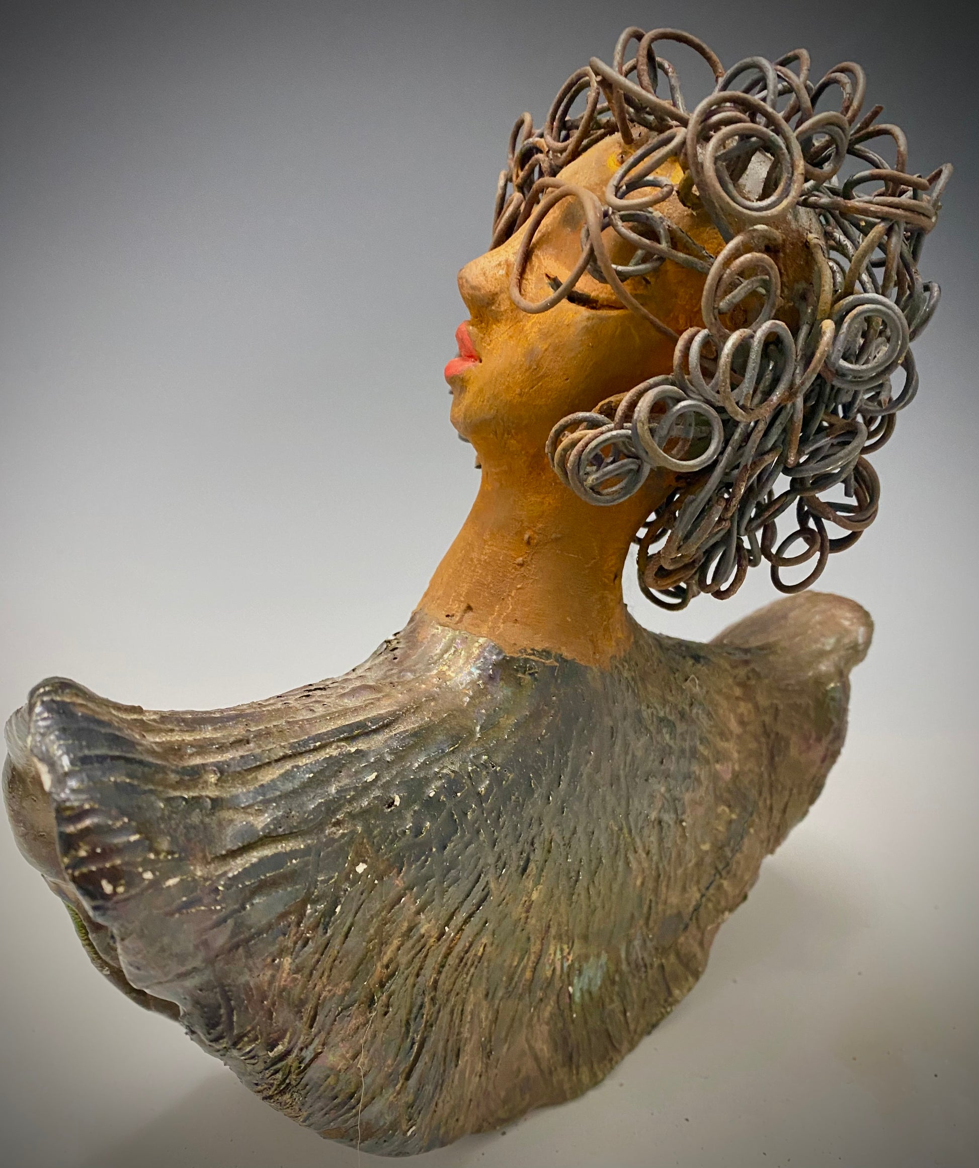 Bridgette stands 8" x 9" x 3" and weighs 2.10 lbs with a textured copper robe and black trim. She boasts over 10 feet of long and curly wire hair, a honey brown complexion and ruby red lips. Bridgette is sure to add an interesting conversation piece to your home. Enjoy free shipping and check out our Shipping and Return policy.