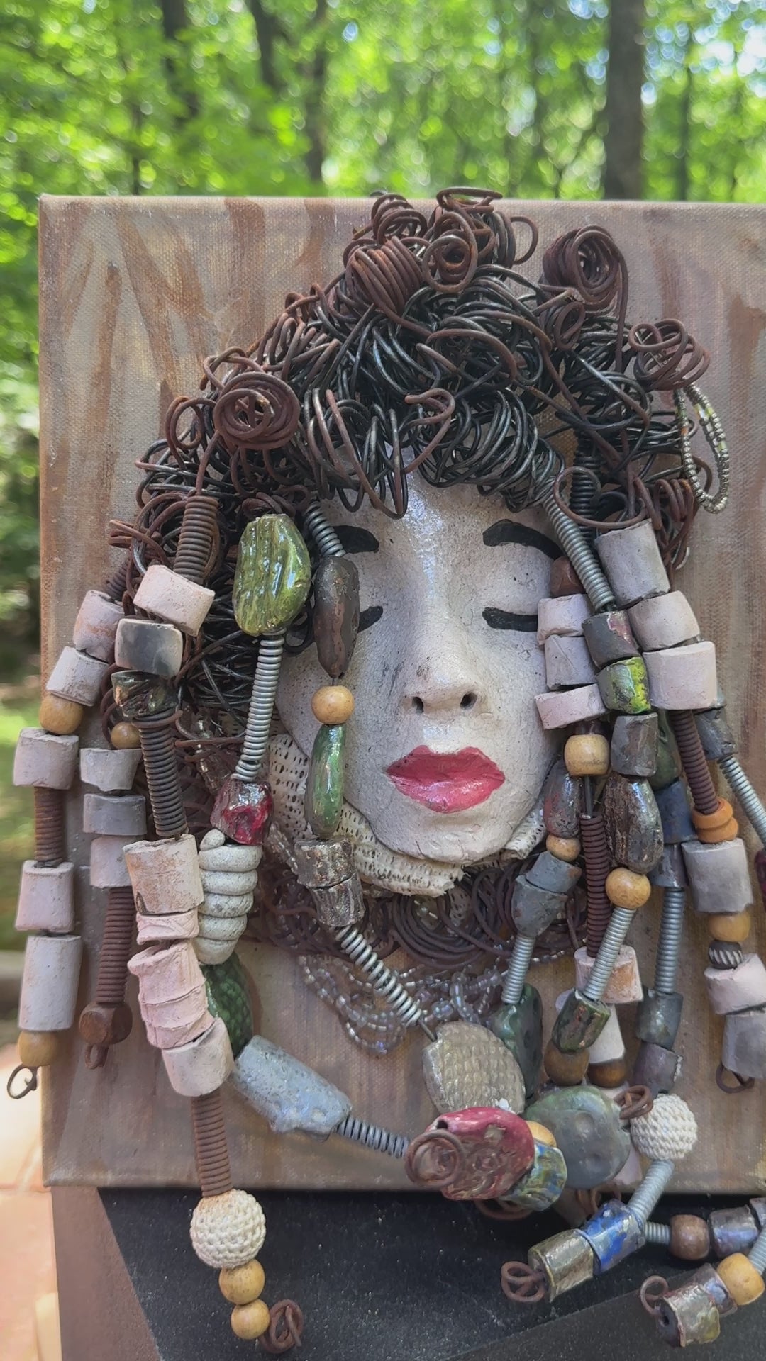 This experience inspired me to create Alaska: a 9"x 12" painted canvas with over 40 feet of 16 gauge wire for hair and more than 50 raku beads. Alaska features a white crackle face with ruby red lips and is ready to hang!