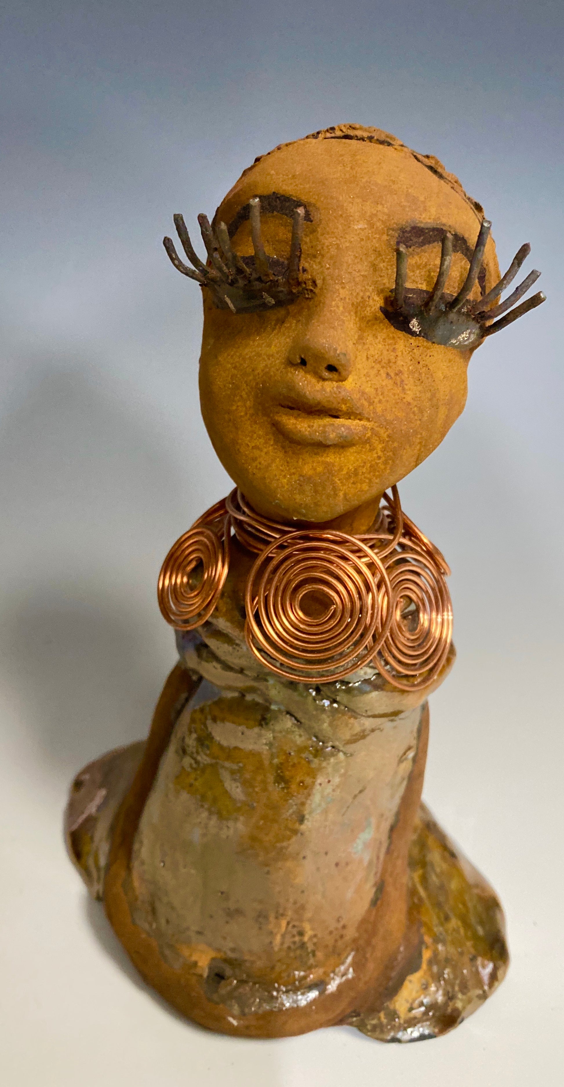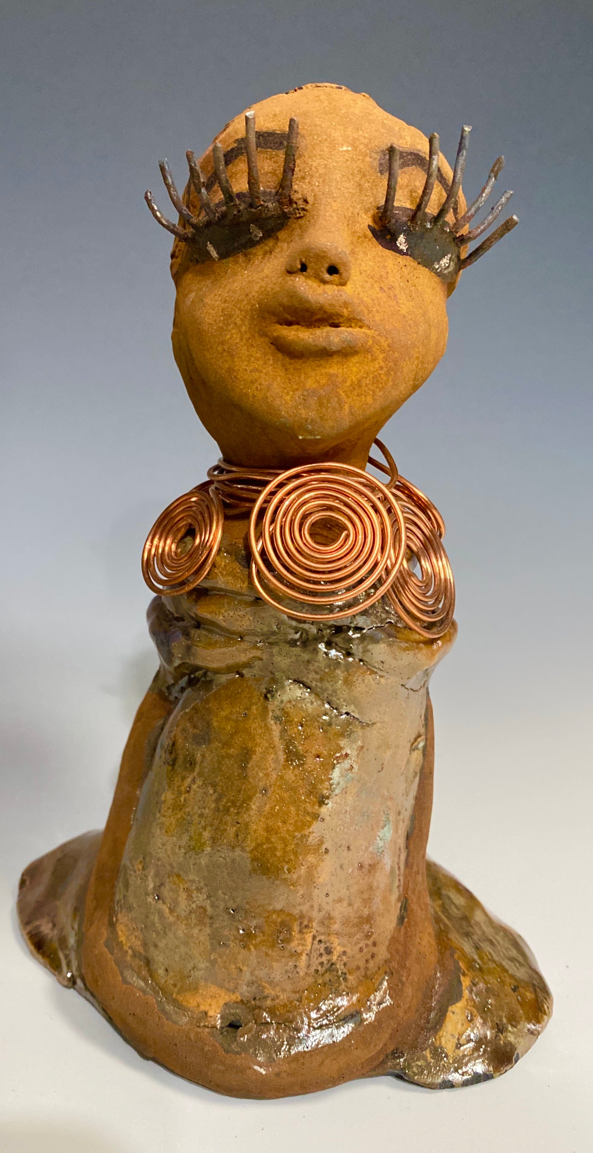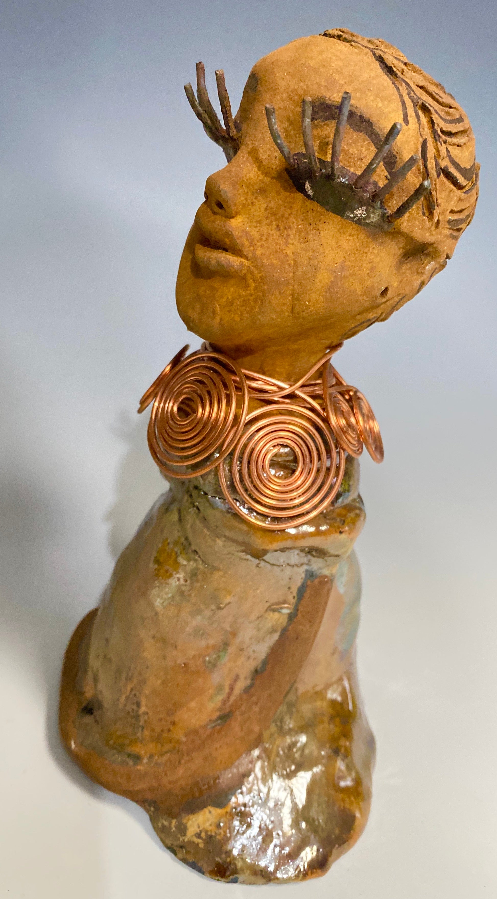 Charlotte stands 7" x 5" x 4" and weighs 1.03 lbs, featuring a honey brown complexion and reddish brown lips braided into an eye-catching hairstyle. Her outfit includes a metallic yellow-green antique copper glaze dress and a spiral copper wire necklace. With her eyes slightly opened, Charlotte hopes to find a new home.