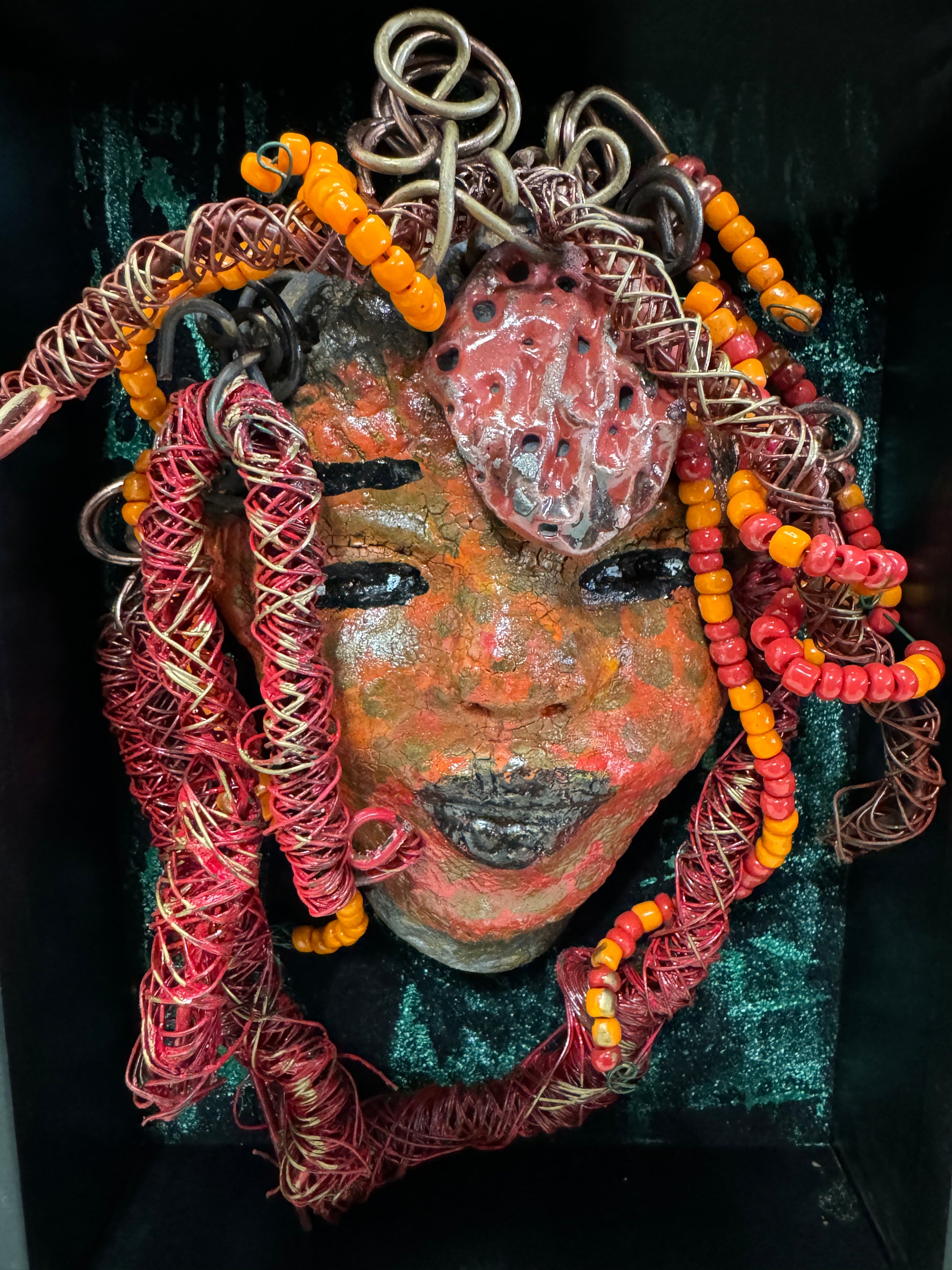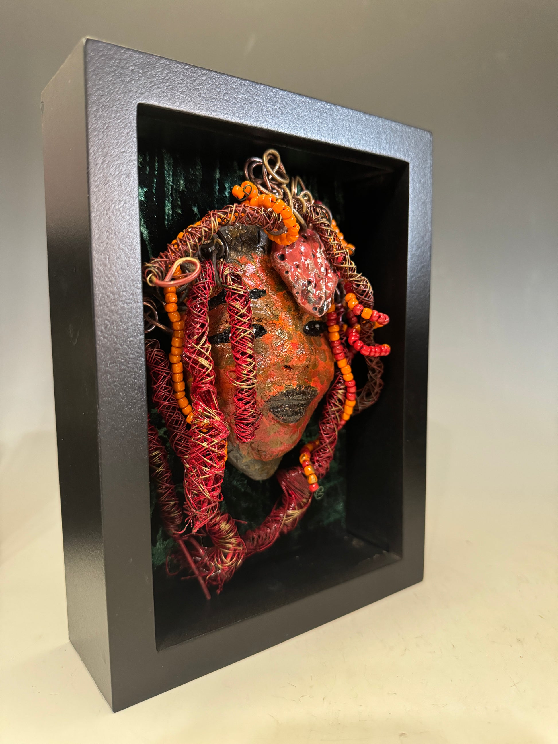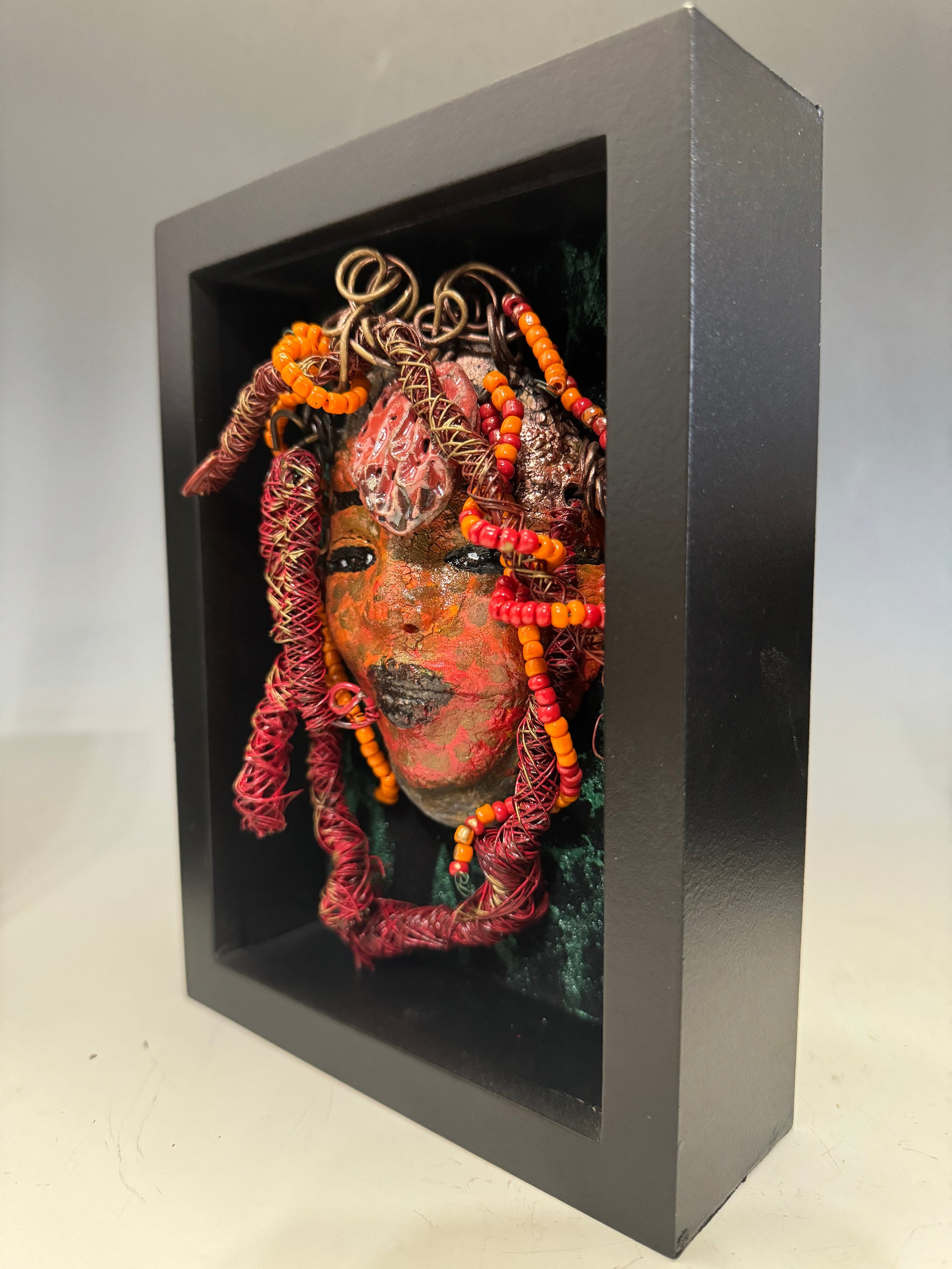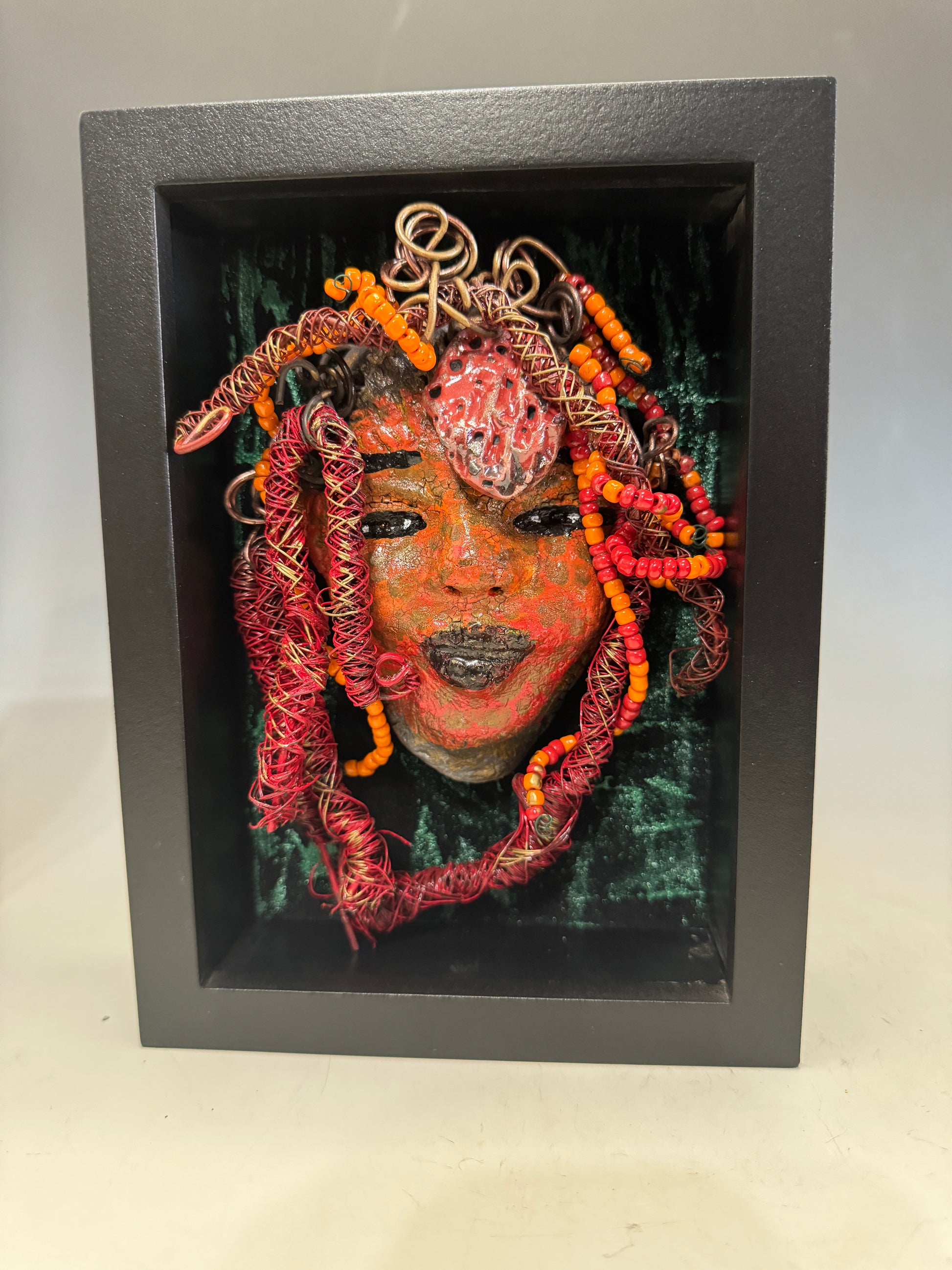 Presenting Cheneye: A captivating mixed media mask made with a raku firing technique. Meticulously crafted features include a unique two-tone honey brown and red complexion, subtle brownish red lips, and hair intricately woven with 16 and 24 gauge wire and beads. This piece is mounted on a black canvas, and elegantly displayed in a glass covered 5" x 7" black shadowbox.
