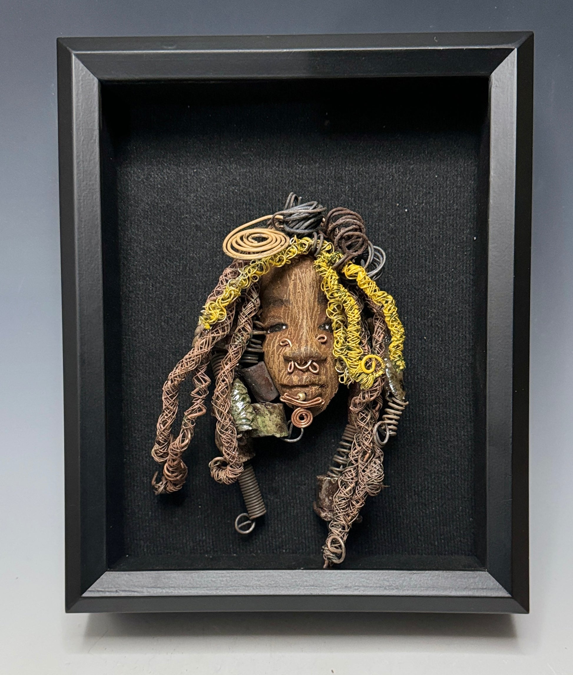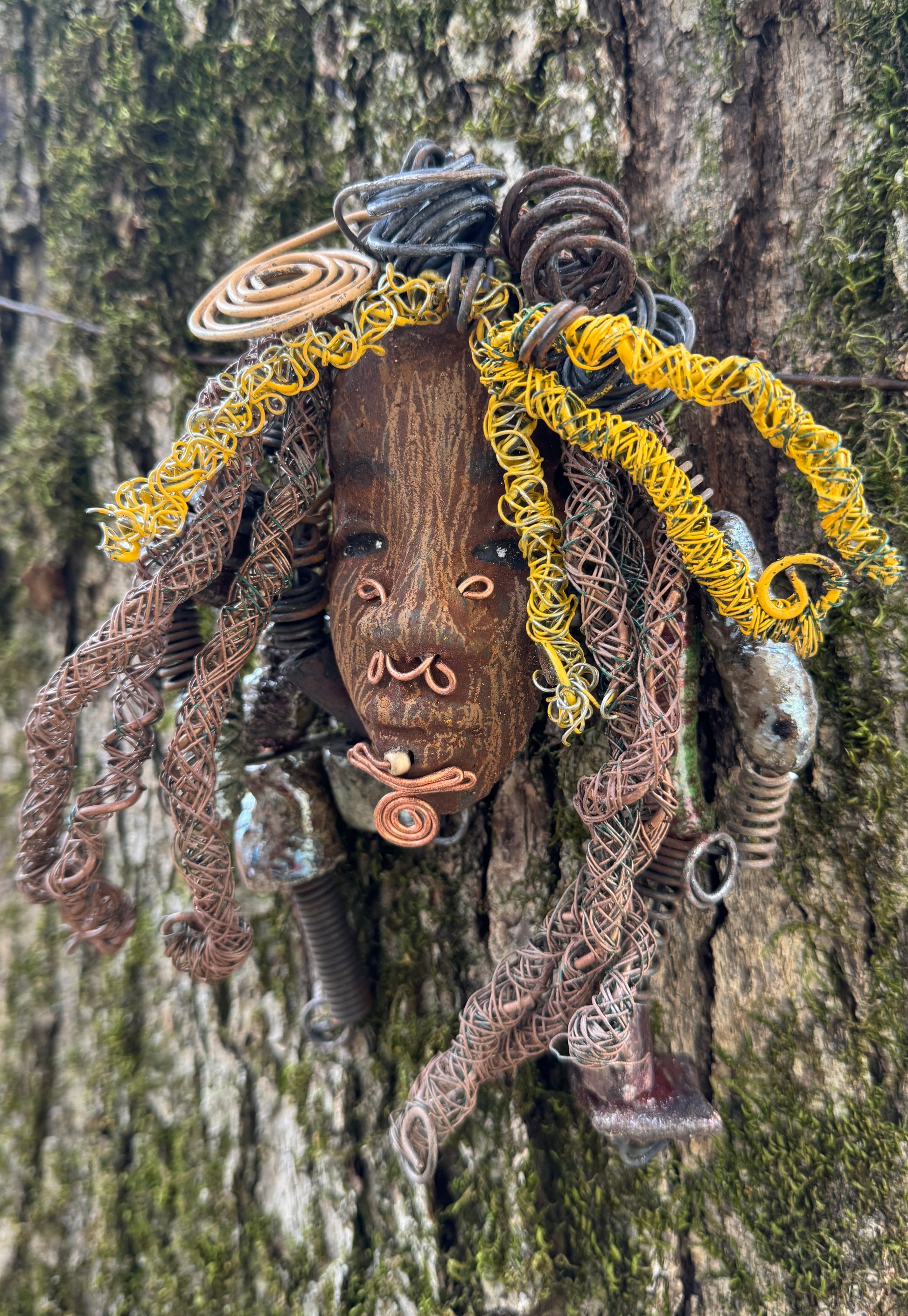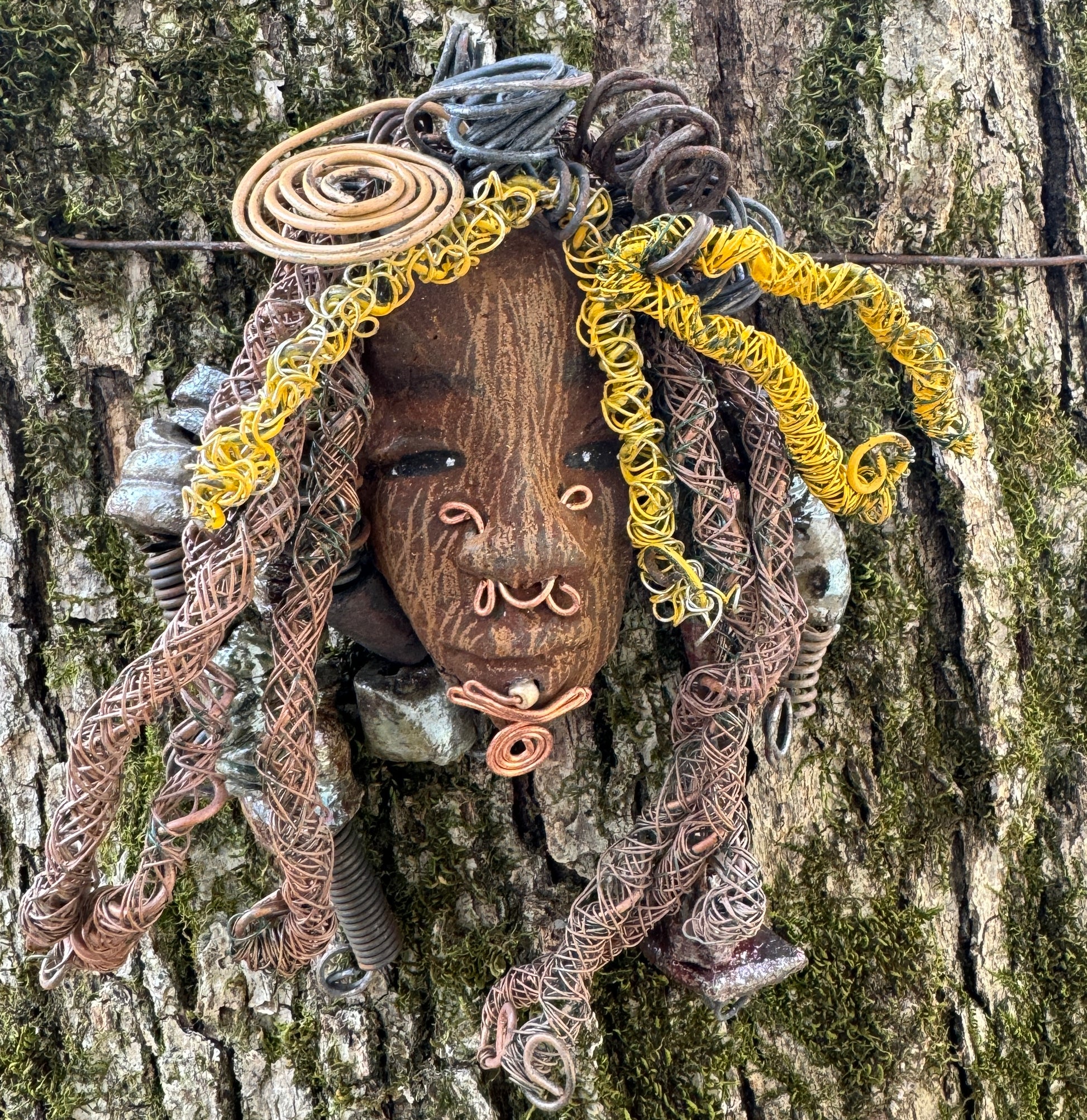 CoCo is a noteworthy addition to any setting - be it a shadow box indoors, a tree outdoors, or any other atmosphere. He is an 5" x 7" handcrafted Raku fire mask made of clay and wire, draped with 15 feet of 16/24 gauge wire for a realistic mane. His speckled honey-brown hue adds a distinct beauty, making him an ideal gift for the season. Shadow box not included.