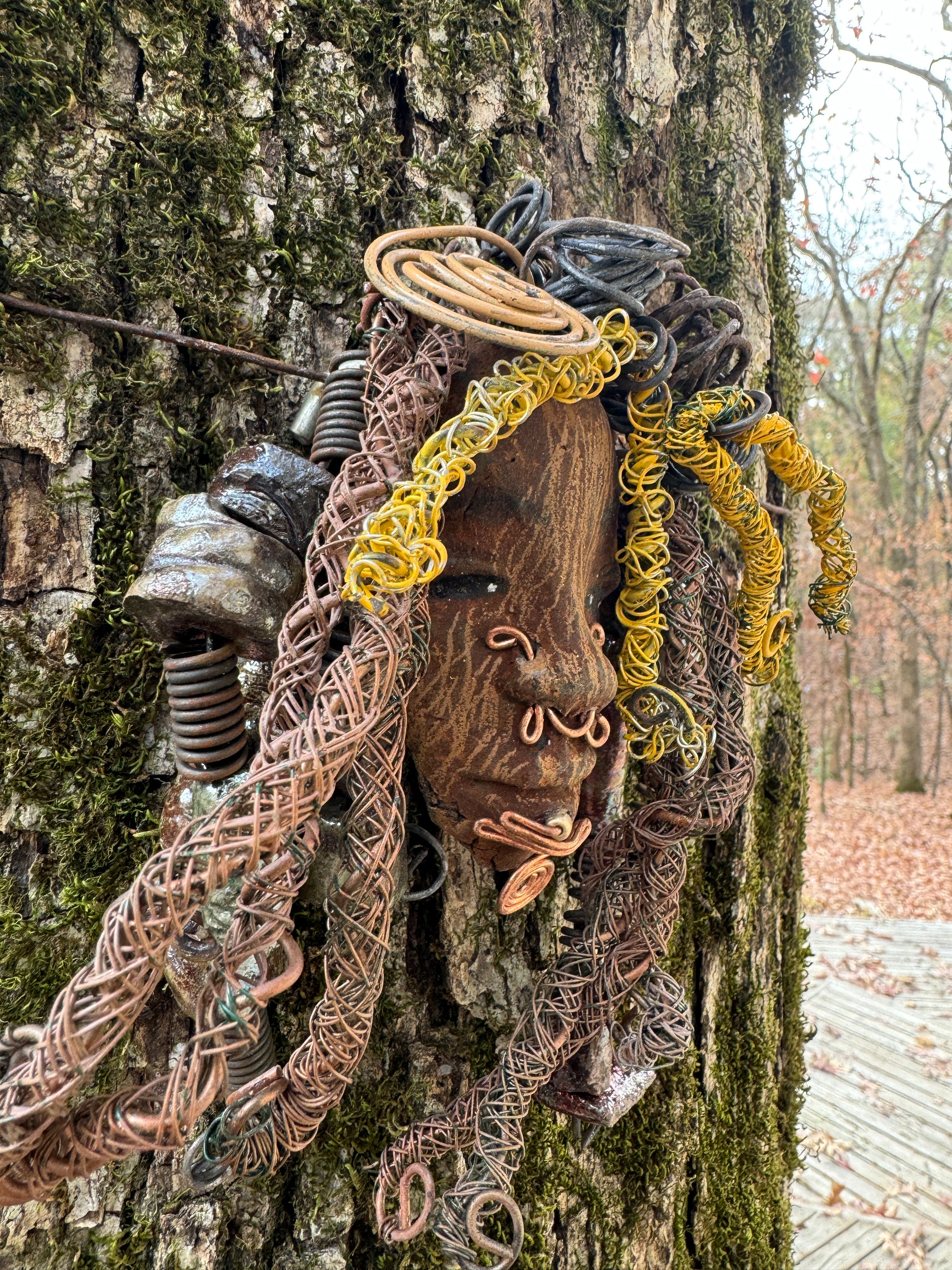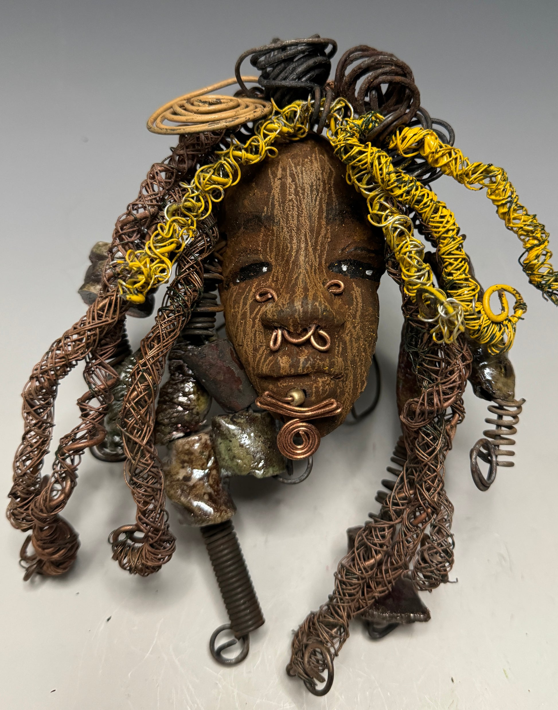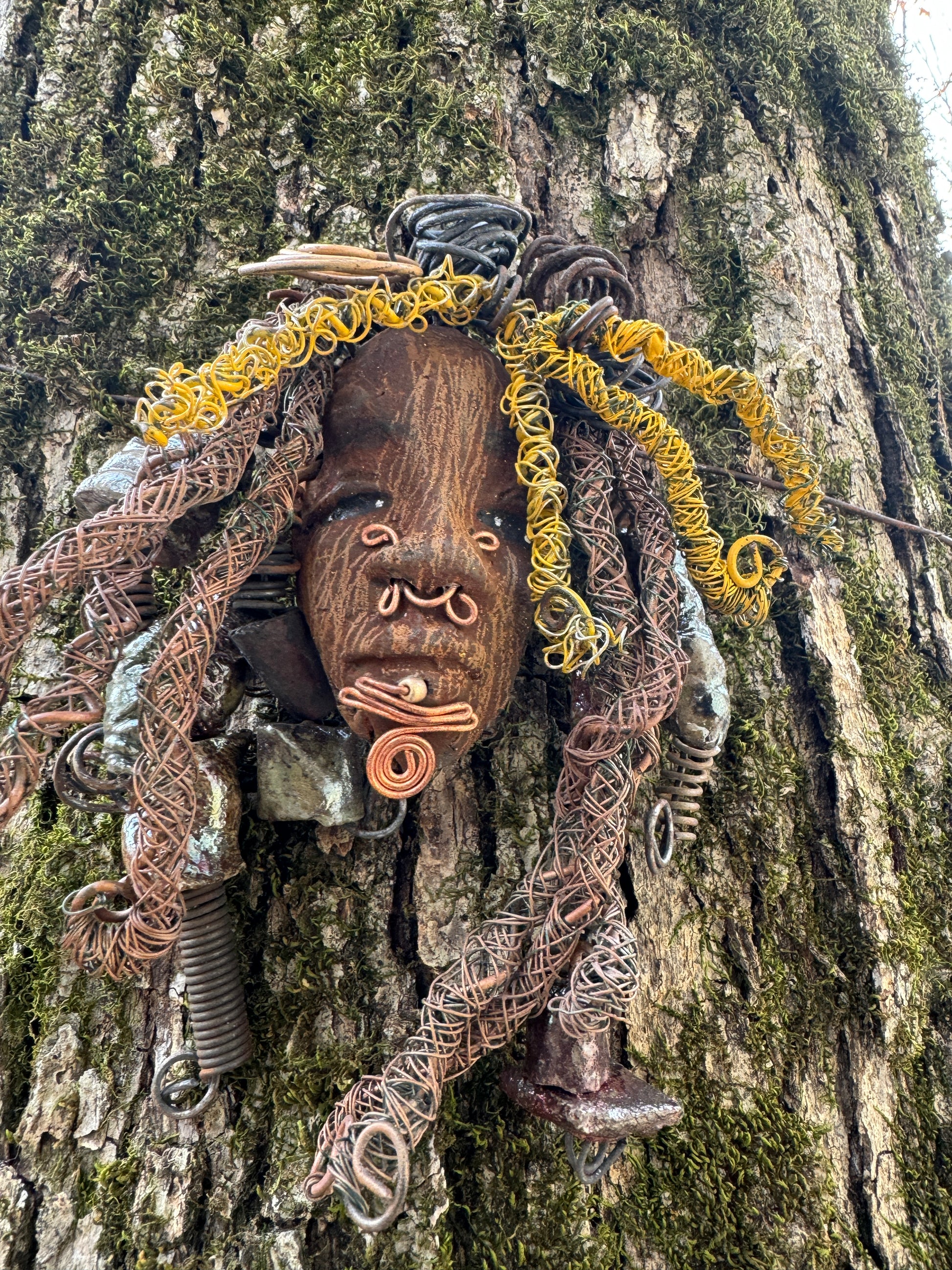 CoCo is a noteworthy addition to any setting - be it a shadow box indoors, a tree outdoors, or any other atmosphere. He is an 5" x 7" handcrafted Raku fire mask made of clay and wire, draped with 15 feet of 16/24 gauge wire for a realistic mane. His speckled honey-brown hue adds a distinct beauty, making him an ideal gift for the season. Shadow box not included.