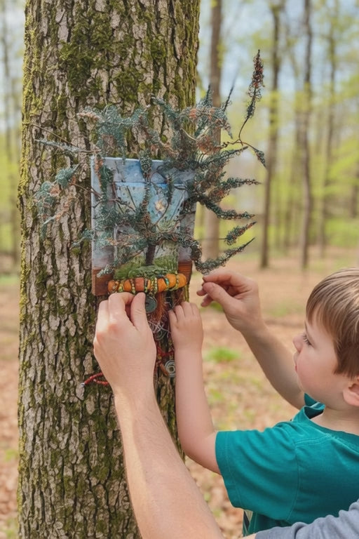 Discover the stunning Copper Cluster, measuring 18x15 inches, which blends 16- and 24-gauge wire with beautifully crafted Raku fire beads. As an added touch, a RAKU-fired hand-painted texture tile is mounted on a 8x7 wooden base. The sunlight streams through the lush copper foliage, evoking the feel of a refreshing spring day.
