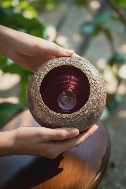 Expertly crafted with a unique firing technique, this Copper Textured Round Vase measures 4" x 5" x 5" and features a 2.5" opening, making it suitable for a wide range of floral arrangements. Its sturdy design guarantees the protection of your flowers, making it an ideal choice for any occasion. Elevate the elegance of your home decor with this stunning piece. Don't forget to take advantage of our convenient Shipping and Return policy. Weighing at 14oz, this vase also showcases a vibrant interior and textured exterior in our promotional video.