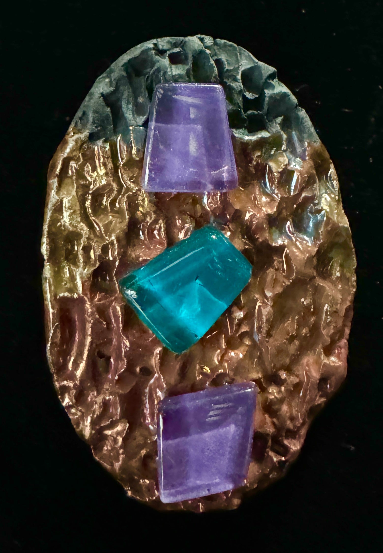 This 3" Art Magnet, fired using the Raku process and featuring multicolored glazes and iridescent glass accents, is an ideal small gift. The magnet is exceptionally strong.