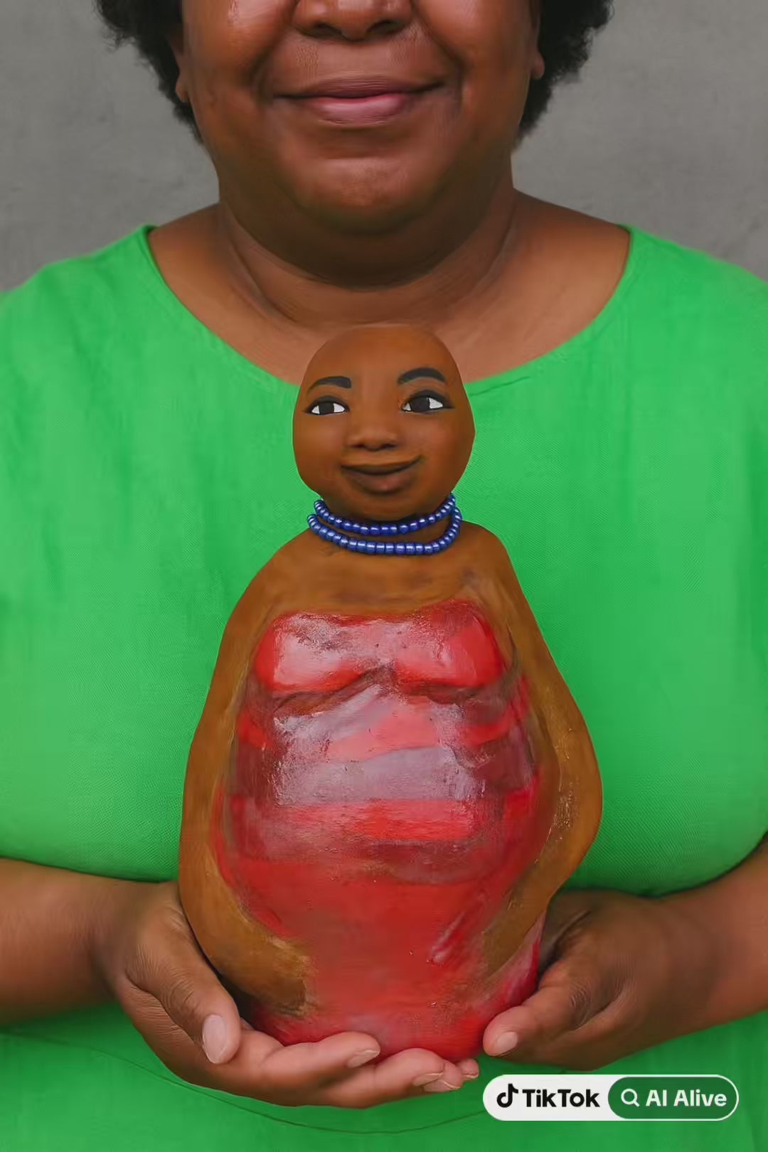 Cora, a 9" x 7" x 4.5" doll weighing 2lbs, has been given a complete makeover on 7-8-21. With a beautiful honey brown complexion and lovely reddish brown lips, she now wears a long flowing copper wire wig and a stunning striped heart red and gold glazed dress. Adding to her transformation, she also wears a beaded ruby red necklace. Check out her before and after pics as she hopes to find a new home.