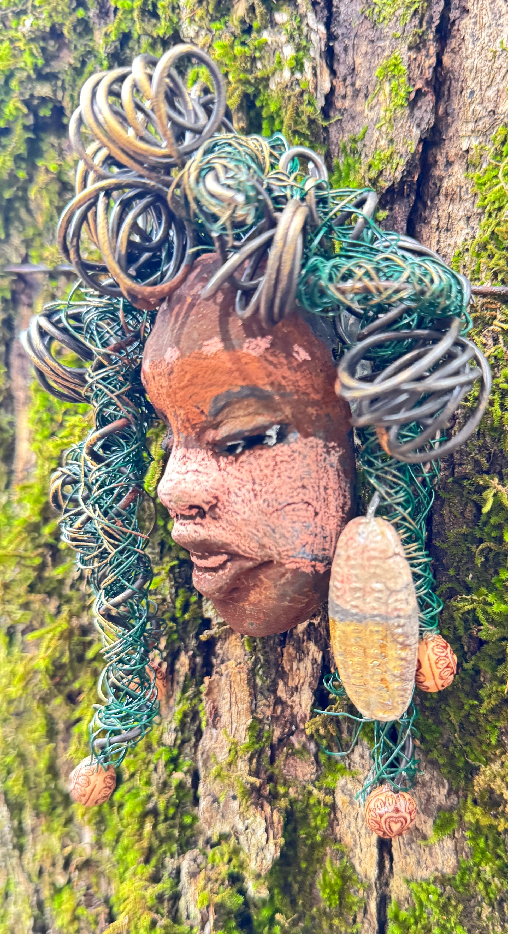 Davina is a 4” x 5” 5oz. mixed media raku fire mask made with 20 feet of 24 and 16 gauge wire. It boasts a striking, three-colored design and includes a large Raku fired earring with wooden beads. This unique piece is the perfect addition to your HerDew mask collection. Experience the enhanced beauty of Davina when paired with tree bark.