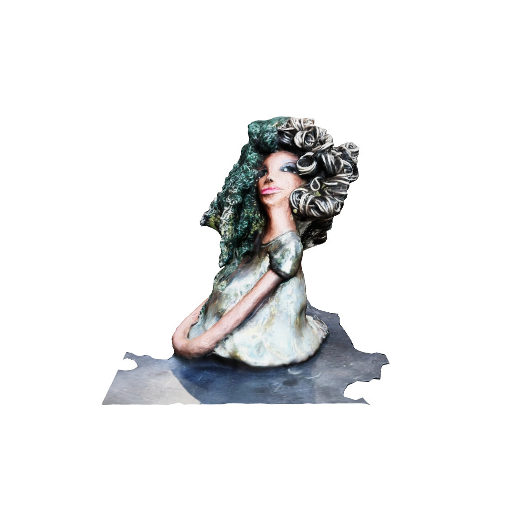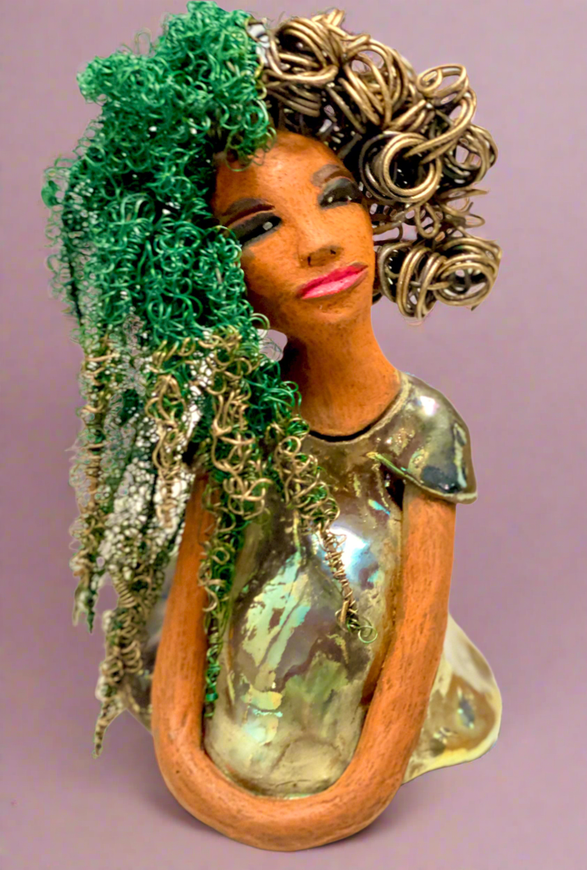 She also has a very colorful metallic copper green antique glazed dress.