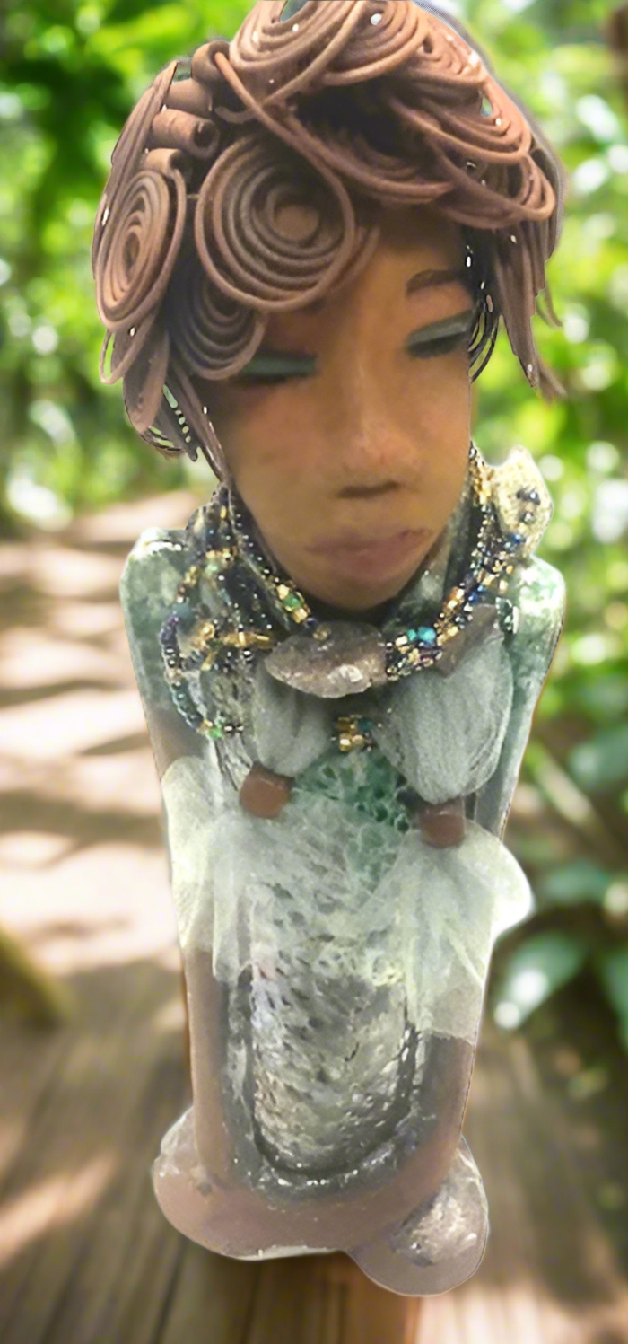 Introducing Dorothy - a sweet and gentle companion for your home. Measuring in at 15" x 5" x 3" and weighing 2.7 lbs, she boasts a lovely honey brown complexion that adds to her charm. Her fashionable green metallic dress, adorned with a beaded tulle around her neck, took over 3 hours to complete. With long, loving arms and a low-key demeanor, Dorothy will remind you of Dewana, who has found a new home. Don't just take our word for it - hear what Ursula, her new owner, has to say! Bring Dorothy into your home and if she doesn't fit, return her within 30 days for a full refund. Plus, enjoy free shipping and reach out to us via instant message or chat for any questions. Check out our shipping and return policy for more details.