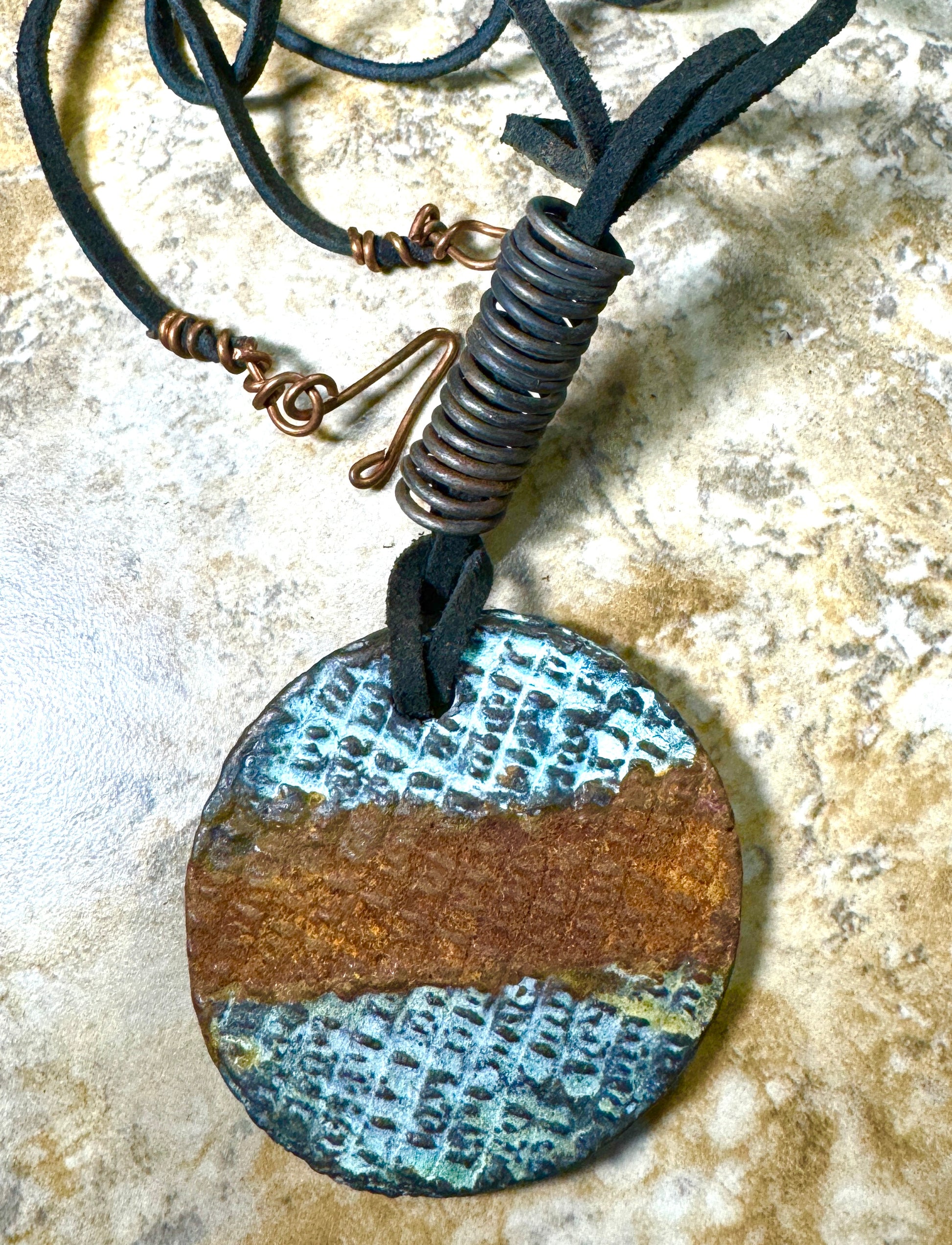 This 22” necklace is composed of a two-tone disc centerpiece and multicolored beads on a black lace cord. Its captivating design and luxurious texture make this piece an artistic statement. Its distinctive color combinations, along with its length, make it an attractive addition to any wardrobe. This fashionable jewelry is the ideal combination of boldness and sophistication.