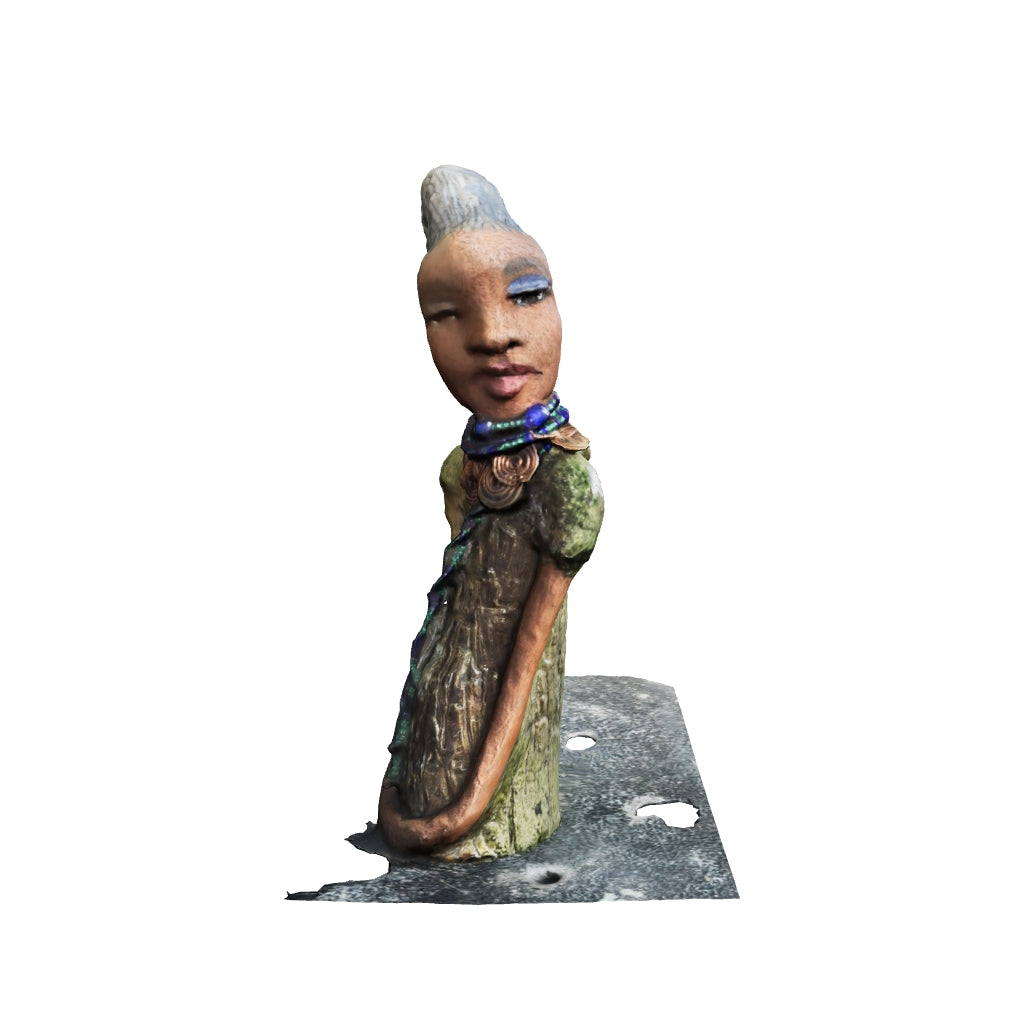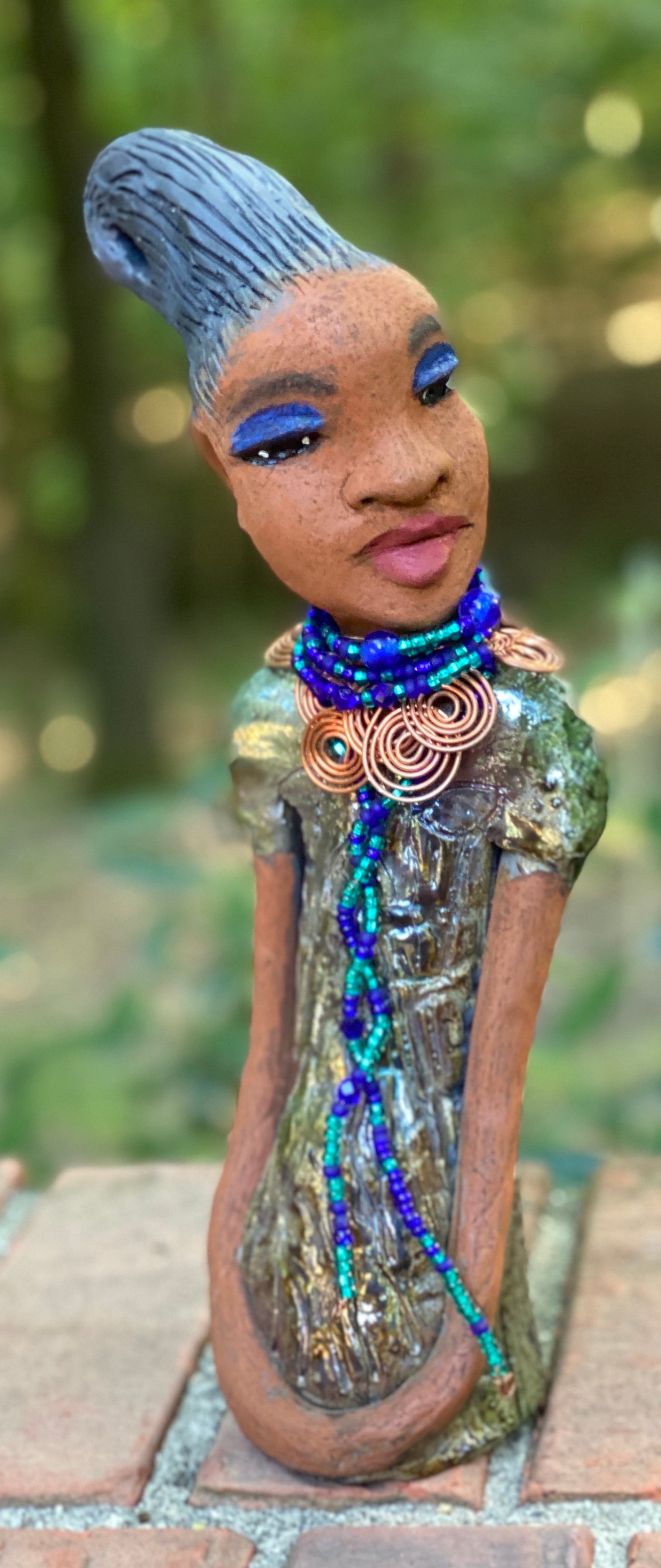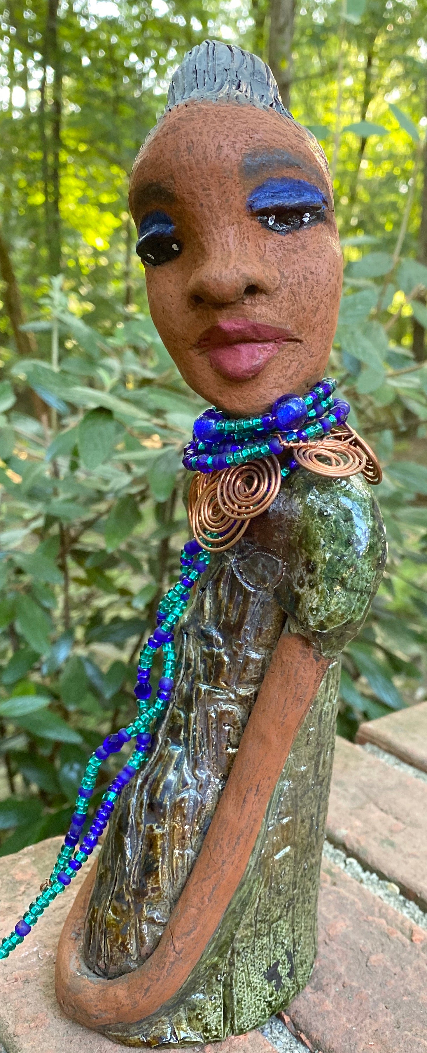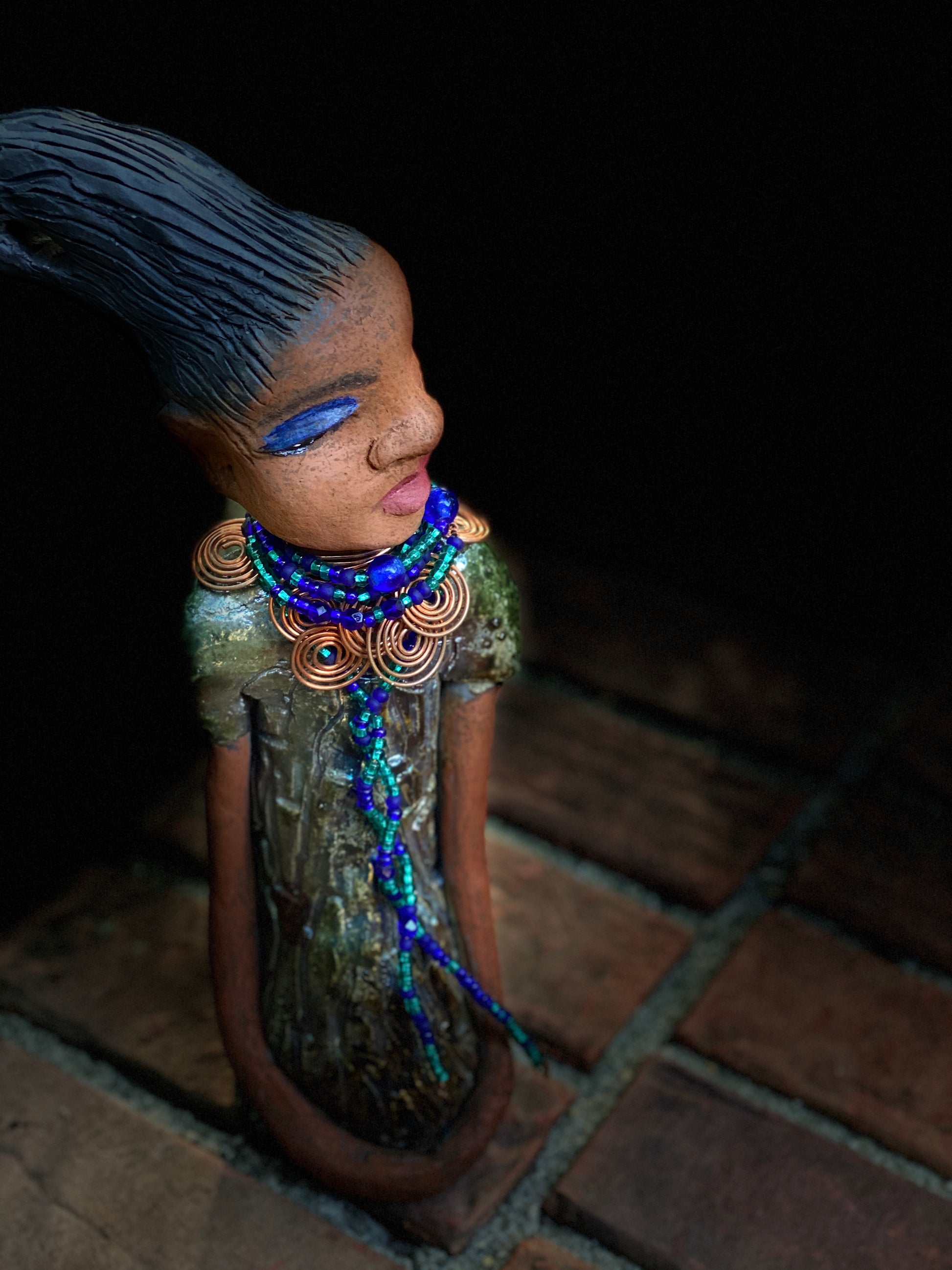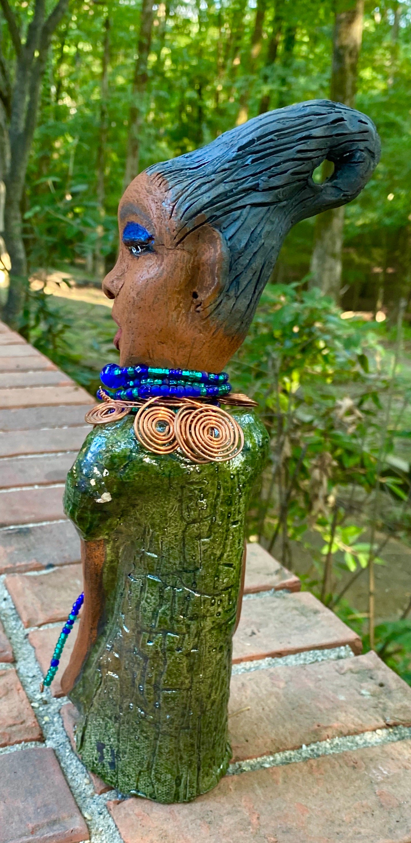 Meet Emma Again! She has undergone a transformation and is now jealous of Eonna. She stands 12.5" x 3.5" x 4" and weighs 2.04 lbs., with a honey brown complexion and reddish brown lips. Her hairstyle is a braided clay 'do, and her dress features a colorful metallic green antique copper glaze. She accessorizes with a spiral copper wire necklace and a multicolored blue beaded collar. See her before and after pics, and don't forget to explore any questions you have! Emma has wide eyes and hopes to join your home.