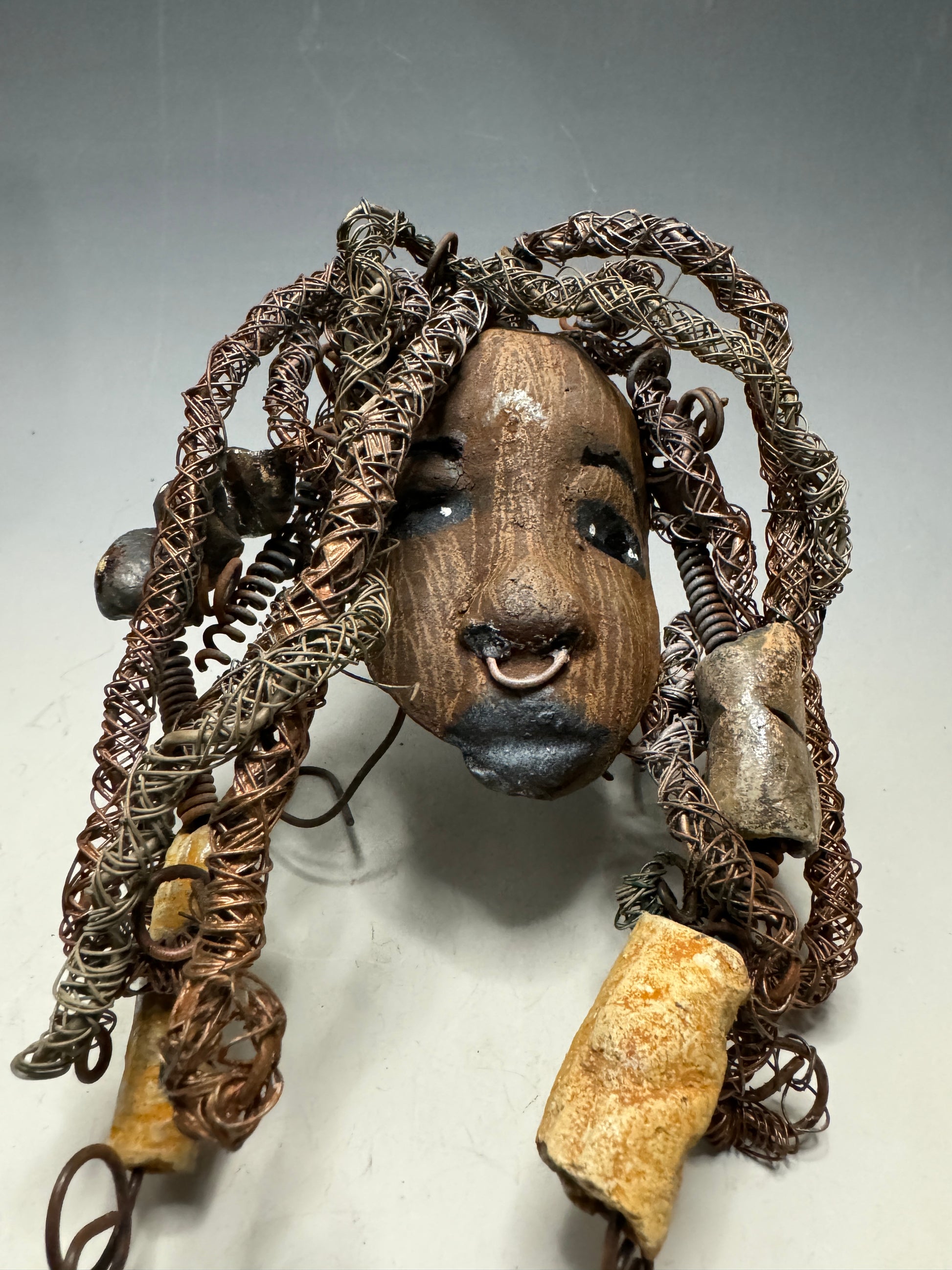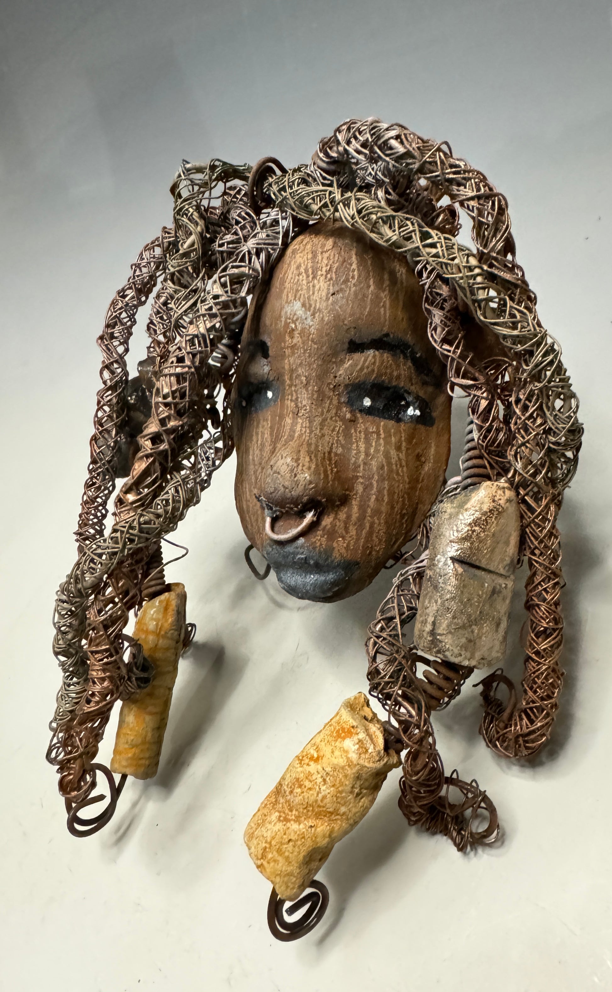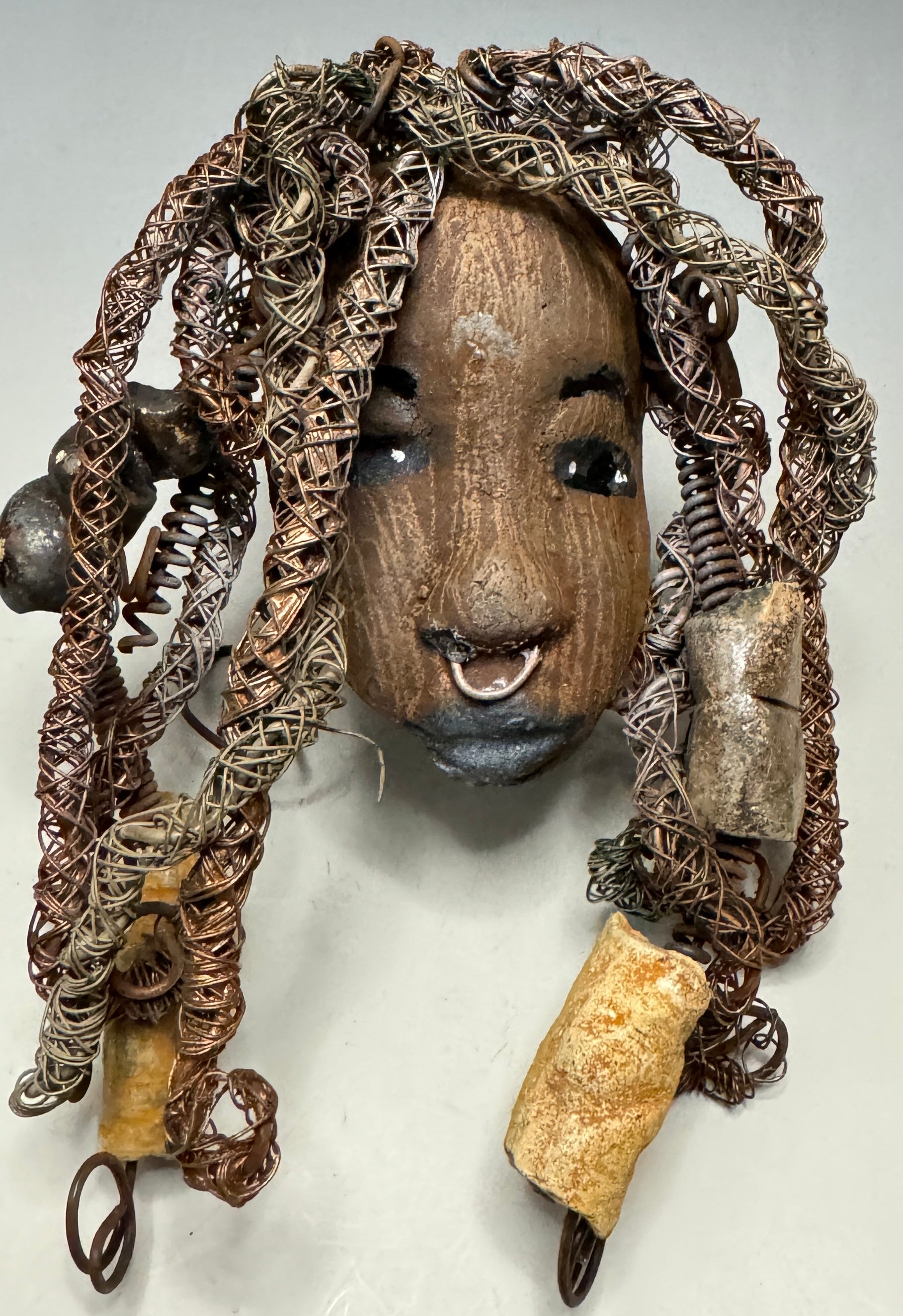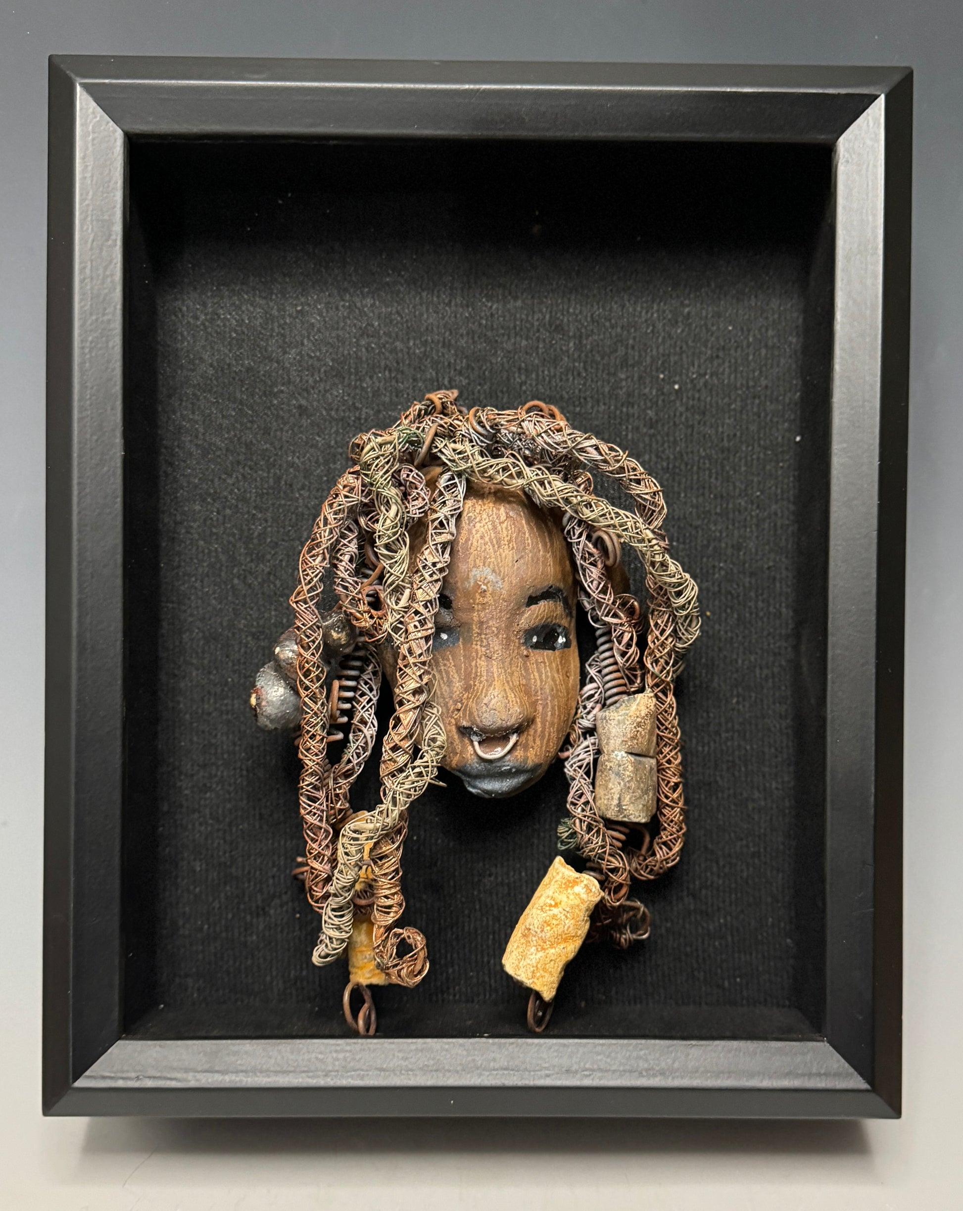 Eva boasts a slim 5 oz. frame and measures 4" by 7". Appropriate for adorning walls, trees, or shadow boxes, Eva adds a stylish spark with her black and white braids, honey brown complexion, and white washed lips, making her the ideal initial item from the HerDew mask line. Shadow box not included with Eva.