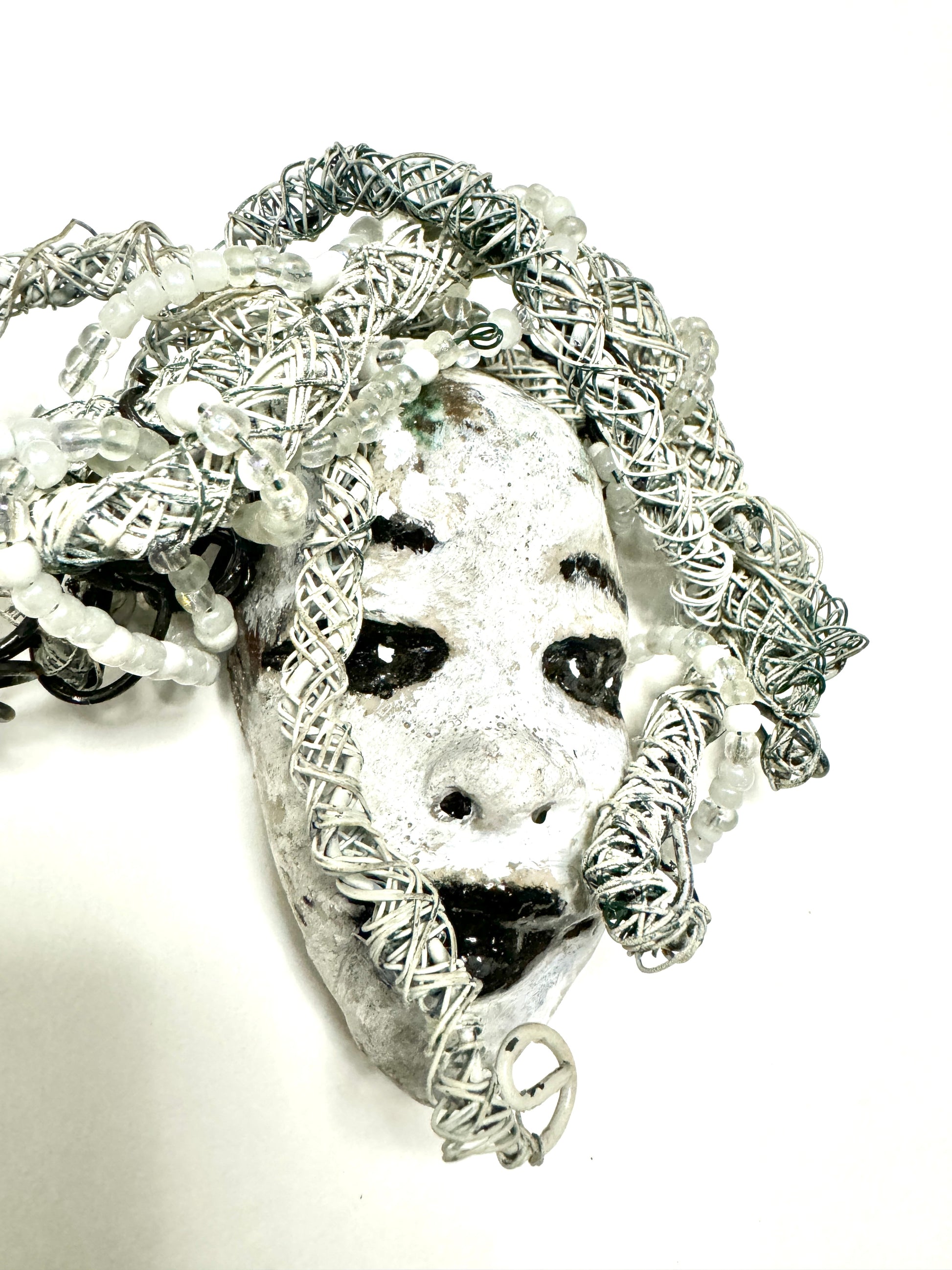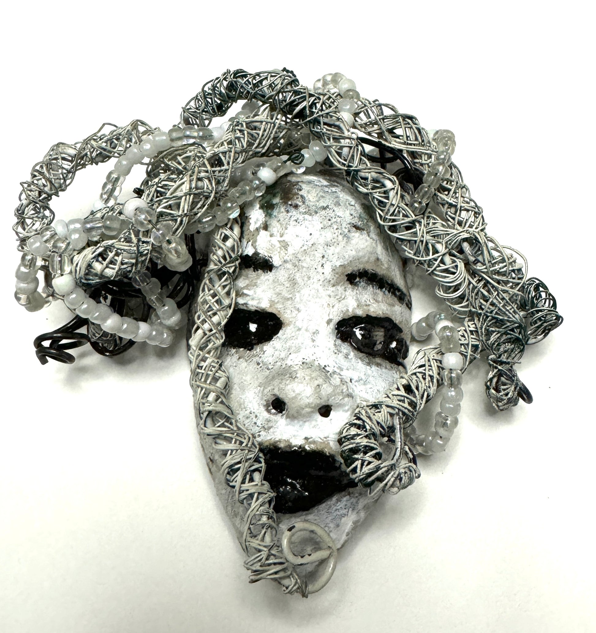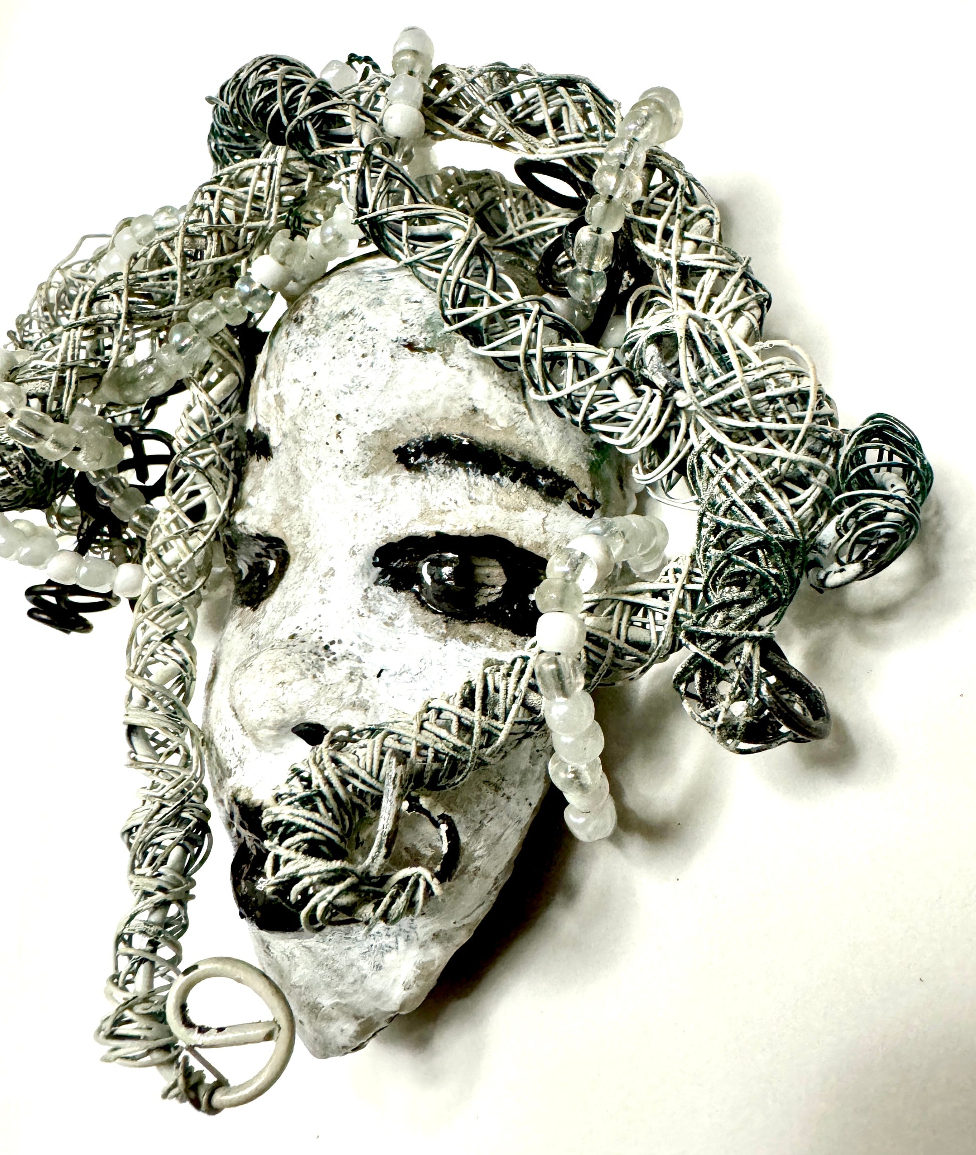 Femi is a 4 x 5" raku-fired mask boasting an off-white hue and intricate detailing, with almost 15 feet of 24-gauge wire. Its nature-inspired portrait makes it an ideal piece for outdoor art collections or as a home décor item.