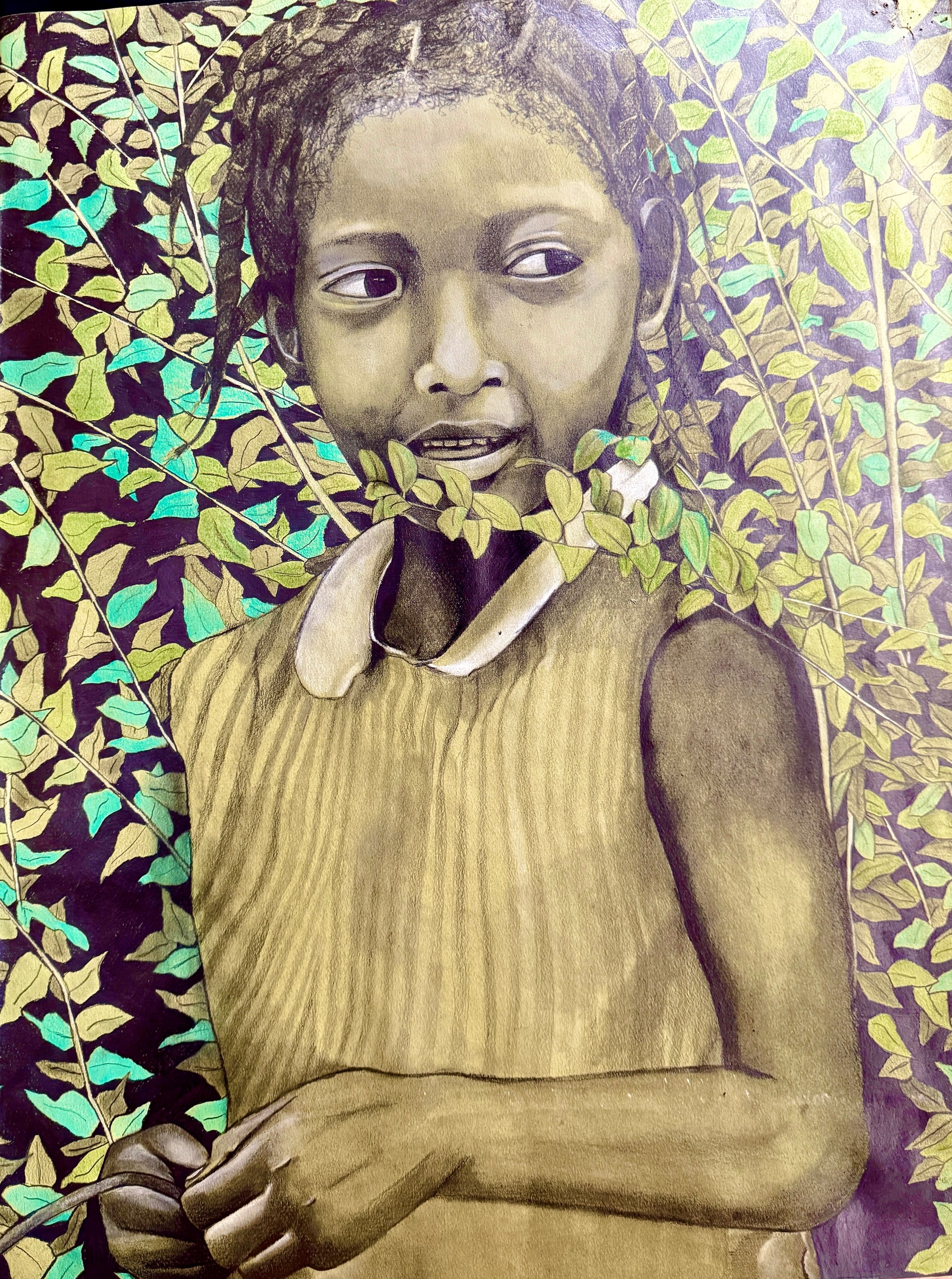 Good morning is a captivating 18 x 24“ pencil sketch of a beautiful young girl wandering through a thick lush evergreen. Her infectious smile is bound to lift spirits and elicit a joyful good morning in response. With her charming personality and pragmatic attitude, it's impossible not to reciprocate with a smile and a warm welcome. "Highlighting the beauty of nature and human emotion, Good Morning captures the essence of positivity and creates a welcoming atmosphere. With its engaging sketch and infectious smile, this artwork is sure to boost moods and bring joy to any space."