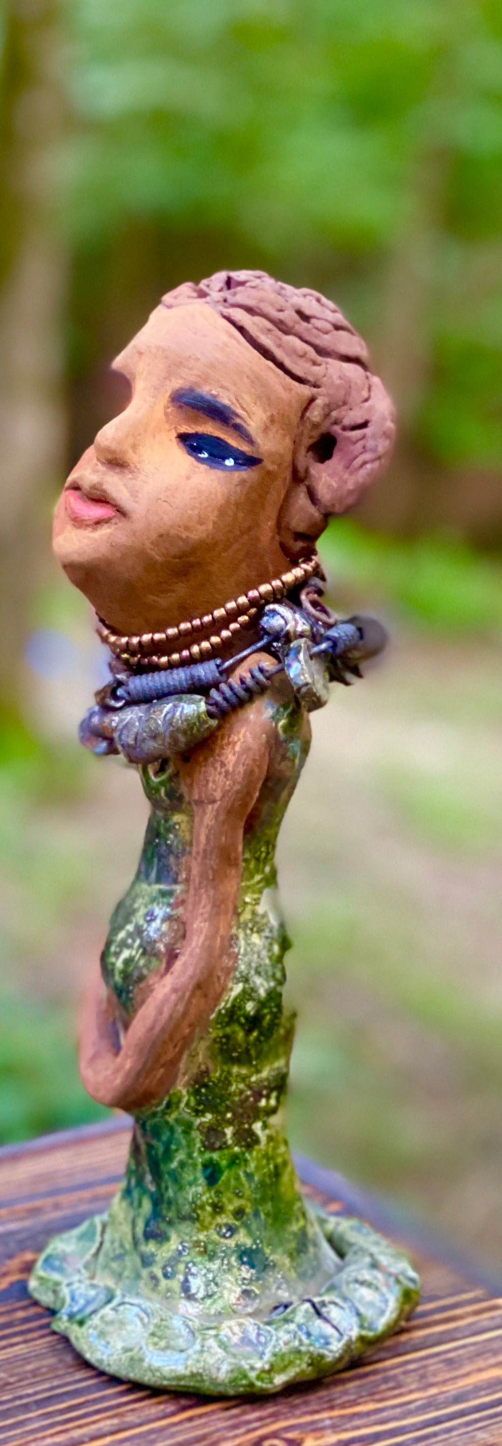 Gretaya stands 11" tall, 4" wide, and 4" deep, and weighs 2.5 lbs. Her complexion is a warm honey brown and lips a rosy brown. Her braided hairdo adds a unique touch to her look. A dazzling metallic green-and-copper glazed dress, paired with two gorgeous raku beaded necklaces, completes her look. Her long eyes, slightly open, seem to be searching for a new home. Have questions? Gretaya will be sure to bring conversation and wonder to your home!