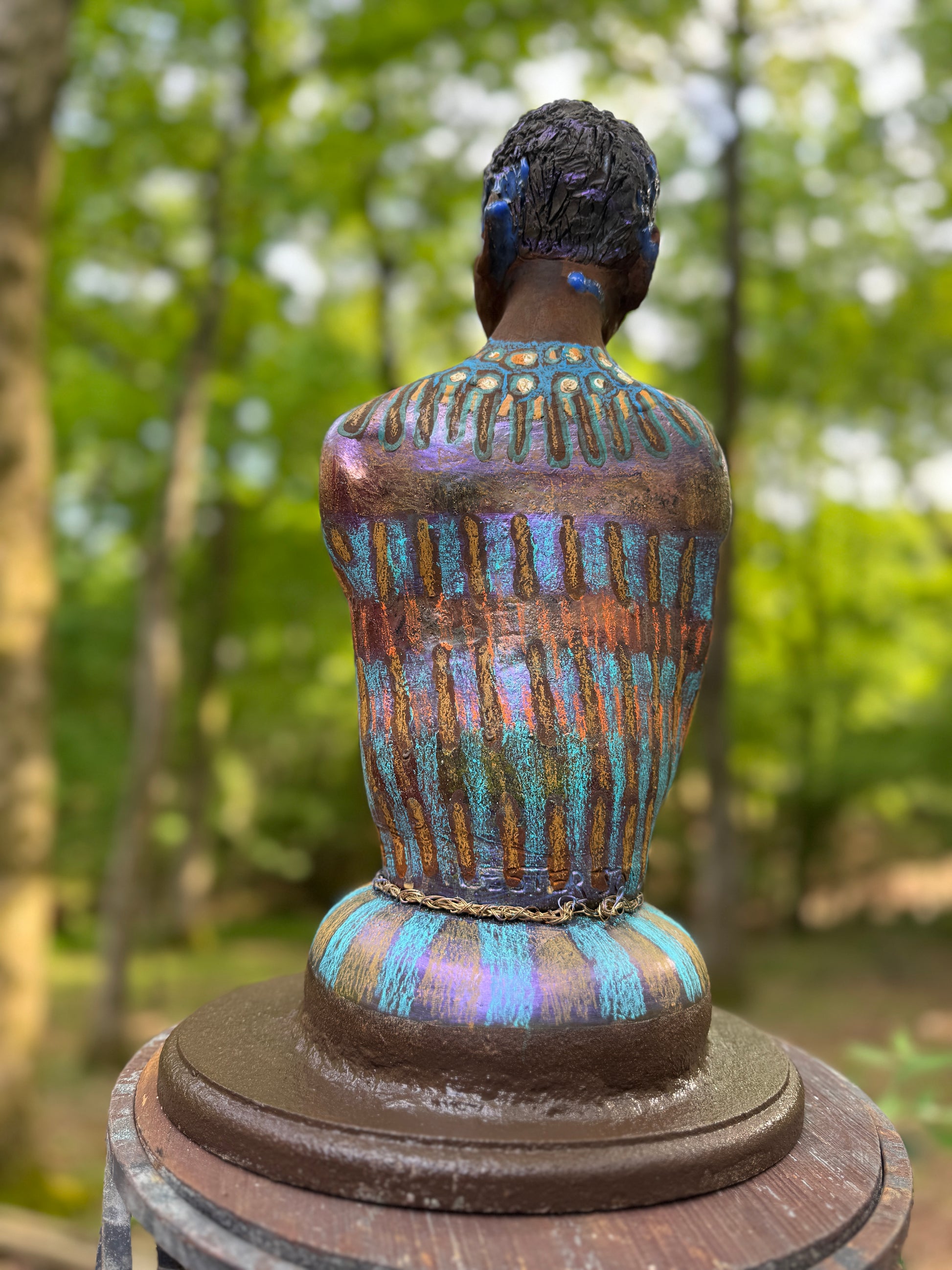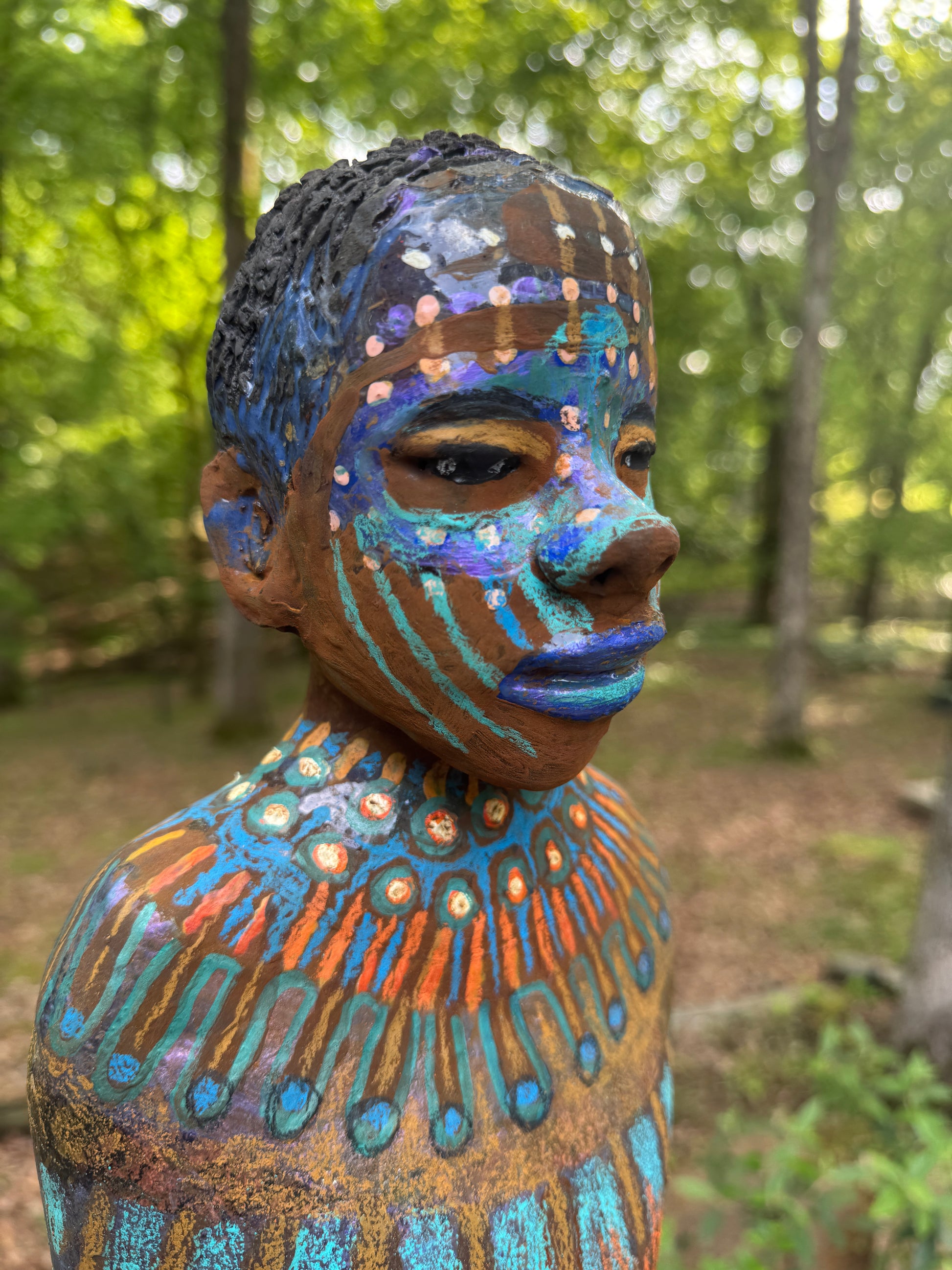 Guardian of the Ancestors is a striking raku-fired ceramic bust that reflects Lester Jones’ deep reverence for African heritage and ancestral presence. The figure, poised with serene confidence, is adorned in meticulously hand-painted ceremonial markings in vibrant blues, oranges, and purples. These rhythmic, symmetrical patterns evoke body painting traditions used in rites of passage and spiritual protection.