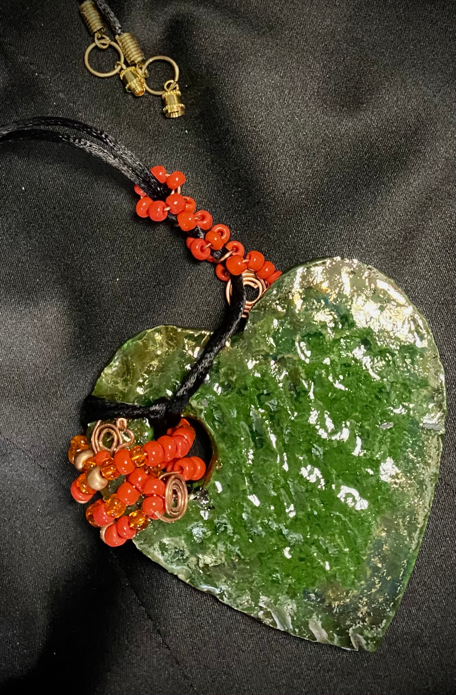 - It holds a spiral of green mini beads on a spiral copper wire.