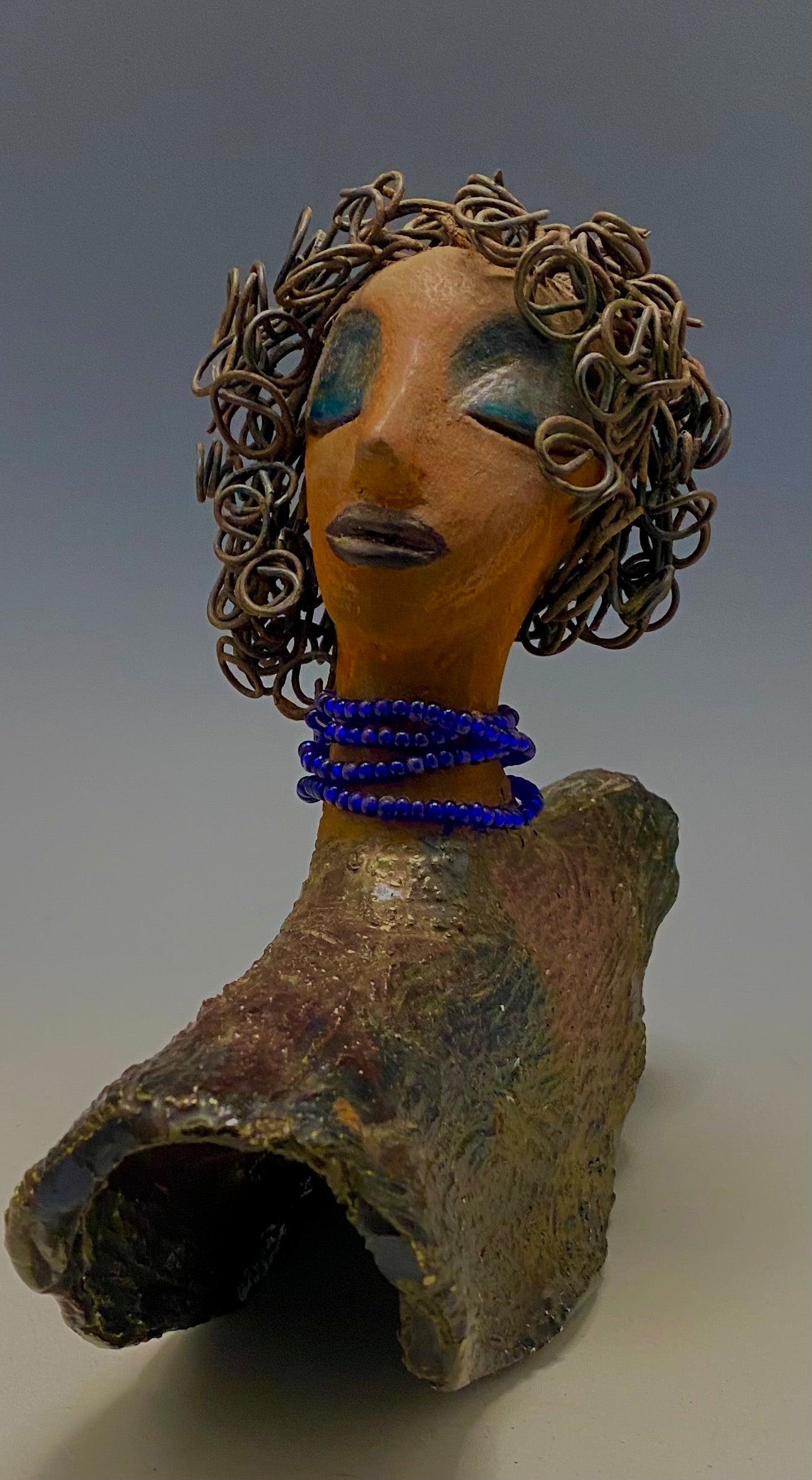 Measuring 8" x 8" x 3" and weighing 2.06 lbs, Helen is a sight to behold with her honey brown complexion, copper-glazed robe, and blue eye shadow that complements the blue beaded strand around her neck. Her curly wire hair extends over 20 feet, and she and her sister Hannah make a beautiful duo.