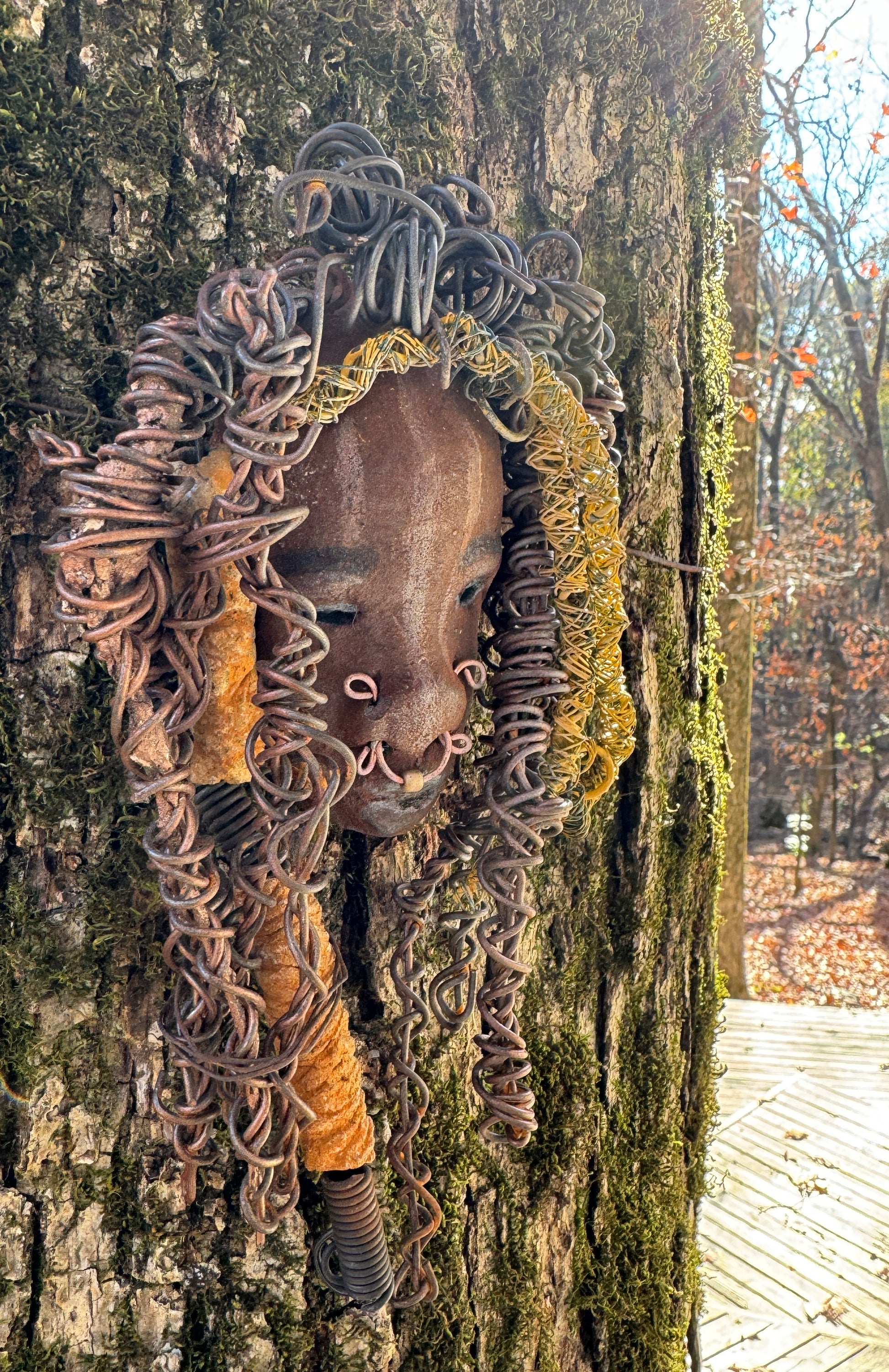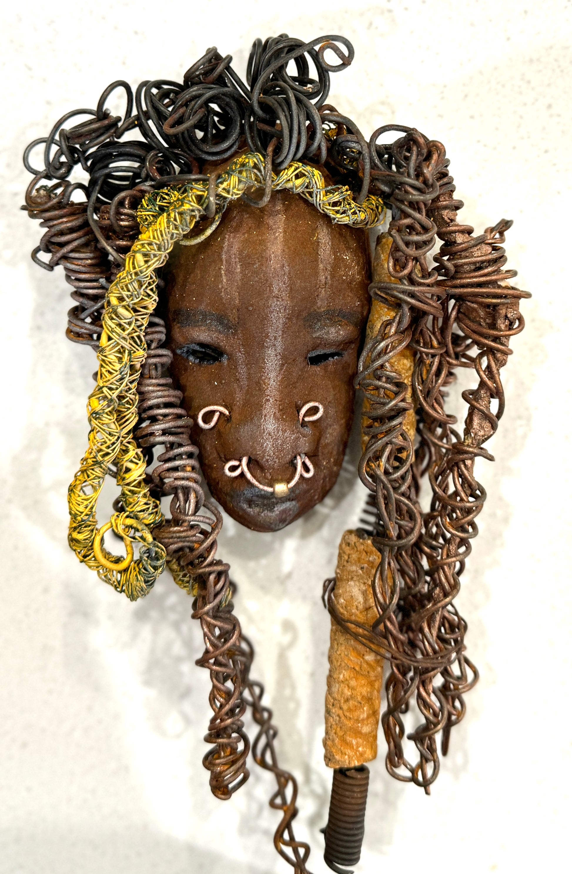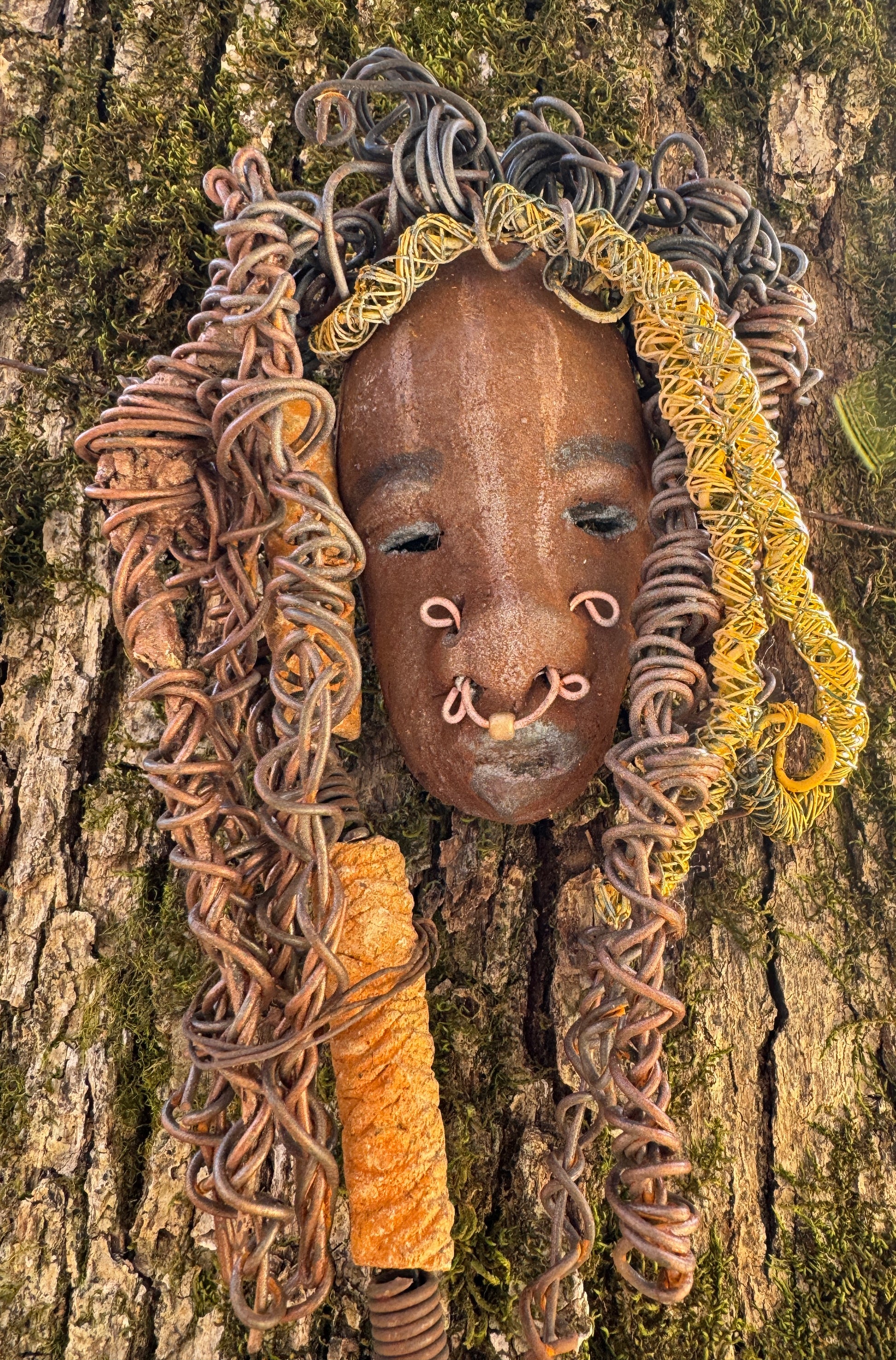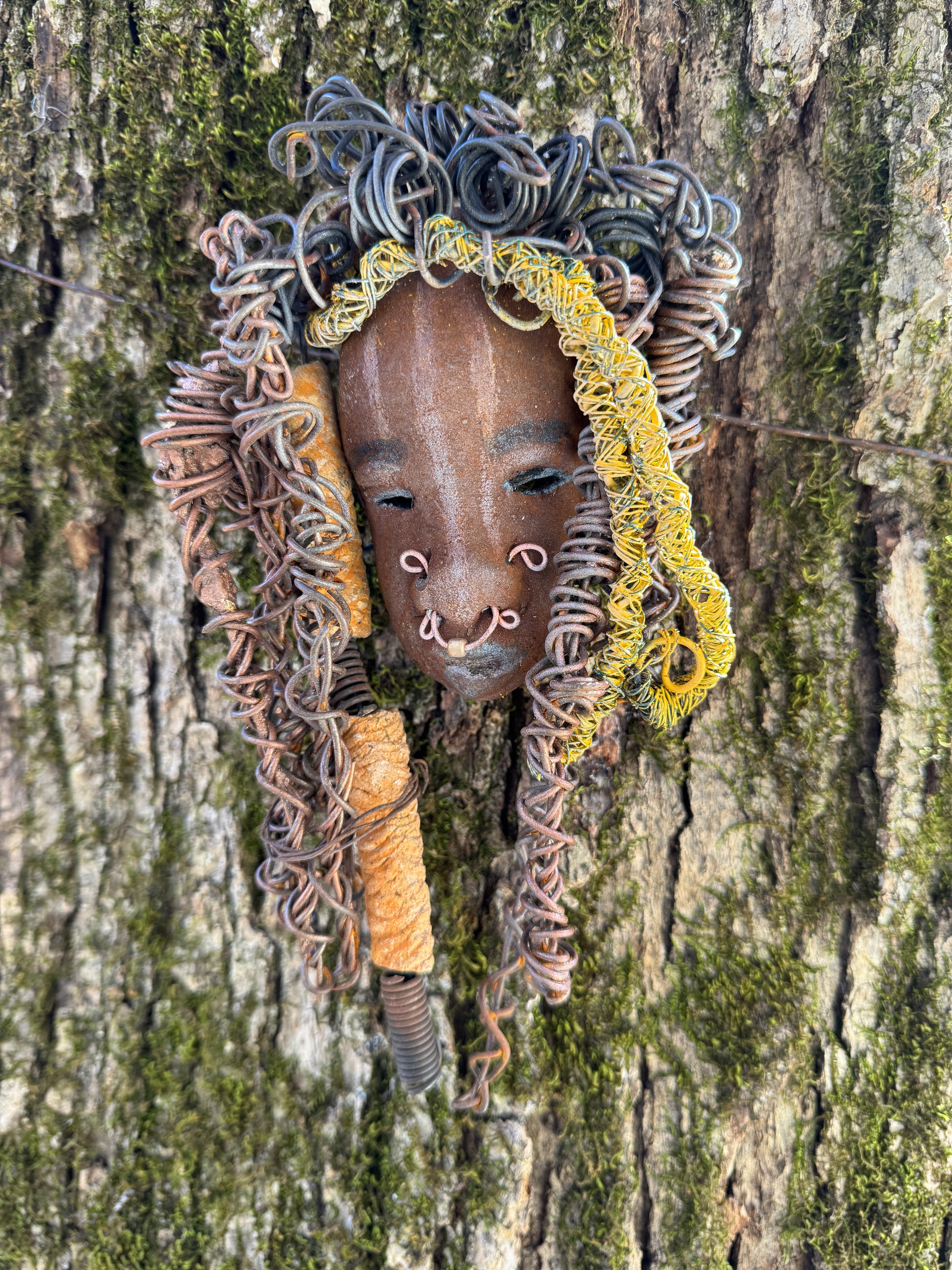 At 5" x 8" in size, Ike makes a stunning addition to walls, trees, and shadow boxes. His signature brown and amber braided hair is ornamented with handcrafted Raku beads, while his skin has a warm honey brown hue. Each piece is equipped with over 20 feet of top-notch 16 & 24-gauge wire in the hair. This fashionable sculpture will bring a modern flair to any room - simply place it in a shadow box and enjoy!