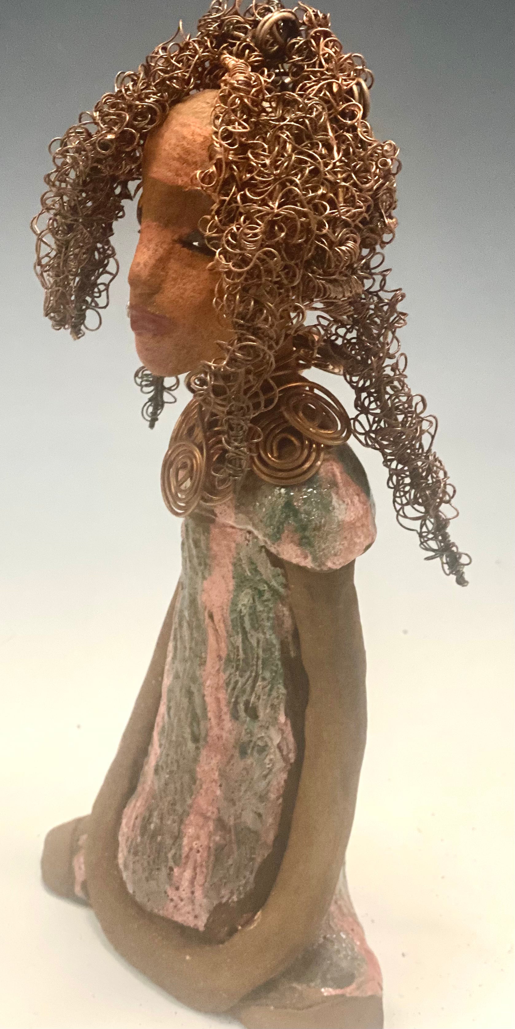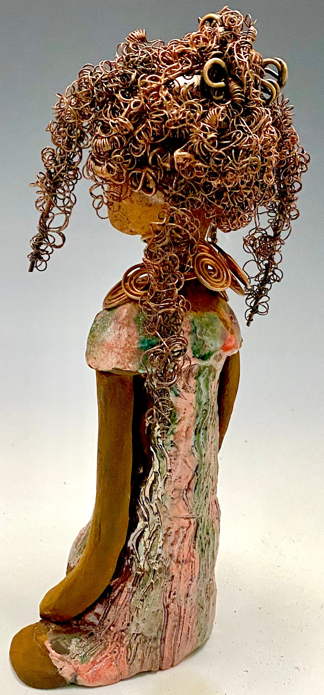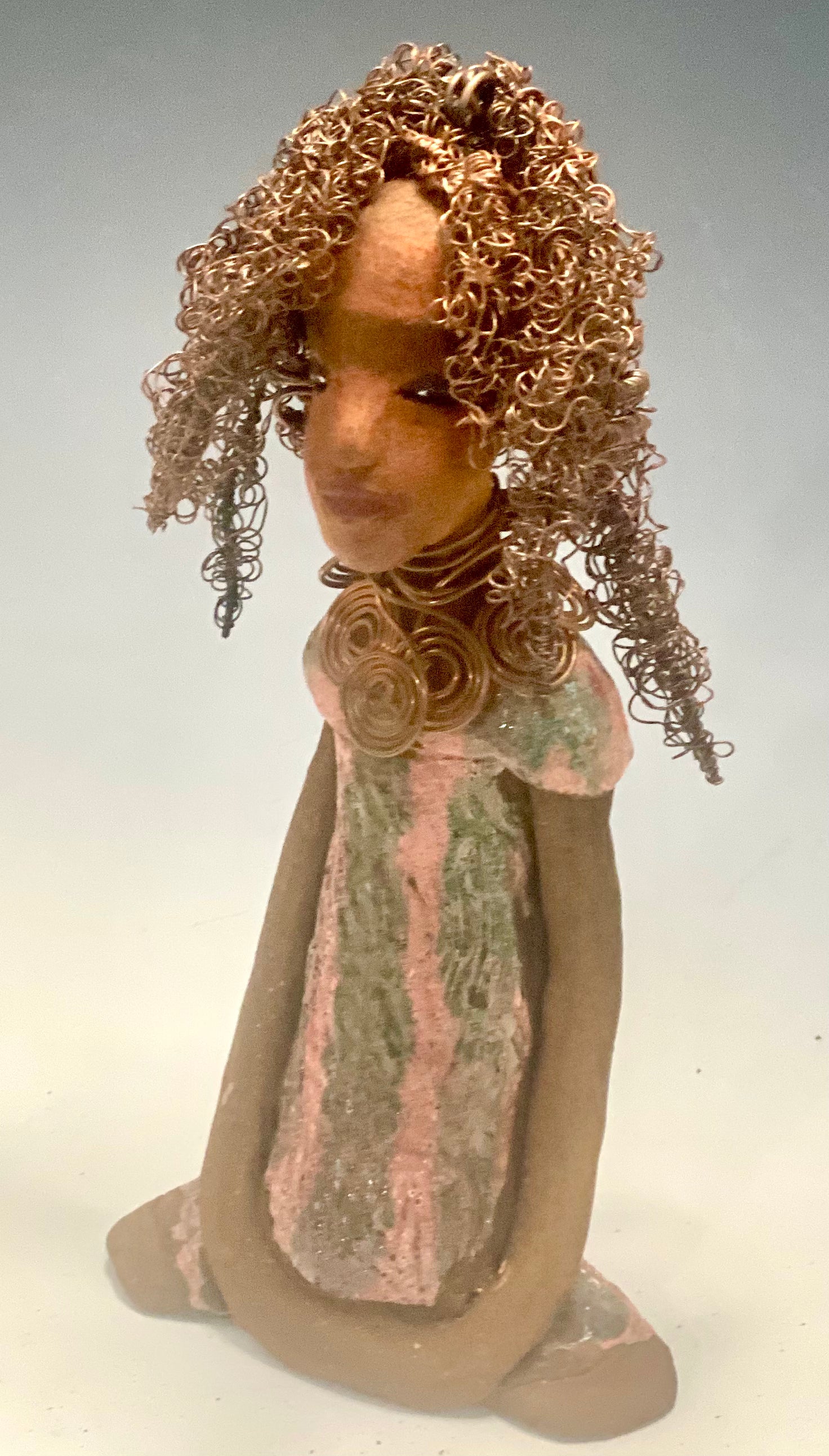 Jada's copper coiled necklace and wire hair completes her aesthetic, standing 9" x 4.5" x 2.5" and weighing 1 lb. Her two tone honey brown complexion is accentuated by her metallic glaze dress featuring copper red stripes, her long arms resting comfortably at her side. Consider adding Jada to your home or office! Have inquiries?