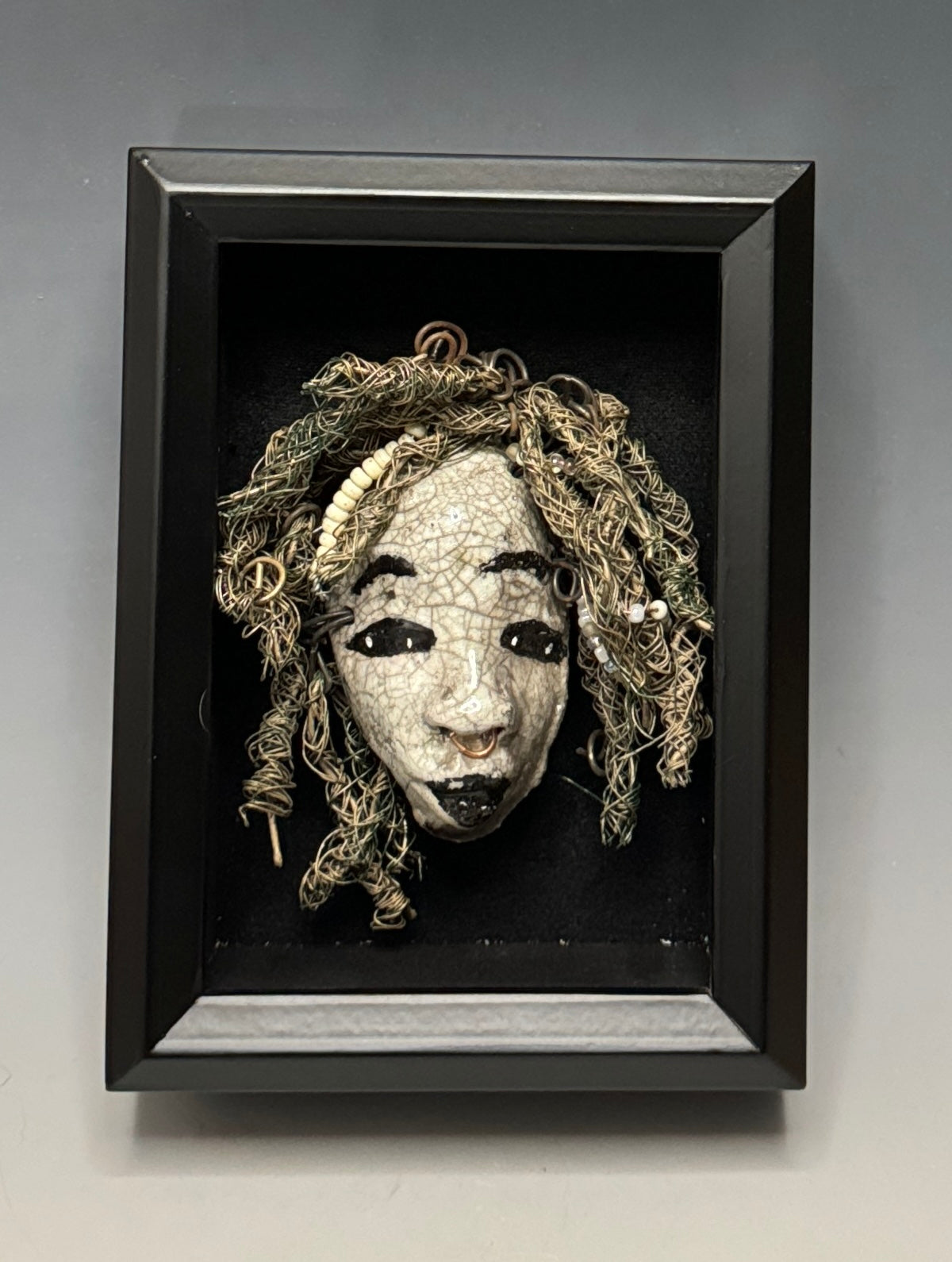 Jami is a 4x 6” raku-fired mask featuring a pristine off-white color palette. Her intricately detailed hair is composed of nearly 15 feet of 16 gauge wire, delicately adorned with dainty beads. Set in a backdrop of nature, her portrait makes a wonderful addition to any outdoor art collector, or for decorating the home.
