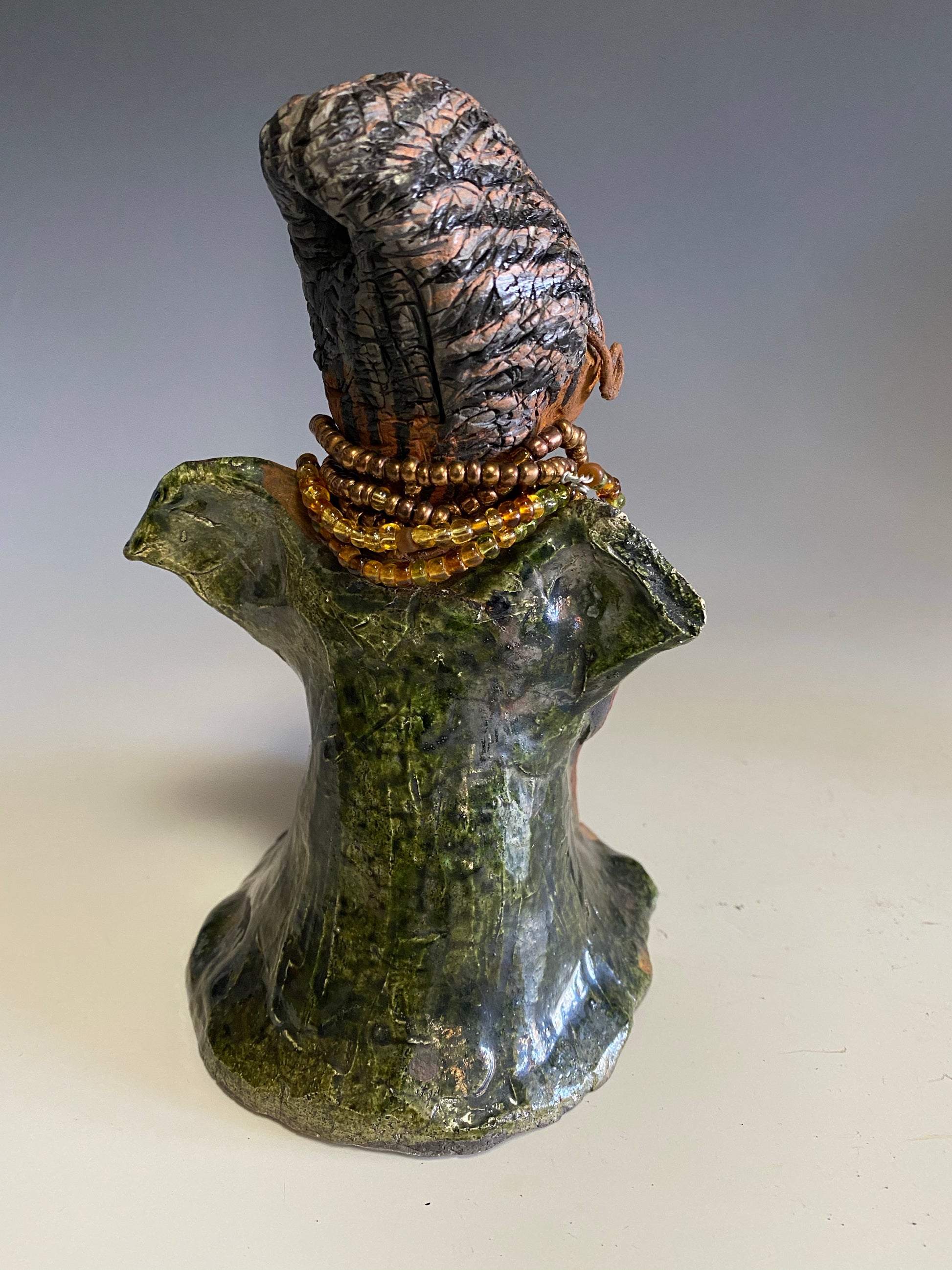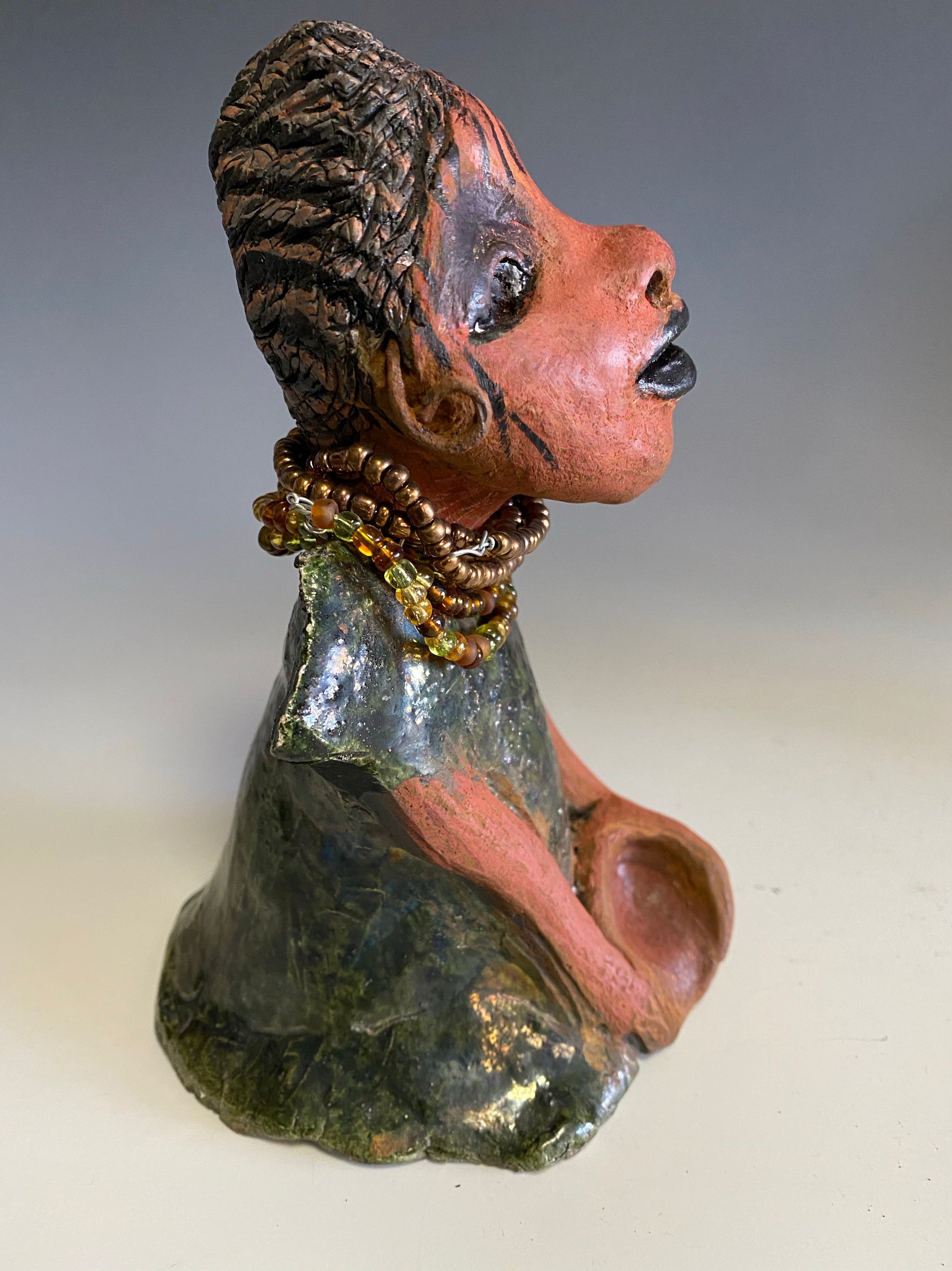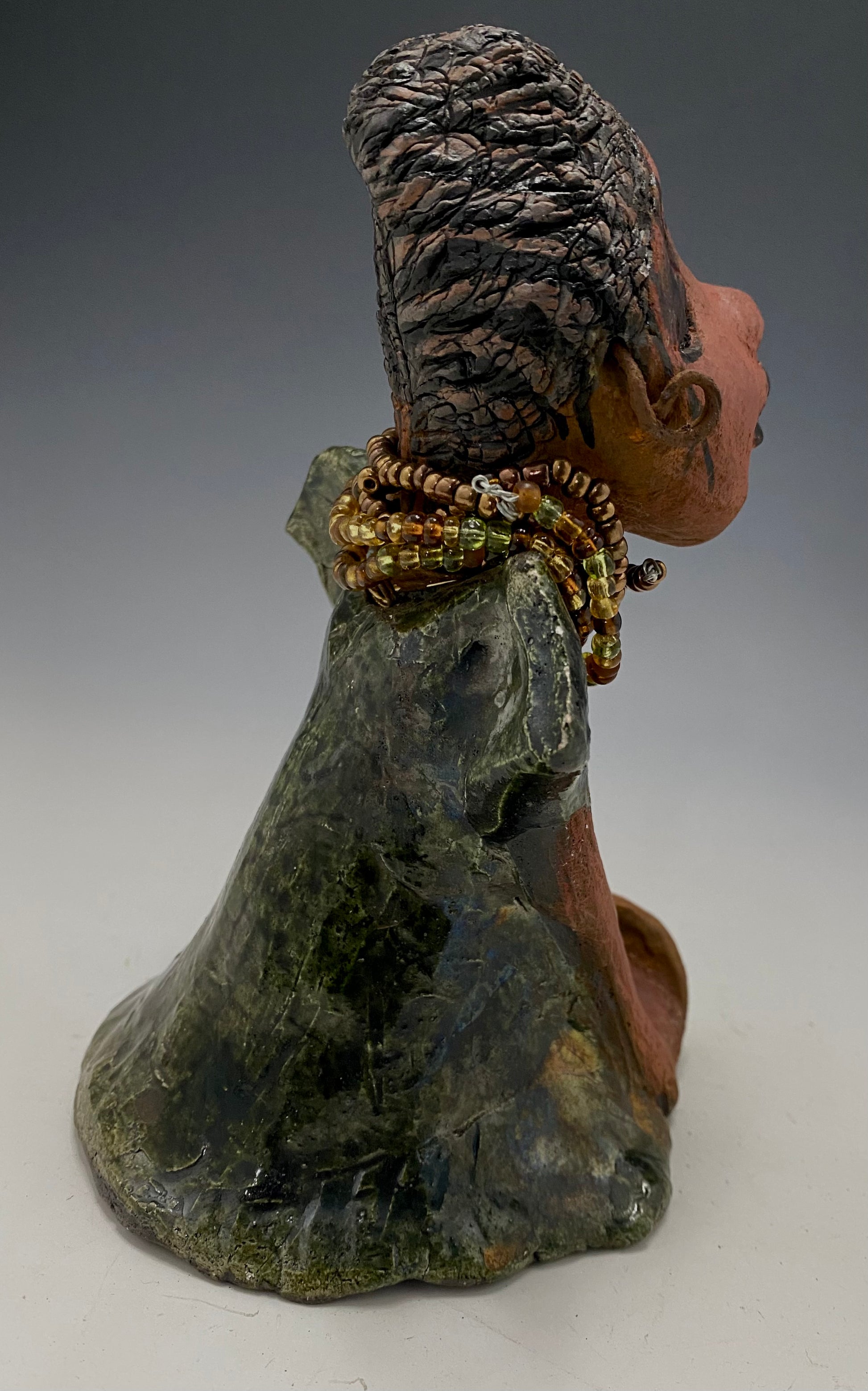 Introducing Janet! Standing 7" x 5" x 5" and weighing 1. lbs, Janet has a charming honey brown complexion and black etched hair in a bun with braids. Outfitted in a metallic copper green dress, Janet also wears a stunning beaded necklace.