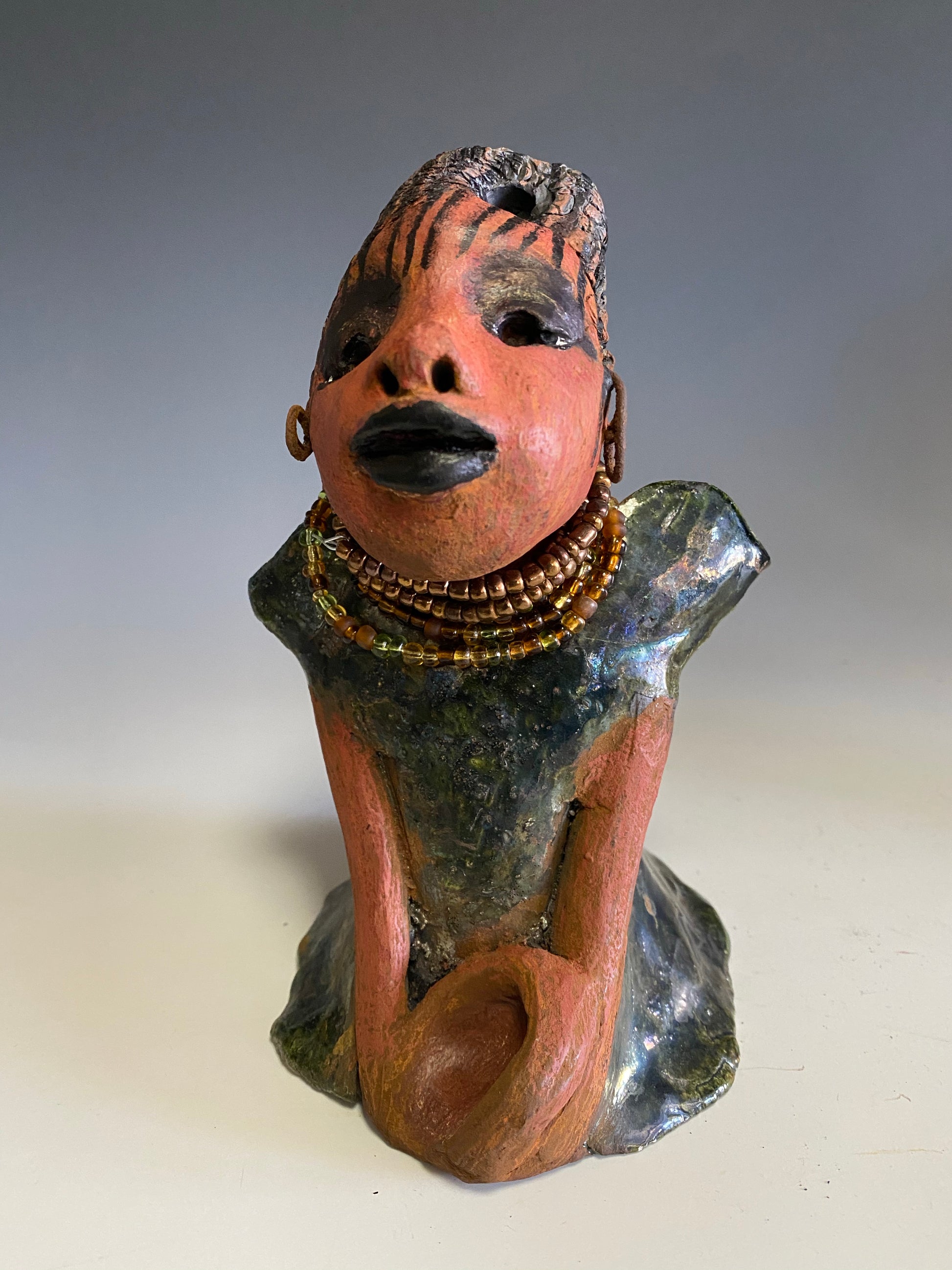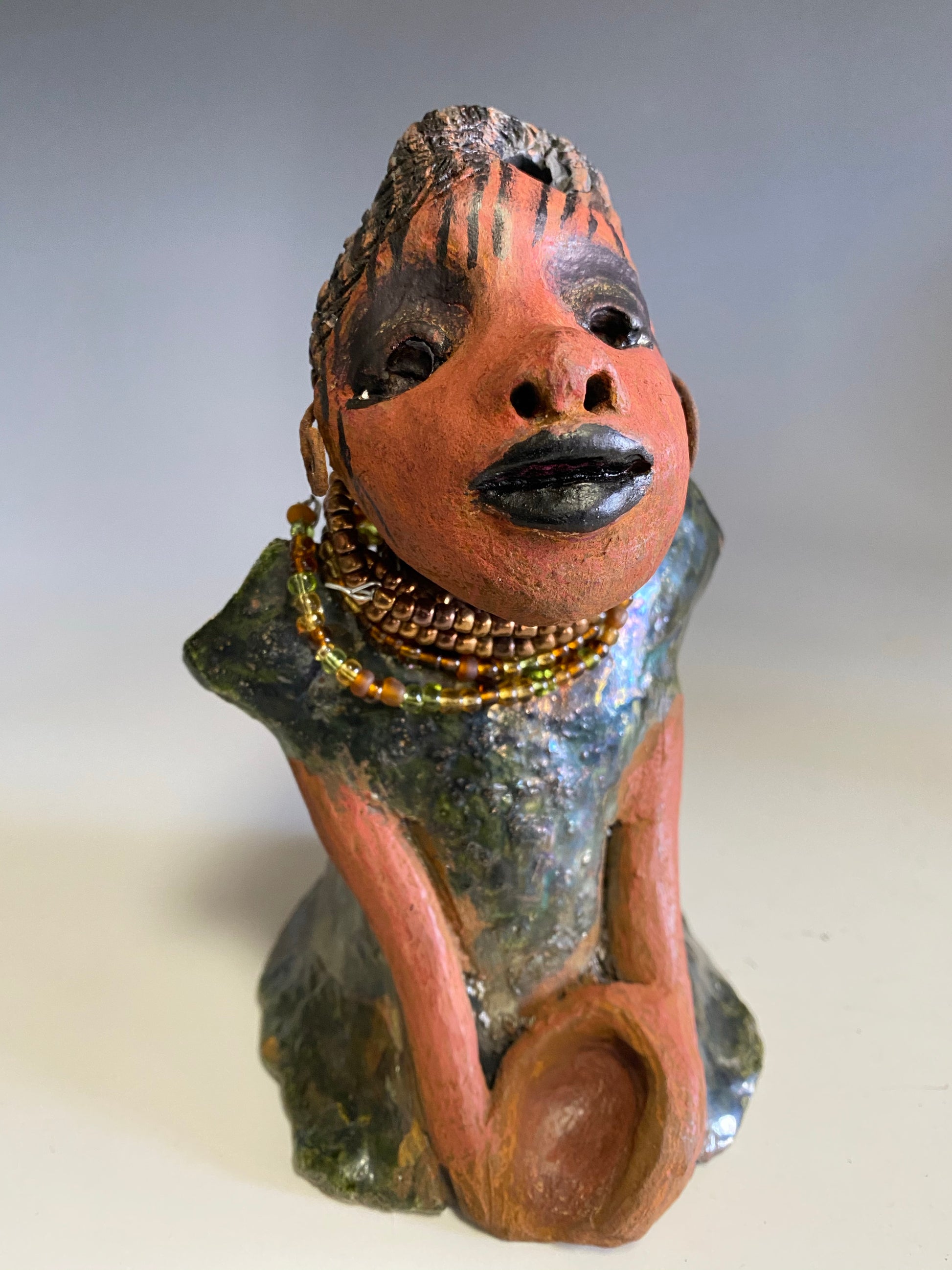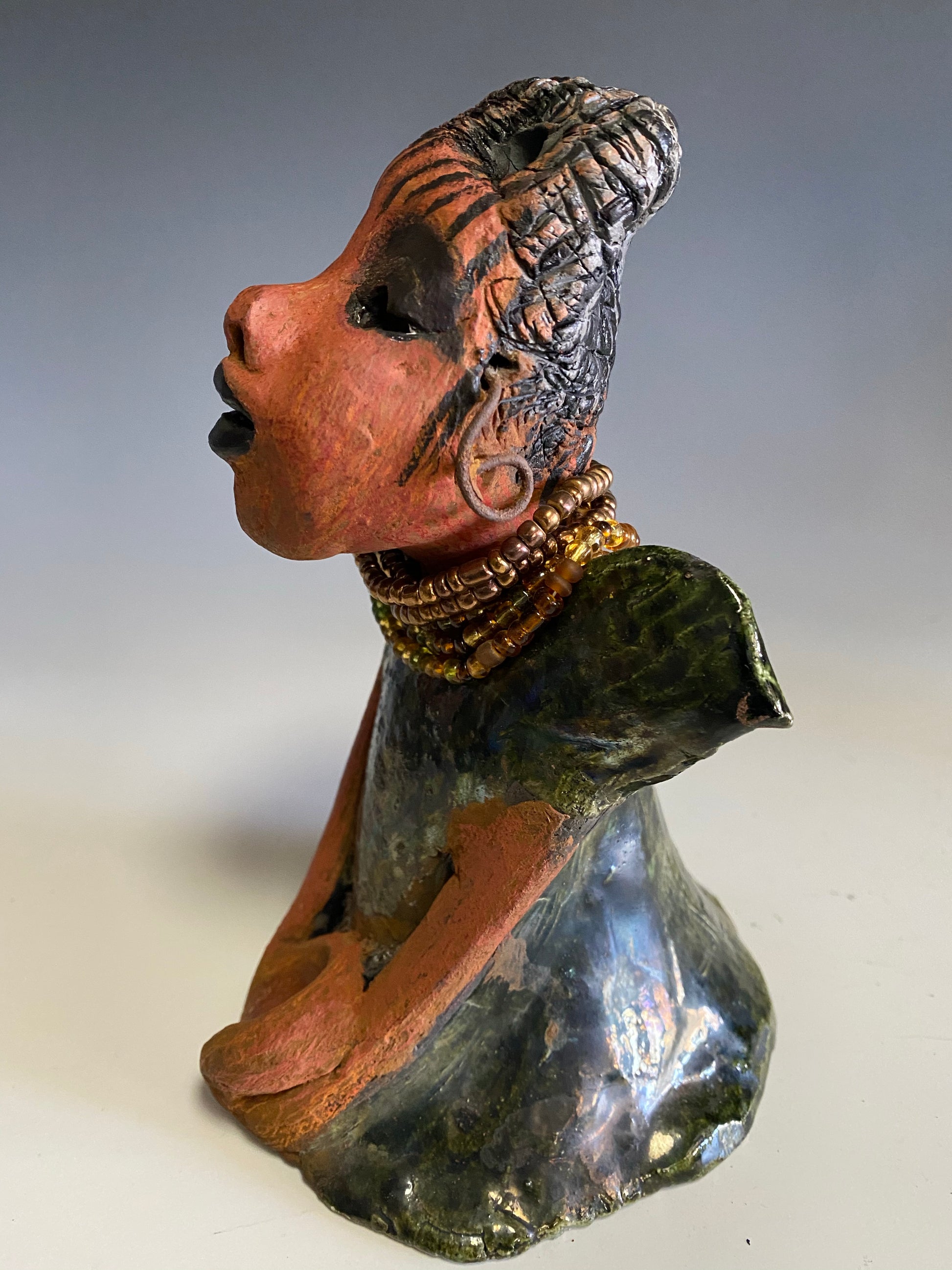 Introducing Janet! Standing 7" x 5" x 5" and weighing 1. lbs, Janet has a charming honey brown complexion and black etched hair in a bun with braids. Outfitted in a metallic copper green dress, Janet also wears a stunning beaded necklace.