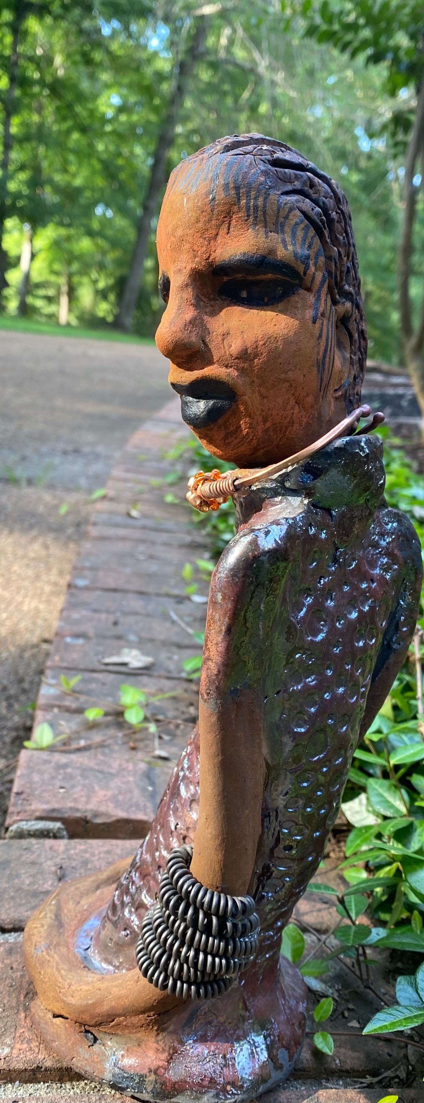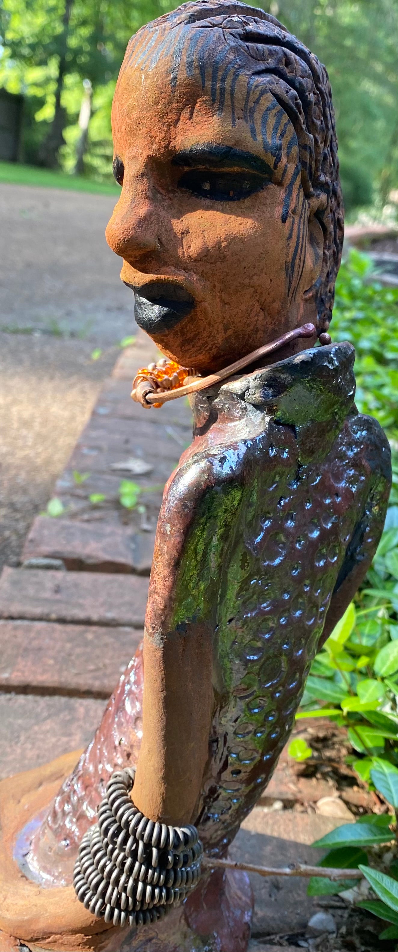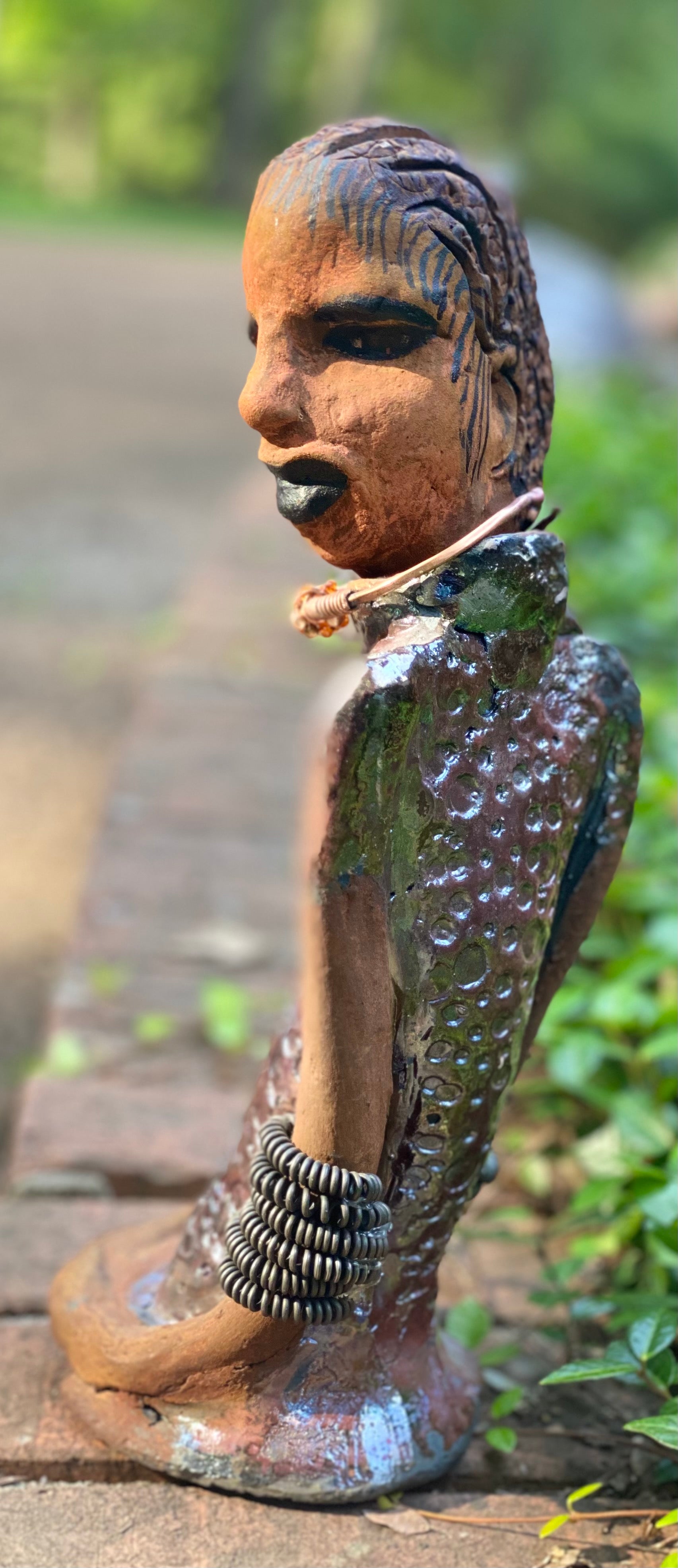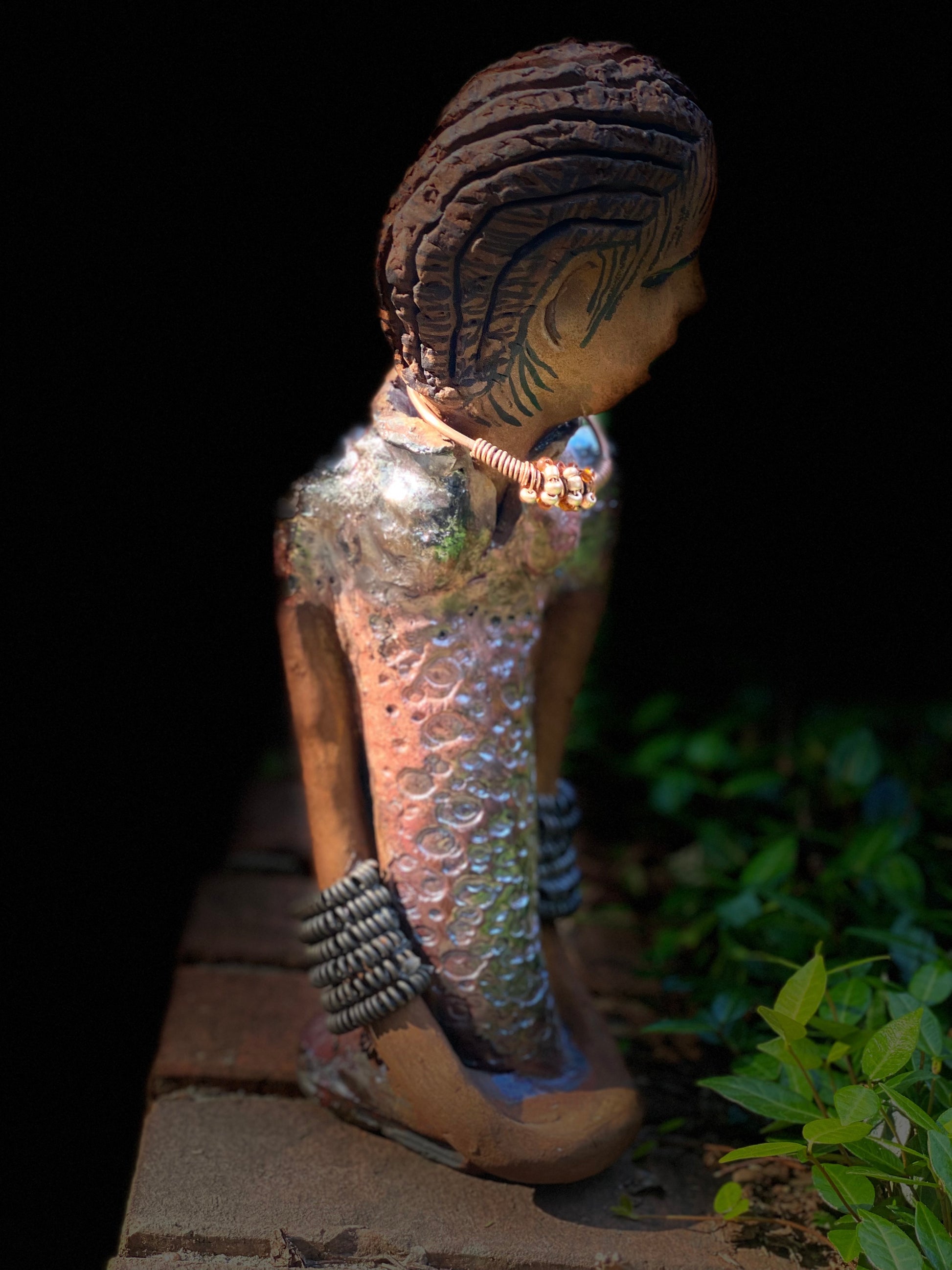 Introducing Jessie! Standing 12" x 5" x 4.5" and weighing 1.03 lbs., she has a stunning honey brown complexion and is dressed in a copper-green alligator dress with a strand of amber-beaded spiral copper bracelet. She is a sophisticated lady that will bring grace to any home. Her hair is adorned with clay braids instead of wire.
