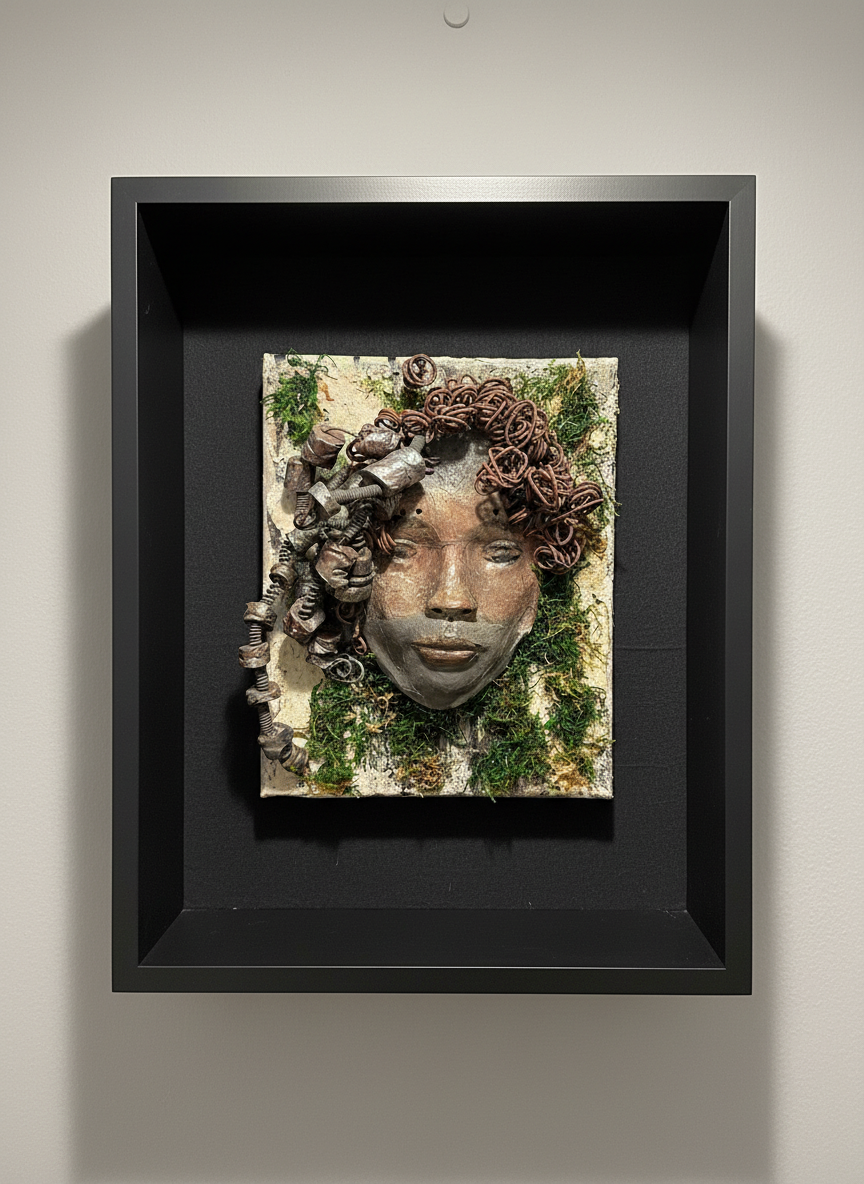 Kai is an 8 x 10 canvas mounted mixed media mask. It weighs approximately 3 pounds and features over 20 feet of 16 gauge wire and 20 handmade Raku fired beads. Her two tone complexion is highlighted by the lush tree bark emulated on the canvas. Kai also looks great in a black shadow box.