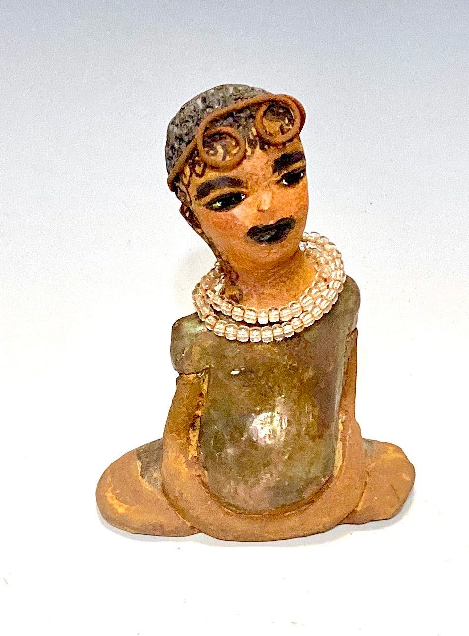 Karisha stands 6" x 4" x 3" and weighs 8.7 oz, making her a great starter piece in the Herdew Collection. She is dressed in a glossy green dress with a matching hat and wire hair styled into curls. She sits in a yoga pose, with her arms resting at her side.