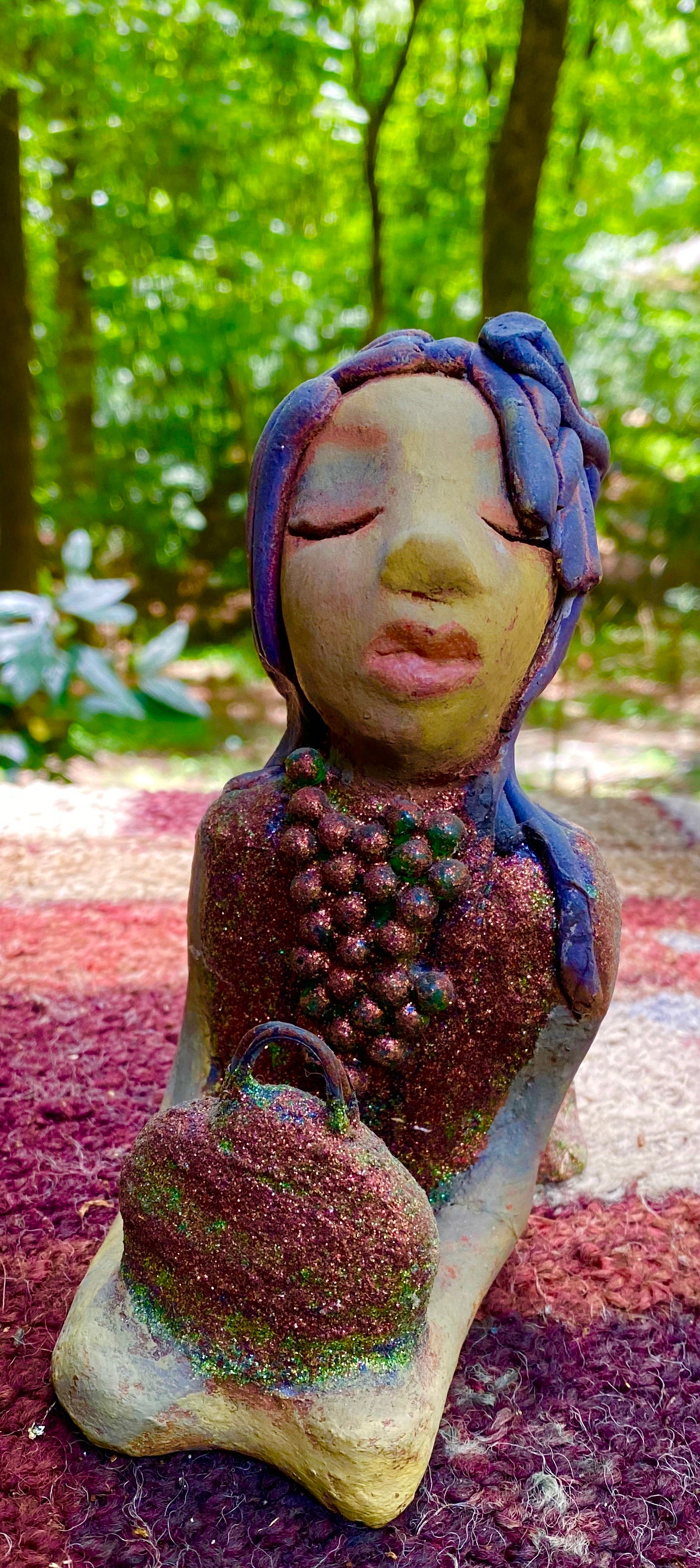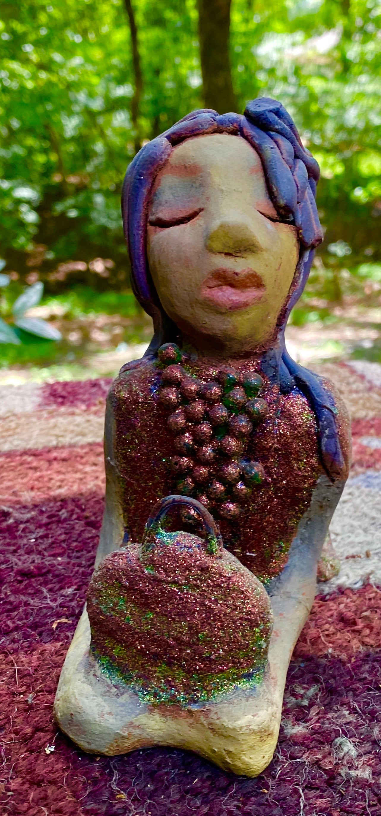 Lacey measures 6" x 3" x 7.5" and weighs 1.08 lbs. Her complexion is beige olive green, complemented by ruby red lips. Her hair is made of coiled clay and she carries a handbag with a copper glittered dress. Questions?