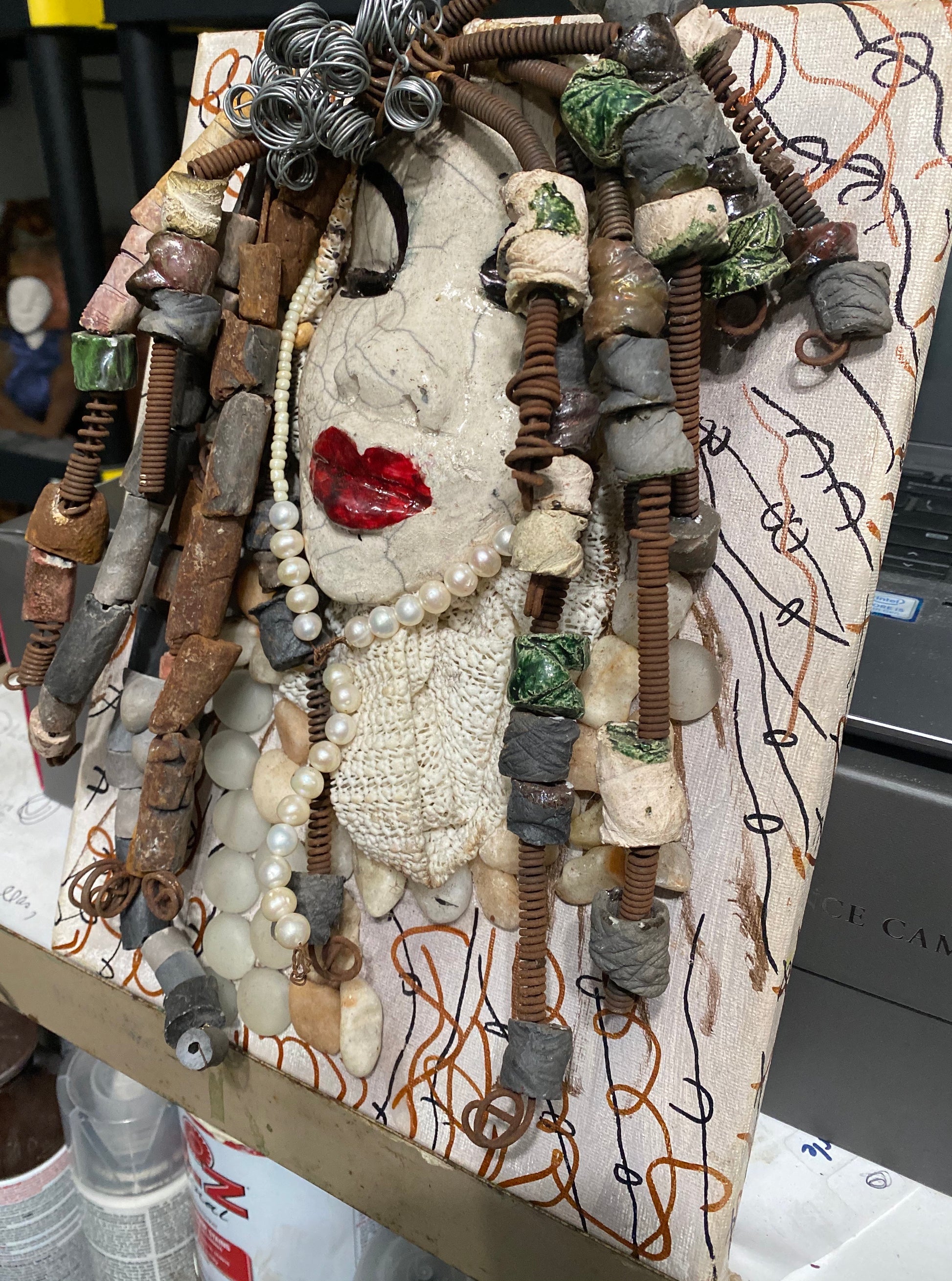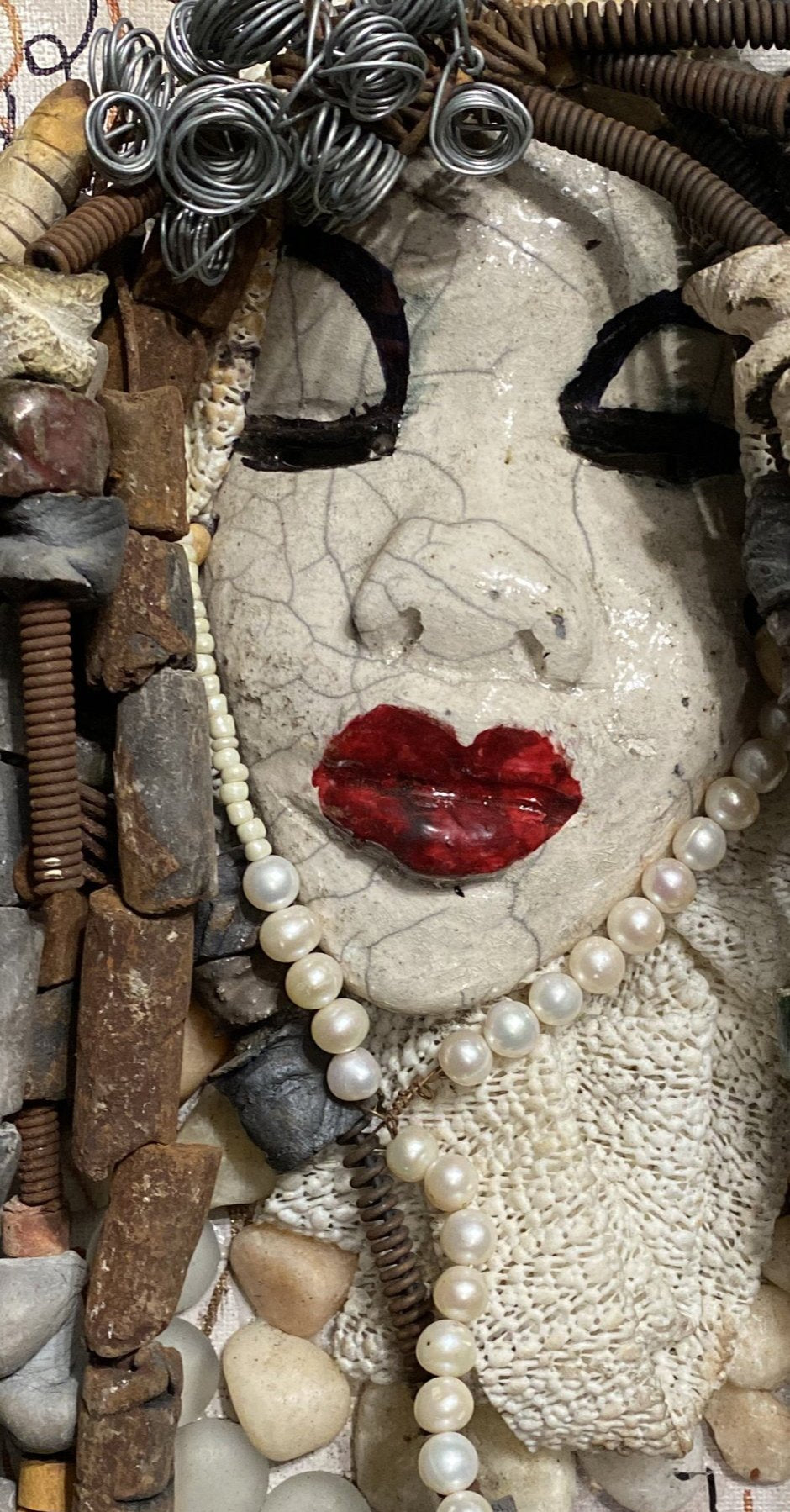Inspired by my visit to the Smithsonian Museum of African Art, I began crafting art. From this creative journey, Savannah was born. Mounted on a 9"x12" painted canvas, she weighs 2.12 lb and boasts a white crackle face with ruby red lips. Moreover, she is adorned with hand coiled wire, multiple raku beads, rocks, and a textured off-white cloth. Ready to be hung, Savannah's eccentricity is only matched by the convenience of free shipping!