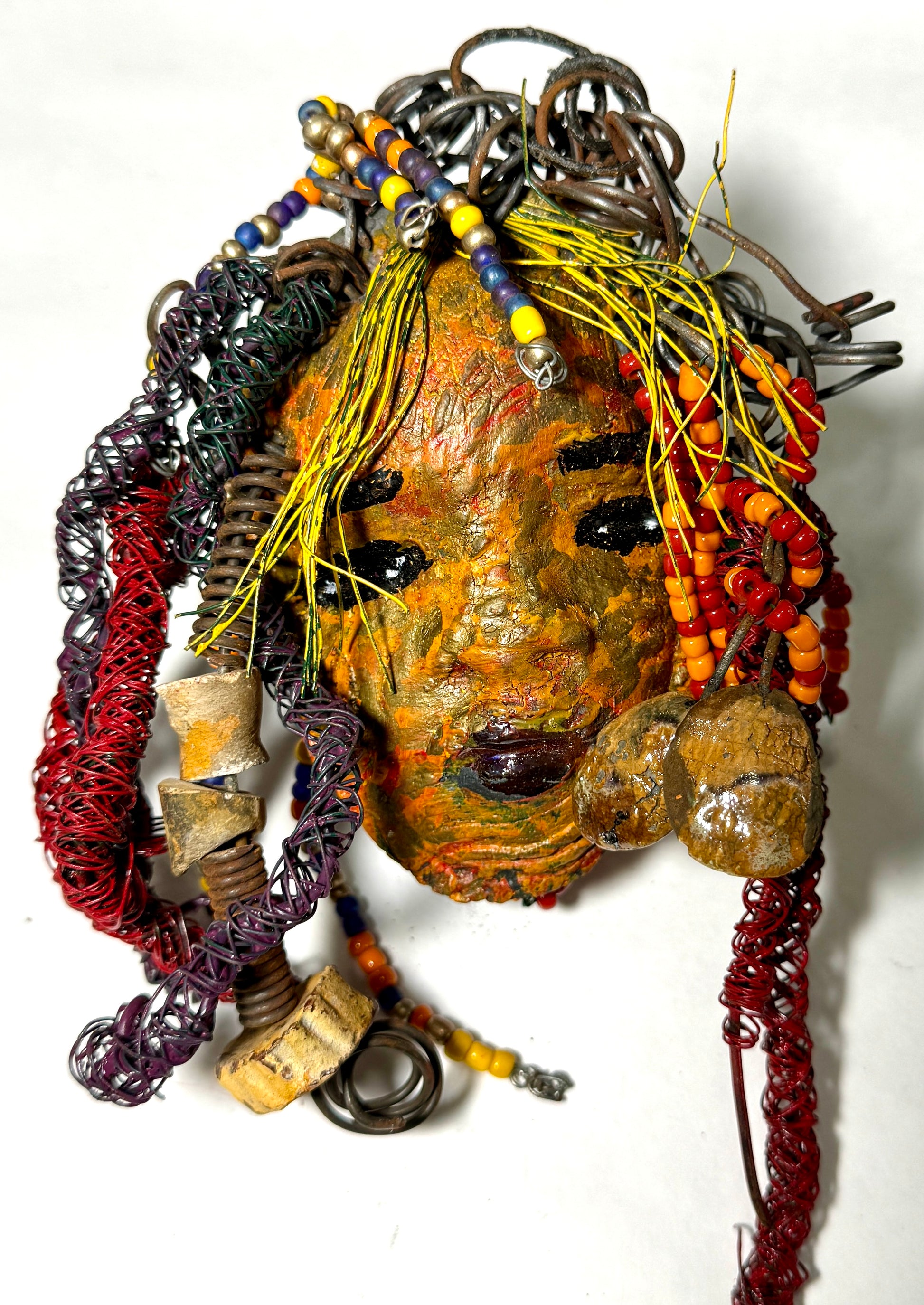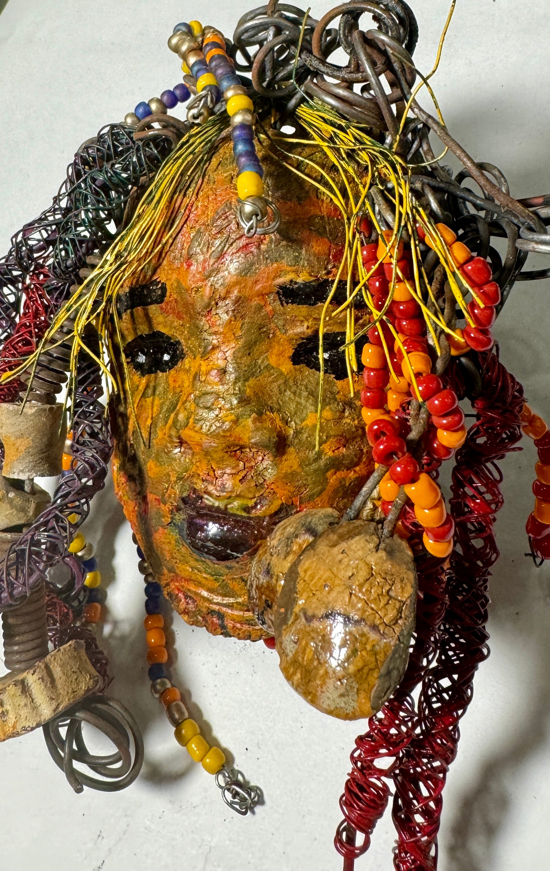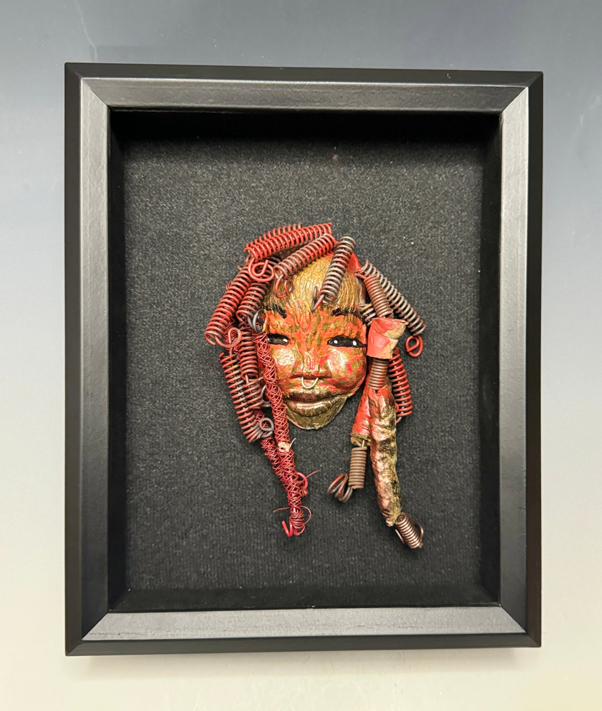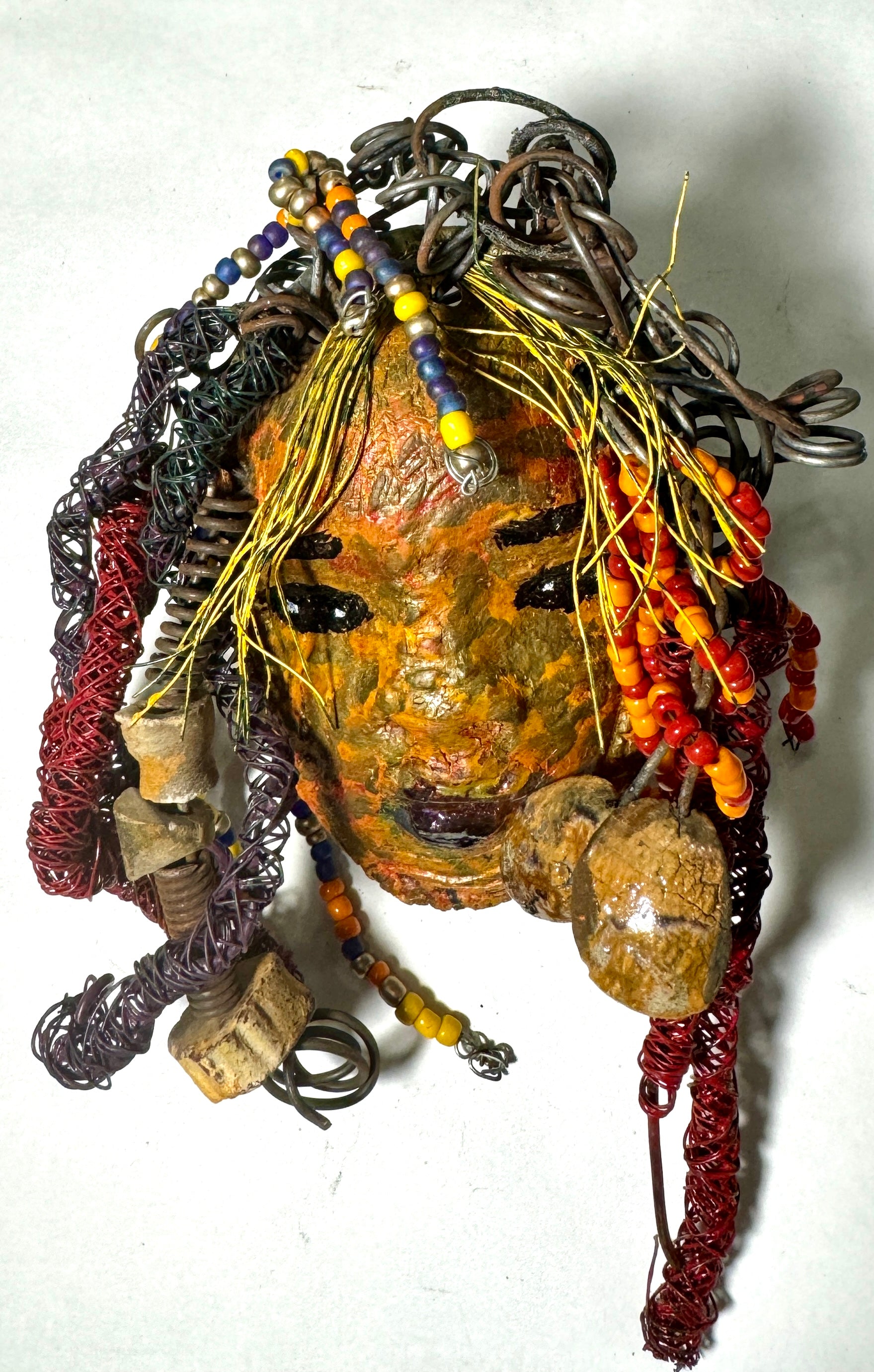 Lena is a 5" x 5" x 2" raku fire mask that uses both 16 and 24 gauge wires in her headdress. With multicolored skin and beading accents, she is the perfect introduction piece from the HerDew collection. The shadowbox is not included