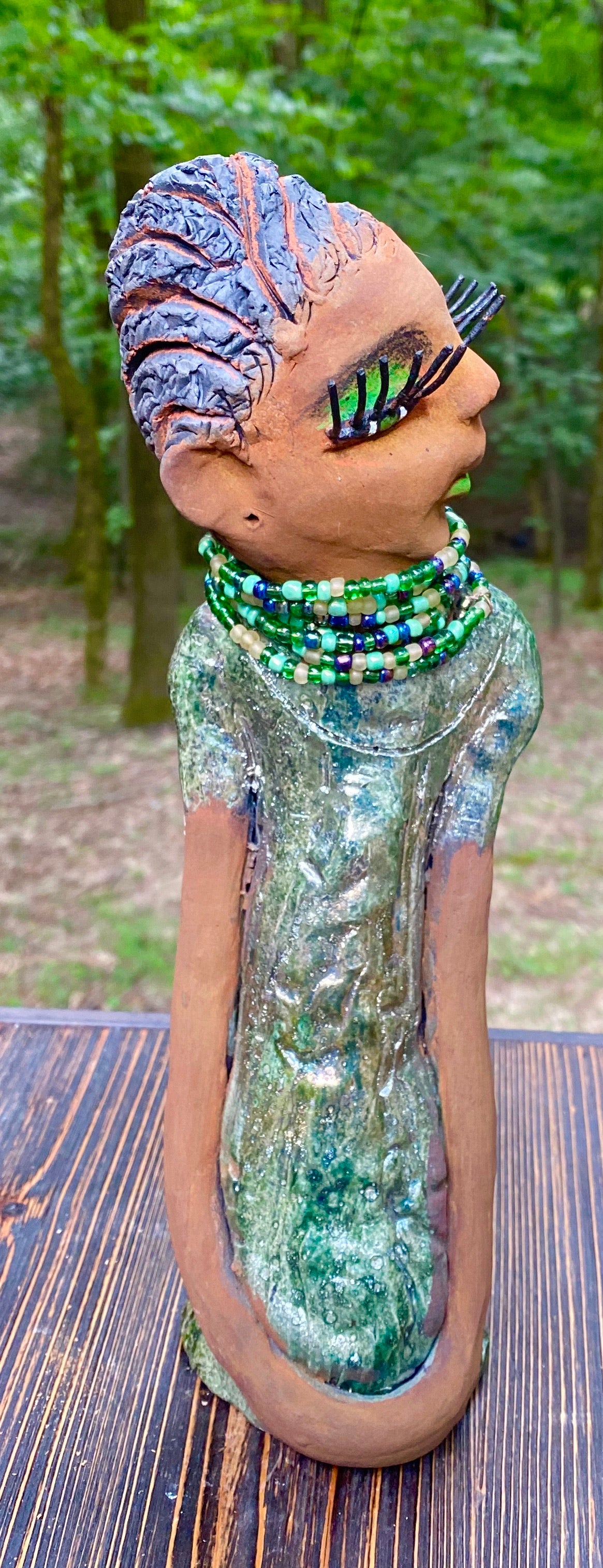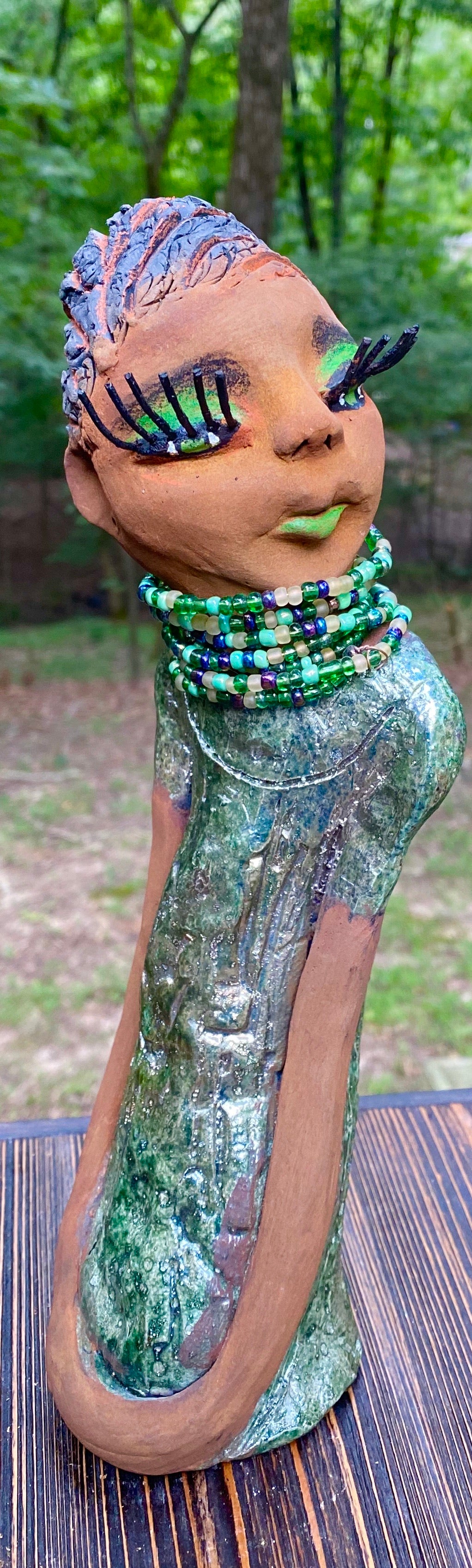 Marissa stands tall at 11.5"x3"x3.5", weighing only 2.5 lbs. Her beauty is captivating; honey brown skin, reddish brown lips, and a short black clay braid. Her dress is uniquely adorned with vibrant metallic copper-green glaze, and her eyelashes are the longest in the world. Her green eyes look up with a hope of joining your family.