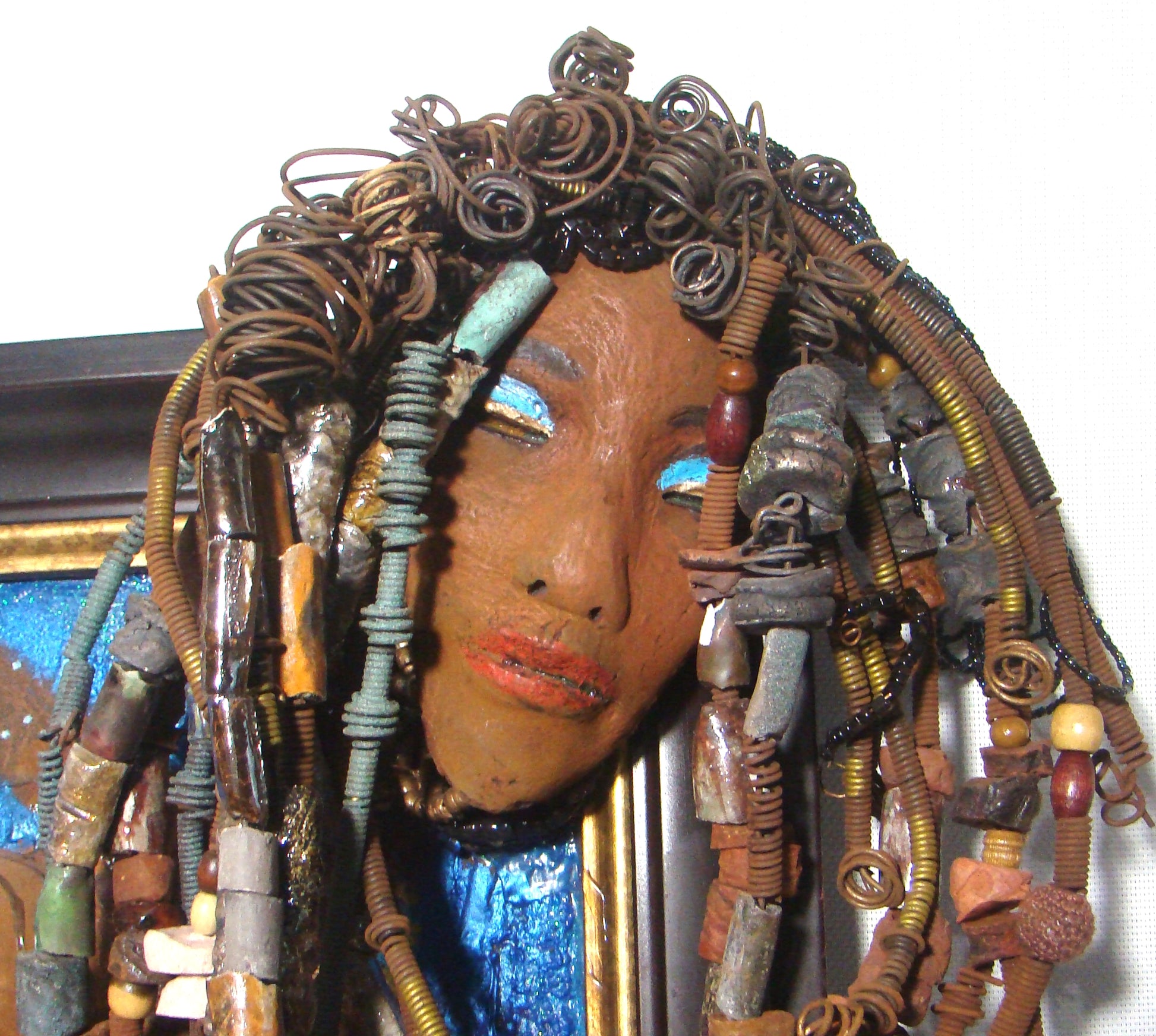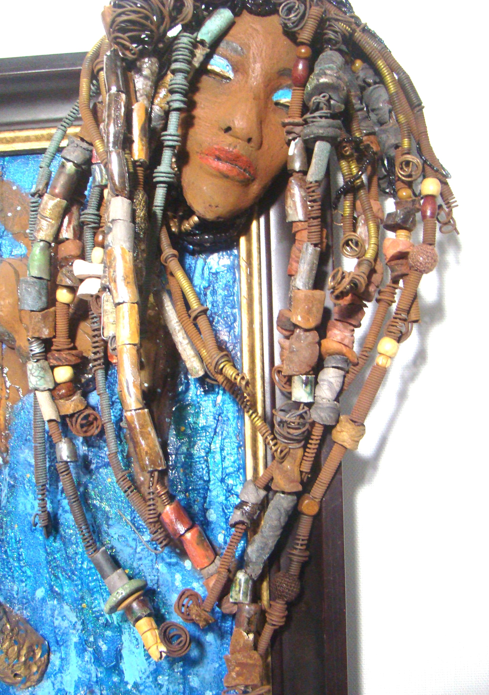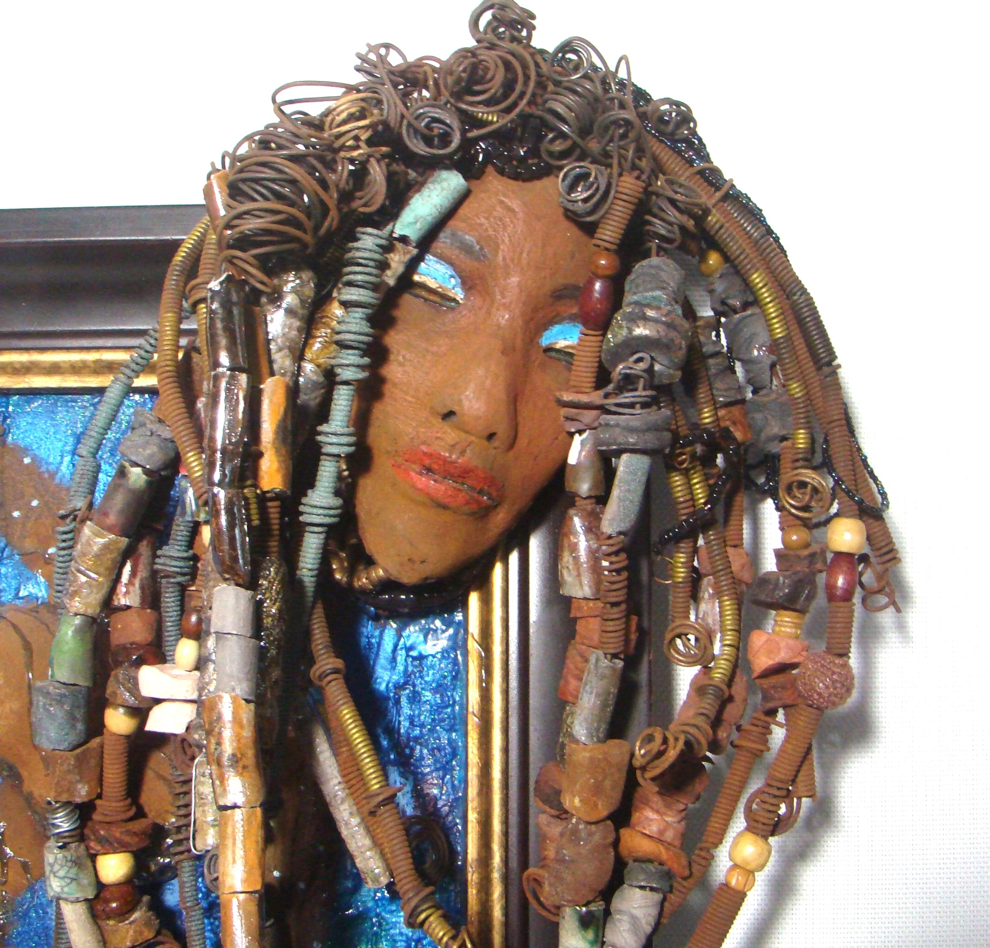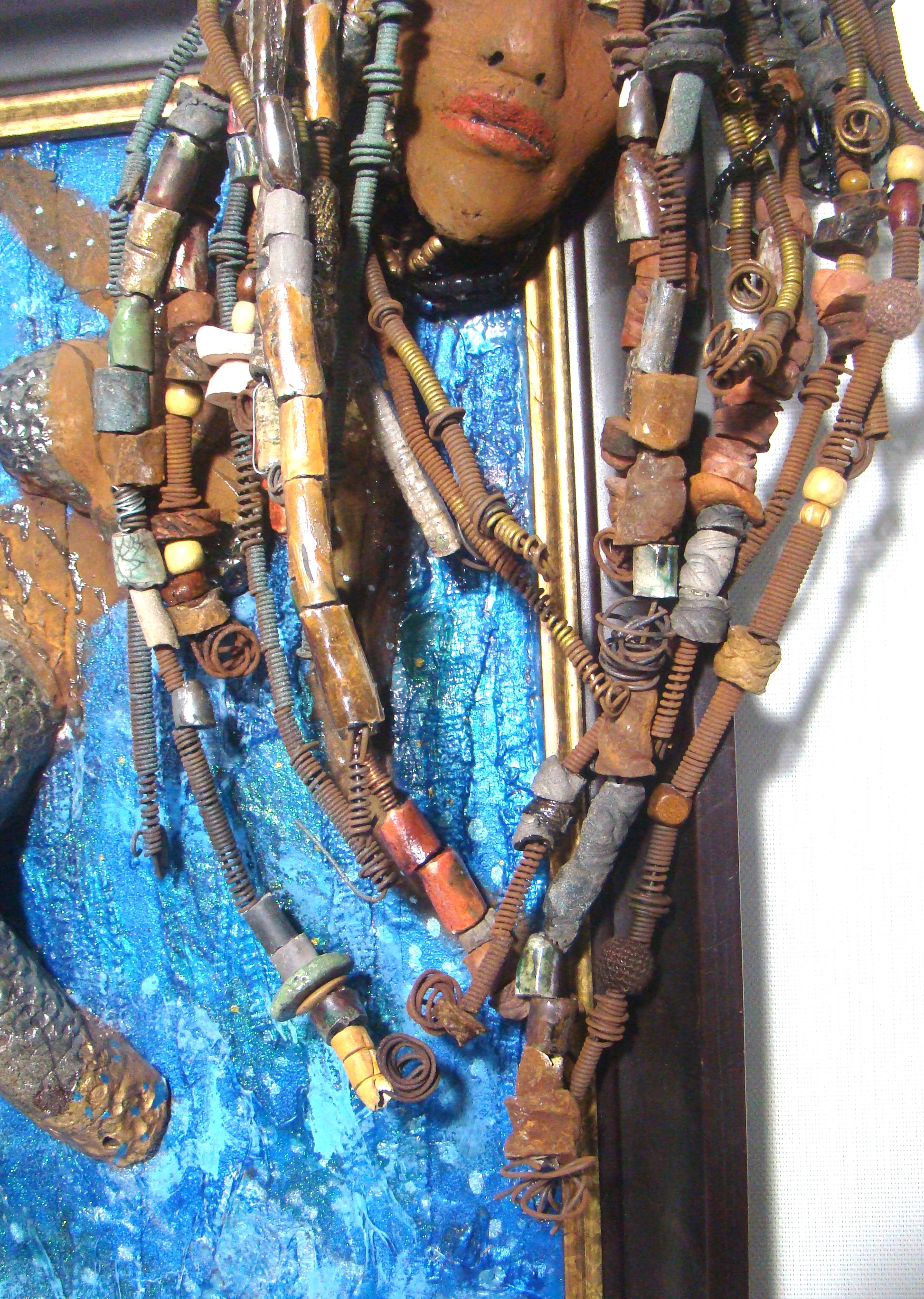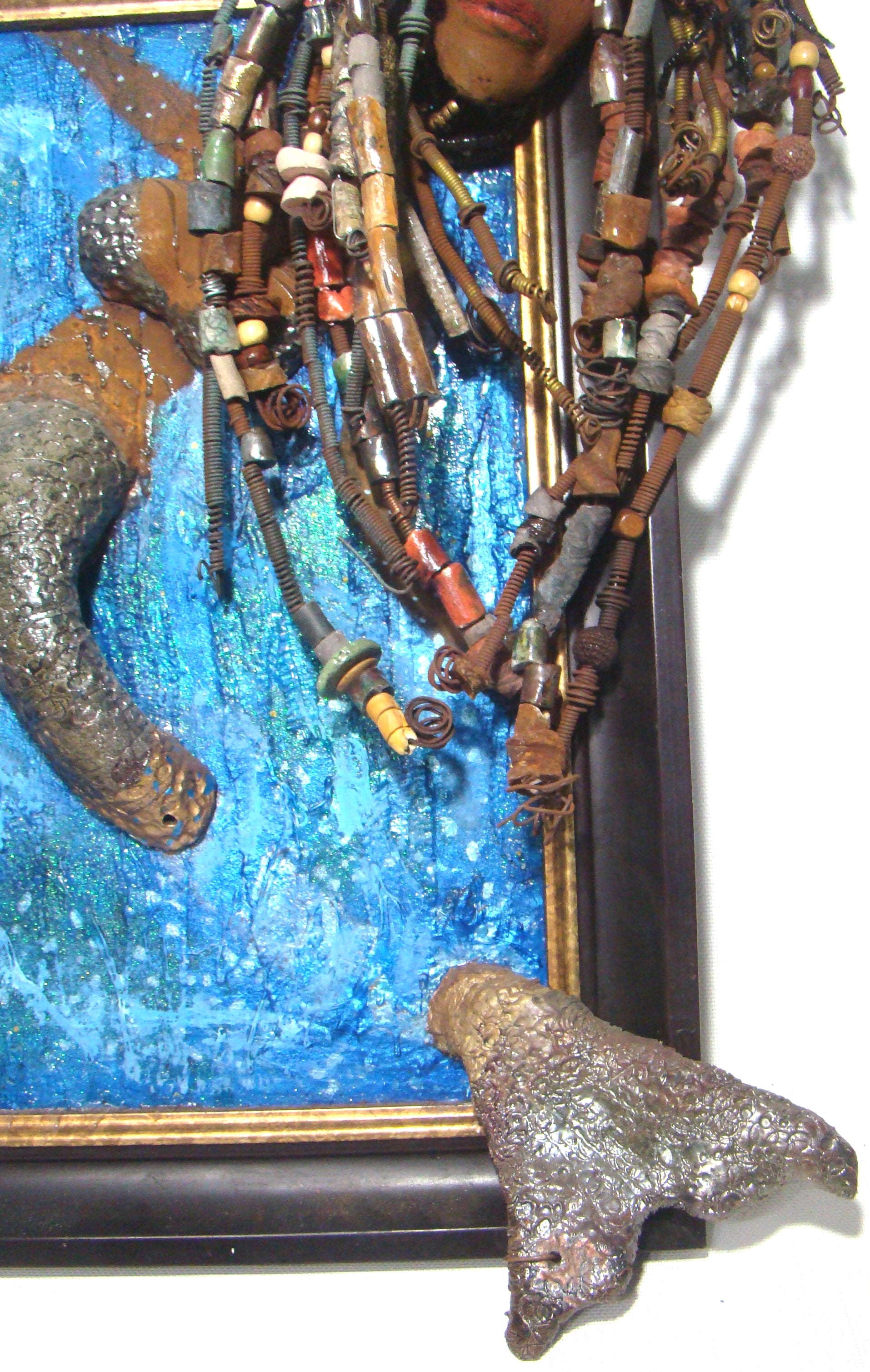 Mermaid on the Move showcases exquisite honey brown skin, accented with aqua blue eye shadow. The mermaid's swimsuit is coated in a metallic copper glaze, while her head, hair, hand, and tail extend beyond the frame. With over 75 raku beads and 25 feet of curly wire hair, this piece is truly a work of art.