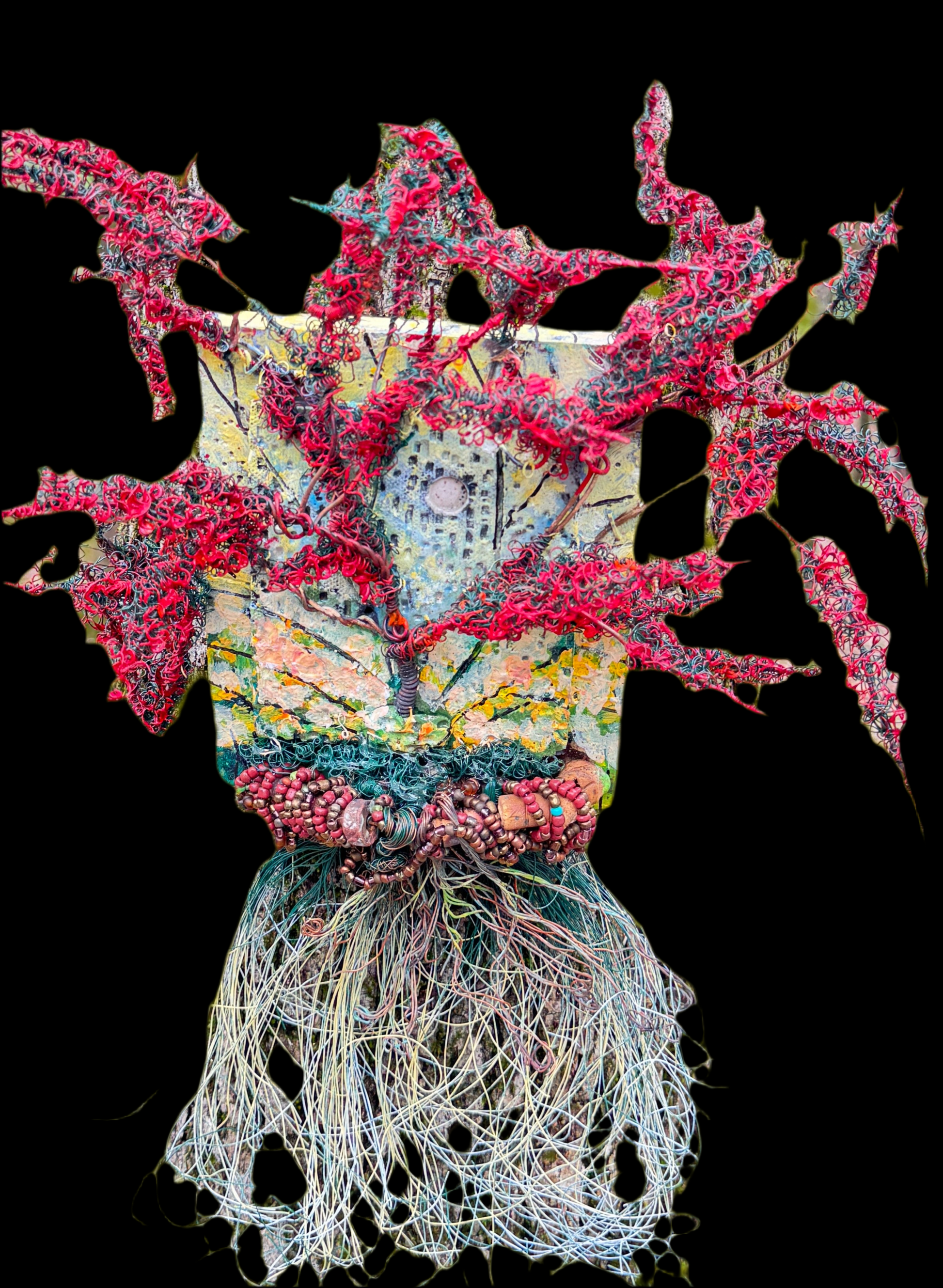 Chrisom Crown is a unique mixed media landscape, measuring 17 inches in height and 15 inches in width. The piece features a combination of 16 and 24 gauge wire, along with handmade Raku fire beads. It also includes a RAKU fired and hand painted texture tile mounted on a 7" x 5" wood base. The sun peeks through the vibrant Crimson leaves, creating the illusion of a warm summer day.