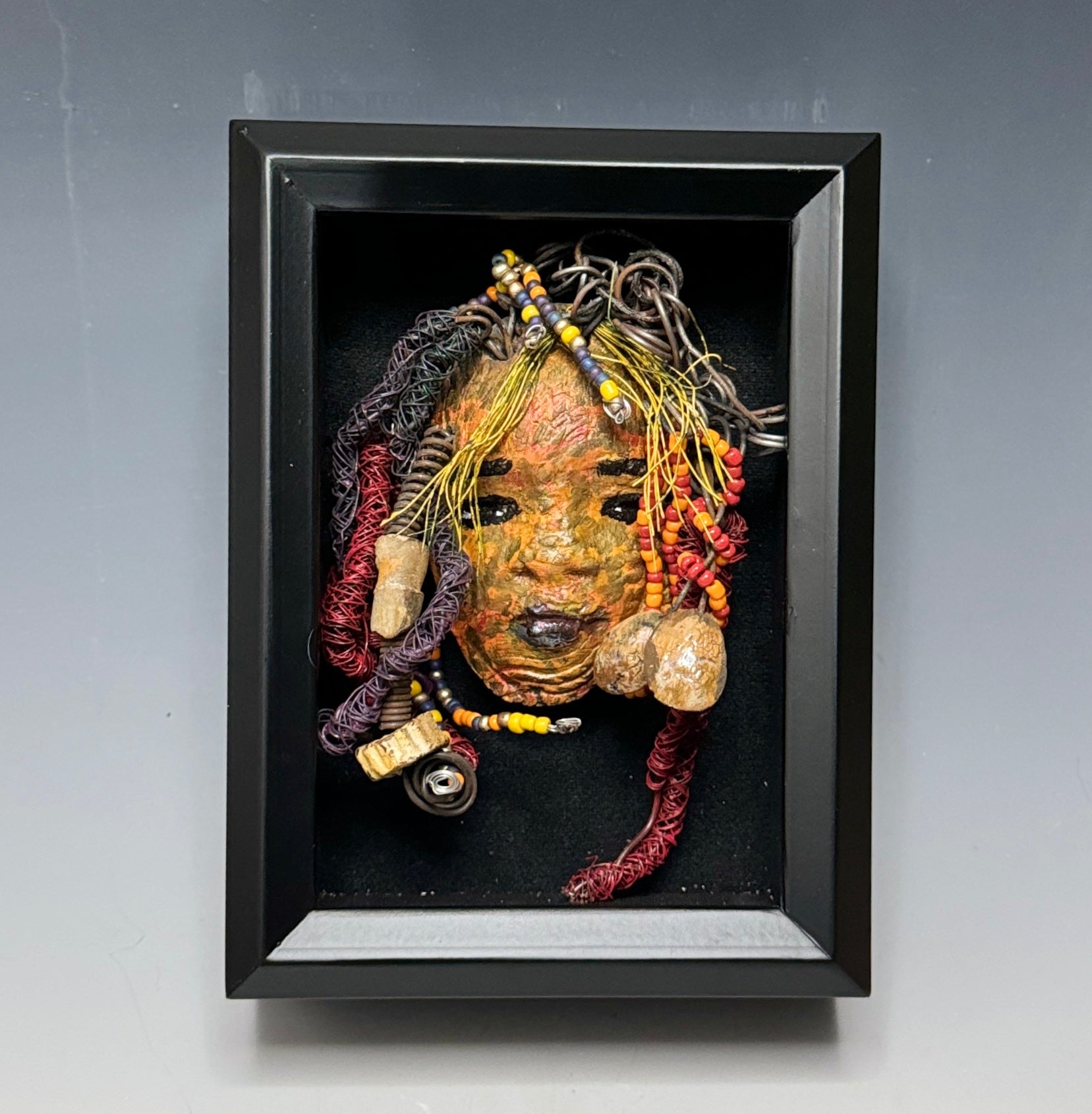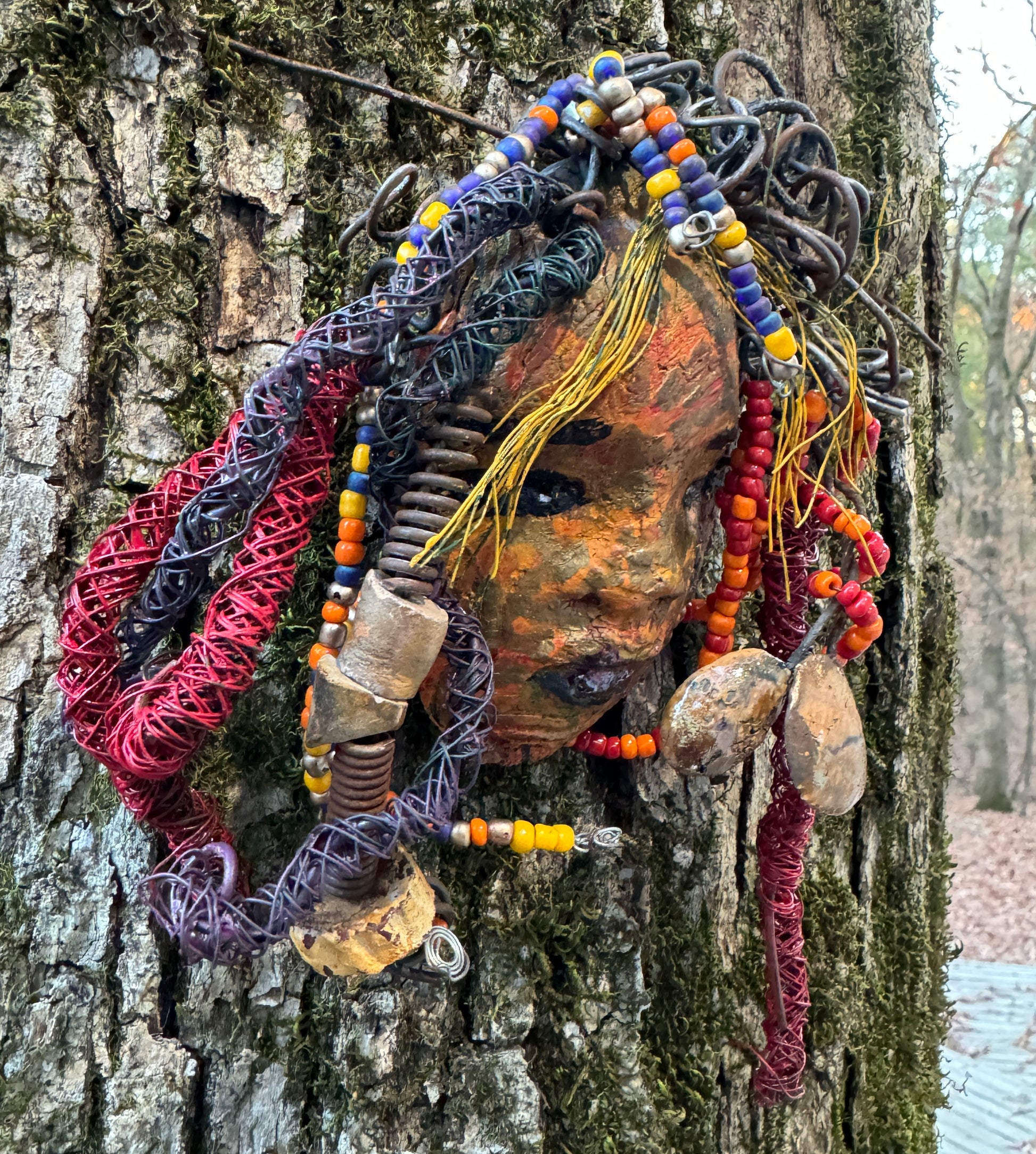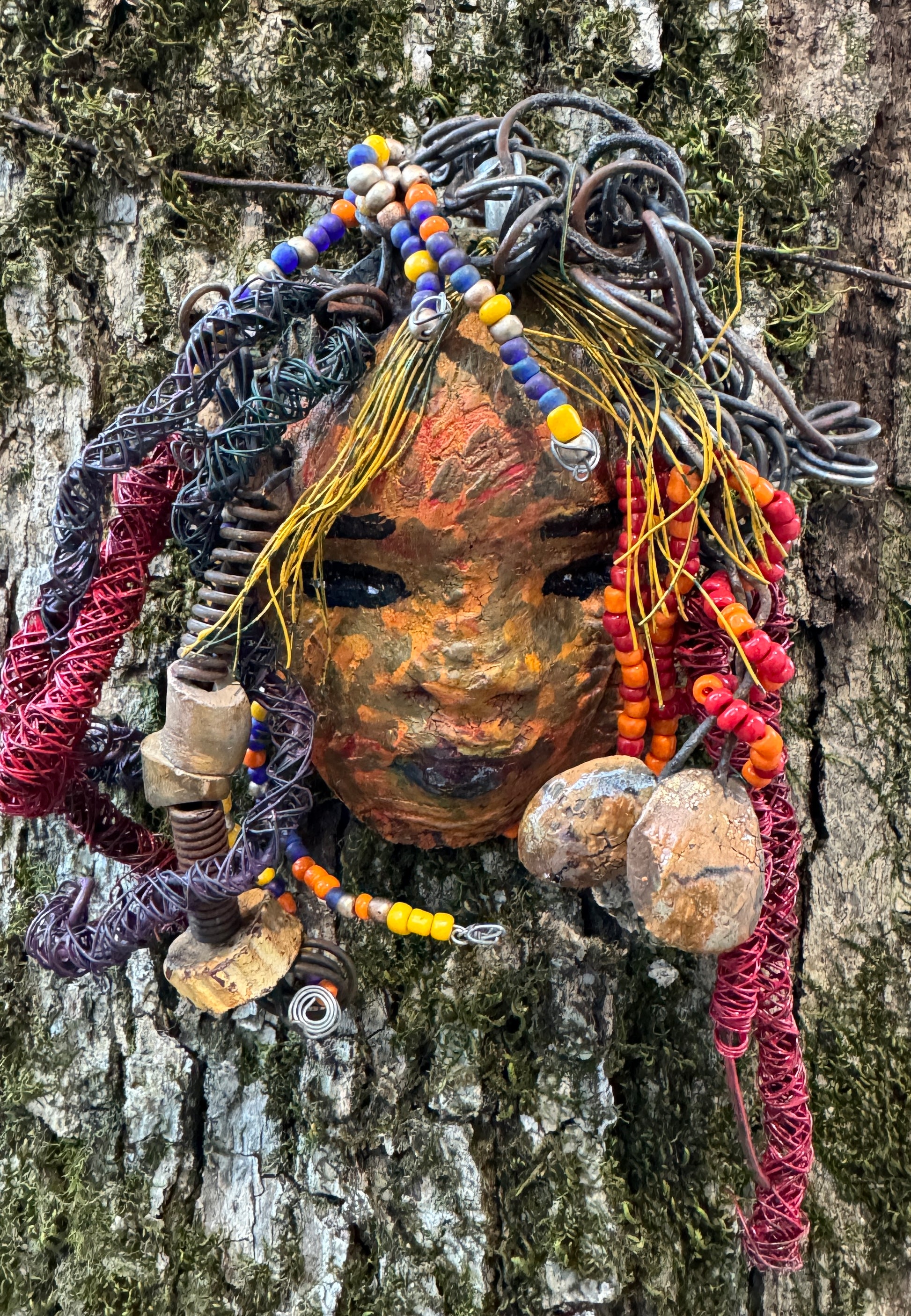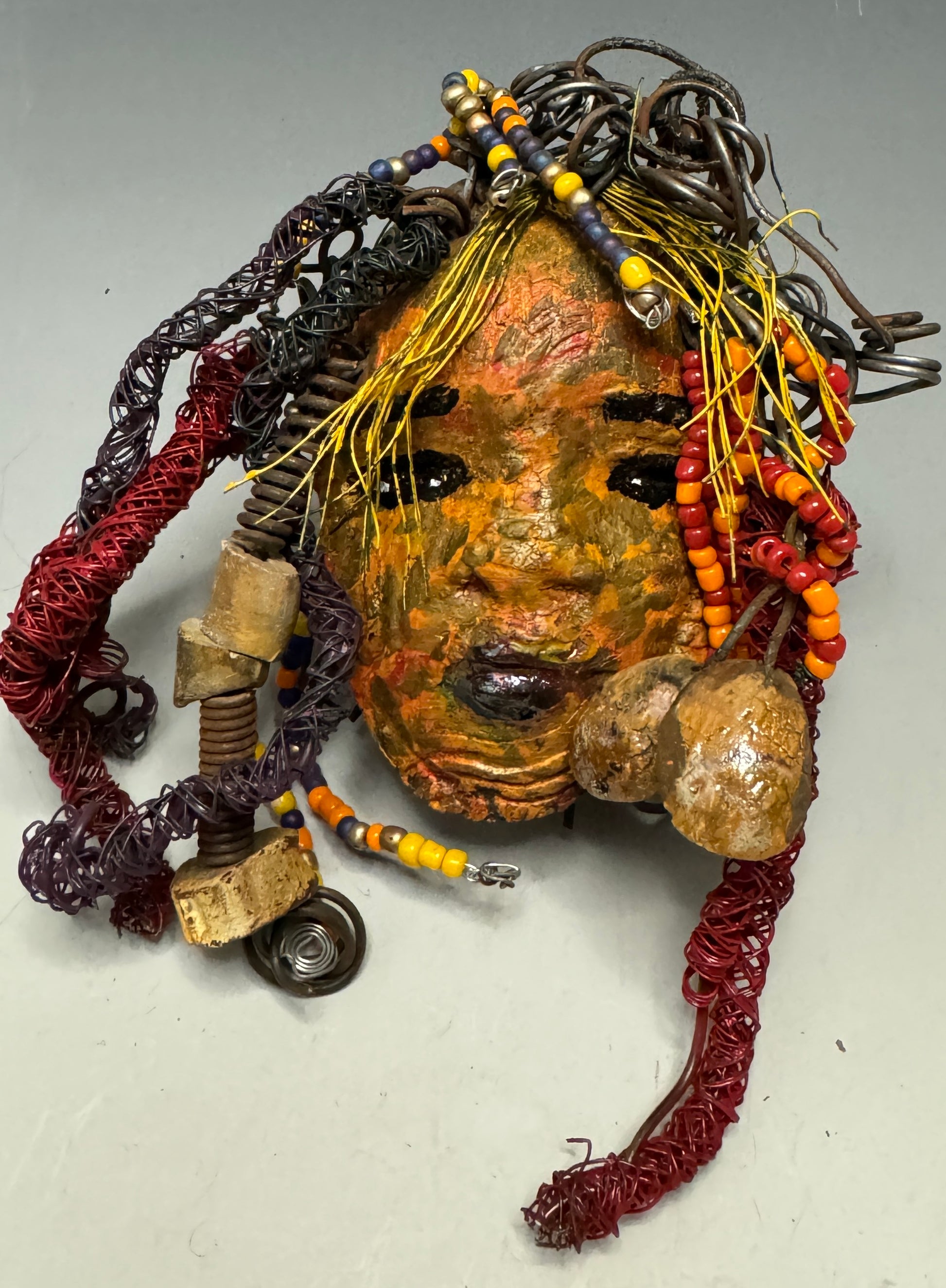Nikke is a 5” x 7” handcrafted Raku fire mask. Made of clay and wire, she is adorned with over 15' of 16/24 gauge wire for hair. Her speckled honey-brown complexion provides a unique, beautiful touch, making her an excellent holiday gift!