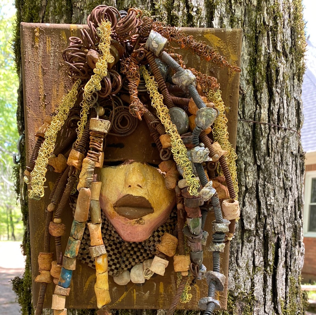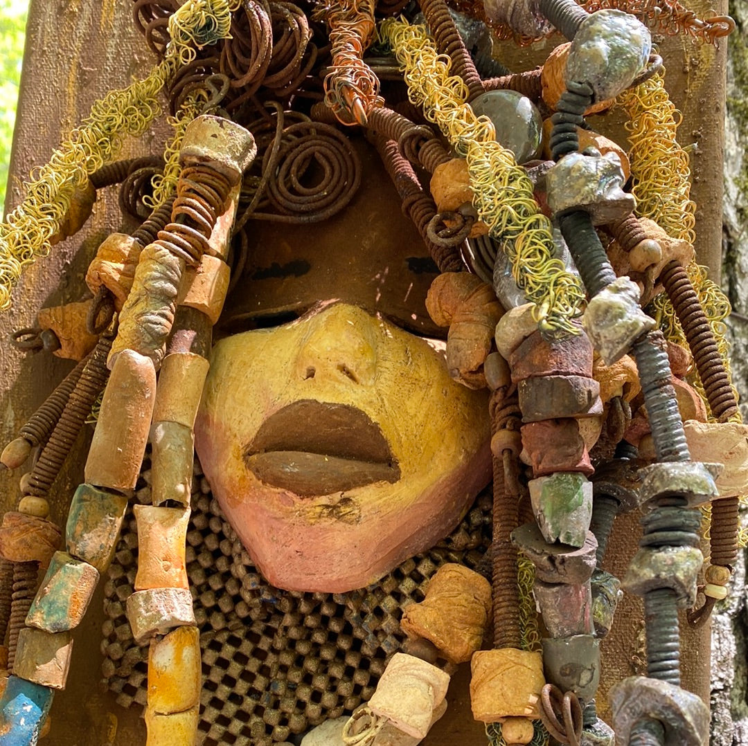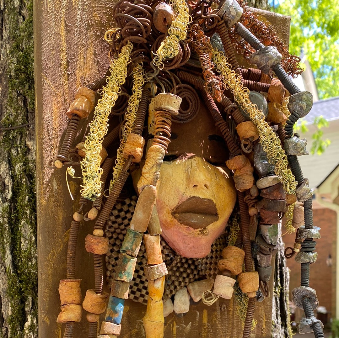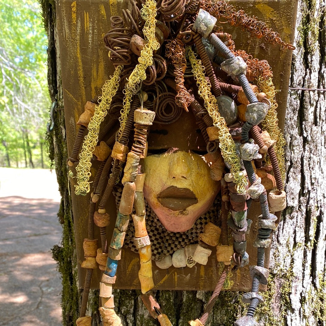 Crafting her intricate design required several hours of meticulous work, such as the placement of more than 40 feet of 16 gauge wire in her hair and the adornment of over 40 raku beads. She has an amber and brown crackle face with rust brown lips and is ready to be hung up. In case of any questions, feel free to chat with me directly. Plus, shipping is free!
